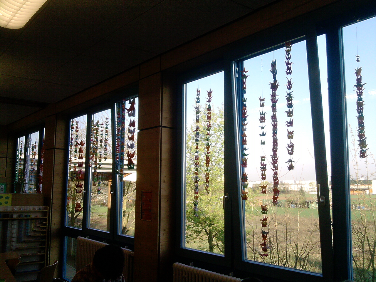 Wir begannen nun Kraniche zu falten. Zunächst wollten wir diese nach Hiroshima schicken, als Zeichen der Solidarität, da wir selbst nicht daran dachten, über 1000 Kraniche zu schaffen.