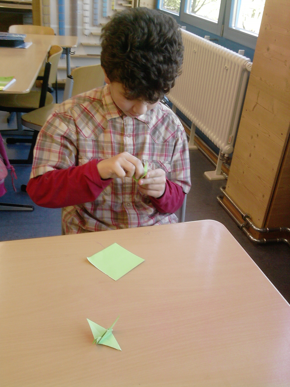 Doch die Kinder waren bald eifrig dabei in den Pausen und zuhause Kraniche zu falten, ja die gesamte Familie wurde eingespannt. Auch Wiebke Meyer von der Praxis Neuffer, die als Integrationskraft in unserer Klasse arbeitet, begann uns zu unterstützen.