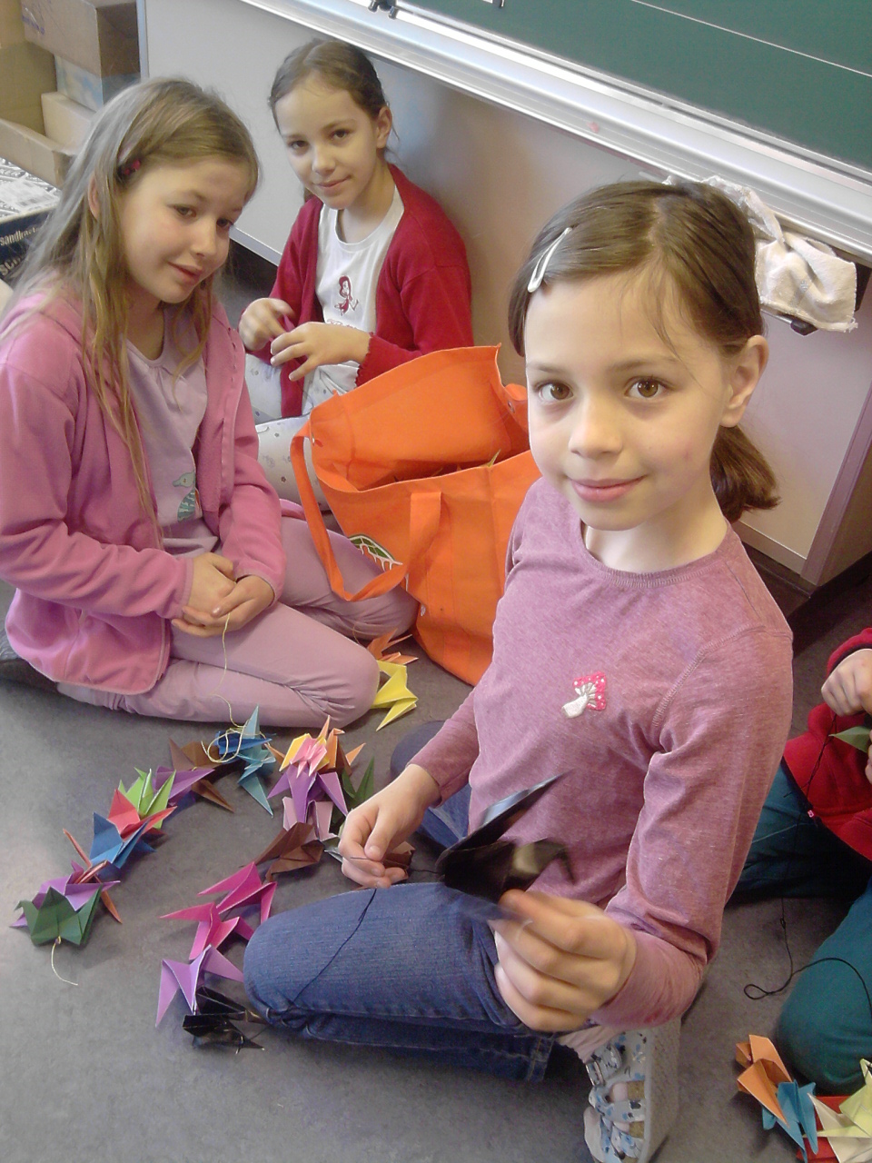 Im Klassenrat hatten die Kinder viele Fragen rund um die Atomkraft und deren Auswirkungen, weshalb ich beschloss, die Geschichte von Sadako zu erzählen und parallelen zu den aktuellen Geschehnissen in Fukushima zu ziehen. Die Kinder waren sehr betroffen und schnell stellten sie die Frage in den Raum: „Wie können WIR helfen?“