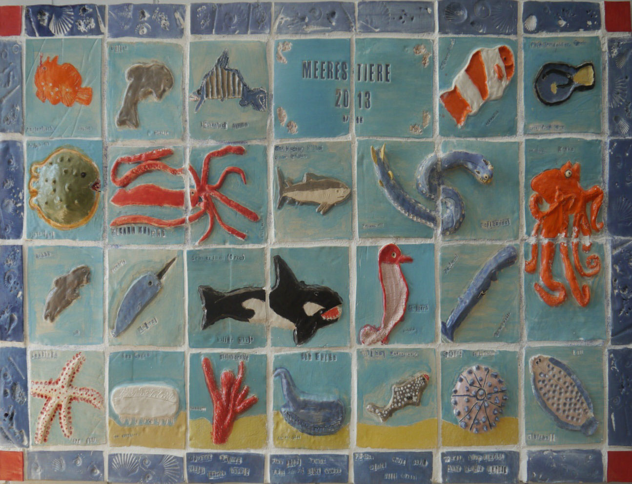 Im Schuljahr 2012/13 wurde in der Klasse 3/4a im Rahmen eines Teamteaching-Projektes ein Wandmosaik getont und zum Thema Meerestiere geforscht. Jedes Kind gestaltete eine Tonplatte mit einem Meerestier. Einige Kinder schlossen sich zusammen und entschieden sich dazu, ein Tier gemeinsam über zwei Tonplatten zu bearbeiten.