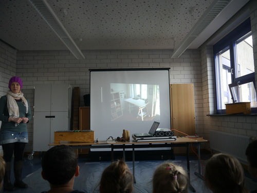 Am ersten Tag stellte sich Jenny Brosinski erst einmal vor und zeigte uns ihren Arbeitsplatz in Berlin und Ihre Malerutensilien. Sie erzählte uns auch, wie schwer es doch ist, vor einem weißen Blatt Papier zu sitzen. Oft fällt ihr dann nichts ein und dann muss sie eine Tasse Tee trinken und dann noch eine und dann sogar noch eine dritte Tasse Tee. Und schließlich malt sie dann eine Tasse Tee und dann malt sie sogar mit Tee. Aber manchmal klappt es dann doch mit den Ideen. Jenny zeigte sie uns, und zwar Buchillustrationen.