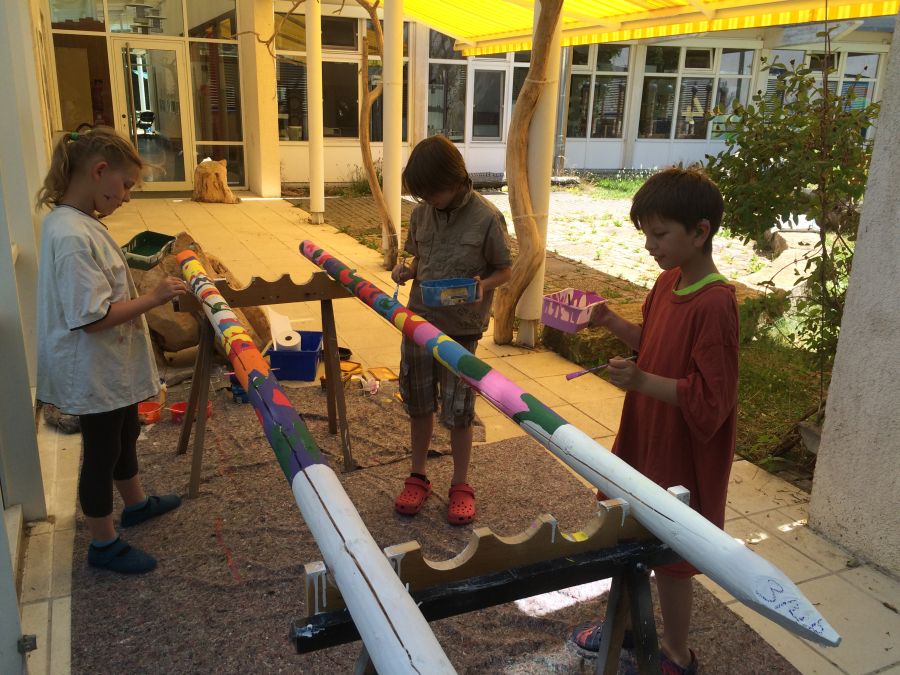 Unser Schulhof soll noch schöner werden. Deshalb bemalen Kinder aus allen Klassen Holzpfähle nach ihren eigenen Entwürfen. Diese sollen dann am Zaun des Schulhofs entlang aufgestellt werden und dem Einblick auf unseren Pausenhof Farbe verleihen. Entwürfe dafür haben alle 180 Schülerinnen und Schüler gemacht. Aus jeder Klasse werden zwei Entwürfe auf die Holzpfähle übertragen. Welche das sind, das entschieden die Klassen selber in einer klasseninternen Wahl. Unser Hausmeister, Dieter Berberich, baute eine geschickte Konstruktion, in die die Holzpfähle zum Bemalen hineingelegt und ganz praktisch beim Bearbeiten gedreht werden können. Die Leitung des Projekts liegt ganz in den Händen unserer pädagogischen Assistentin, Christina Moderau. Wir alle sind auf das Endergebnis gespannt.