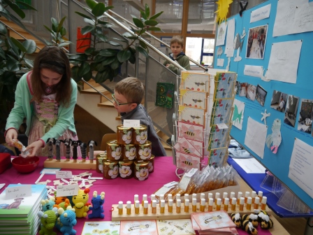 Während sich die Kinder kreativ betätigten oder im Außenbereich spielten, hatten die Eltern Zeit, die Informations- und Verkaufsstände zu besuchen. Das Angebot reichte vom Verkaufstand der Maria-Montessori-Schule mit selbst gemachtem Honig, Keramikartikeln, Literatur bis hin zum Schulshop mit Büroartikeln des Fördervereins. Im Außenbereich befand sich ein ansprechender Verkaufsstand mit textilen Handarbeiten.