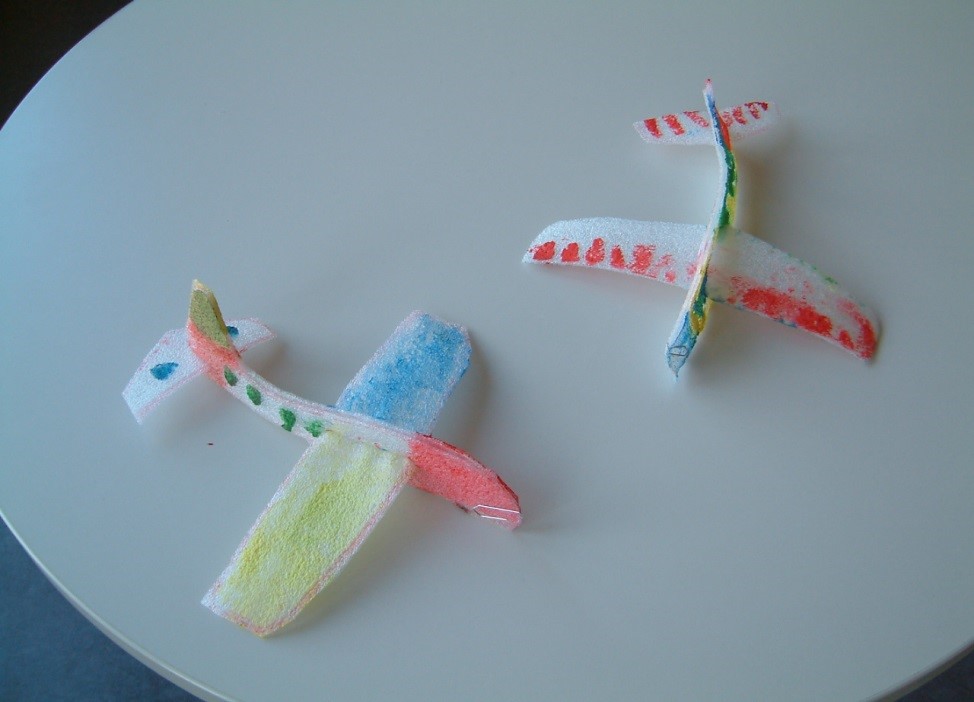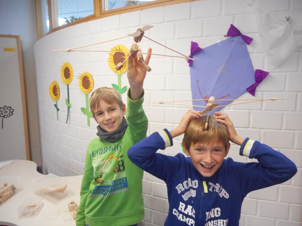 Andere Flieger wurden aus Trittschutzmatten mit Inge vom Grafen gebaut und gestaltet. Die Frage war natürlich „welcher Flieger gleitet am längsten durch den Raum?“ Und „Wie muss ich meine Flügel verstellen, dass mein Flieger weiter als der andere fliegt?“