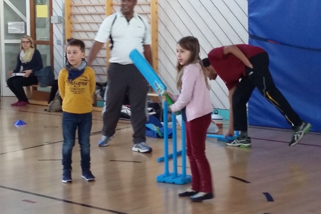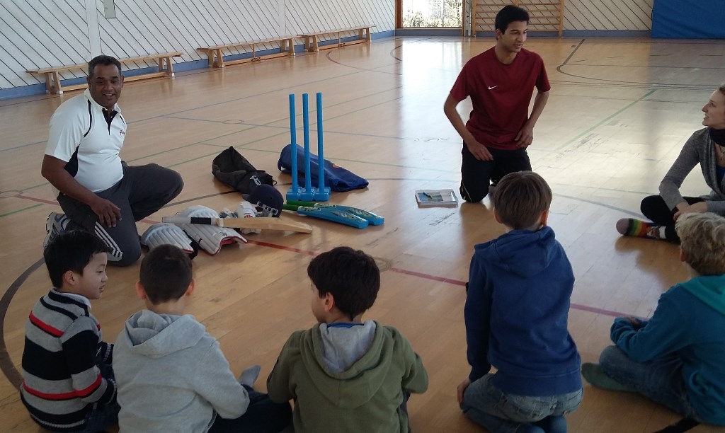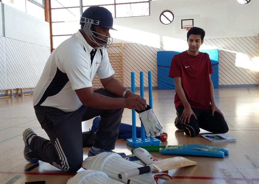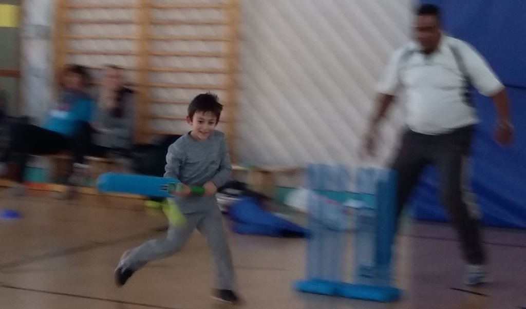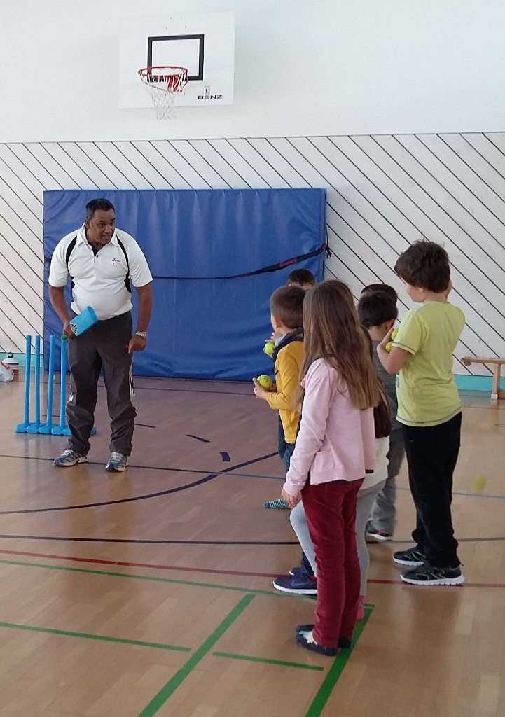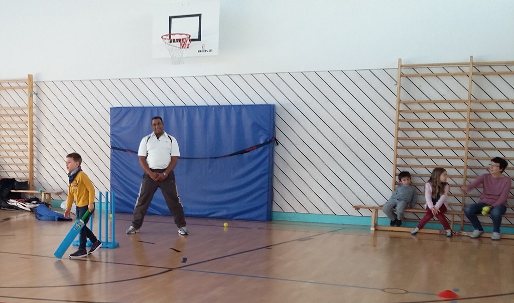„Als wir am letzten Donnerstag zur ersten Cricket-Stunde erschienen, waren wir schon sehr gespannt darauf, ob die Kinder sich überhaupt für diese Sportart interessieren. Schließlich hatten die meisten von Cricket bestimmt noch nie gehört. Aber offenbar waren sie genauso gespannt wie wir und freuten sich darauf, etwas Unbekanntes auszuprobieren. Jedenfalls kamen alle ganz erwartungsvoll mit zur Sporthalle und waren dann ganz fasziniert, als wir unsere Ausrüstung – die für das Kindertraining sowie unsere professionelle – auspackten und herumgehen ließen. Helm, Beinschützer und das Bat aus englischer Weide hatten es ihnen sofort angetan. Die Kinder waren sehr interessiert und wollten genau wissen, wie das alles benützt wird. Ganz schnell landeten wir so nach einer kurzen Aufwärmphase bei der Praxis und übten das Schlagen, das sogenannte Batting. Jede/r kam an die Reihe und alle waren mit Begeisterung dabei. Und es klappte nach ein paar Übungsschlägen richtig gut! Die Stunde war im Nu zu Ende. Mein Fazit: es hat großen Spaß gemacht -uns und nach meinem Eindruck auch den Kindern. Wir freuen uns schon auf das nächste Mal.“