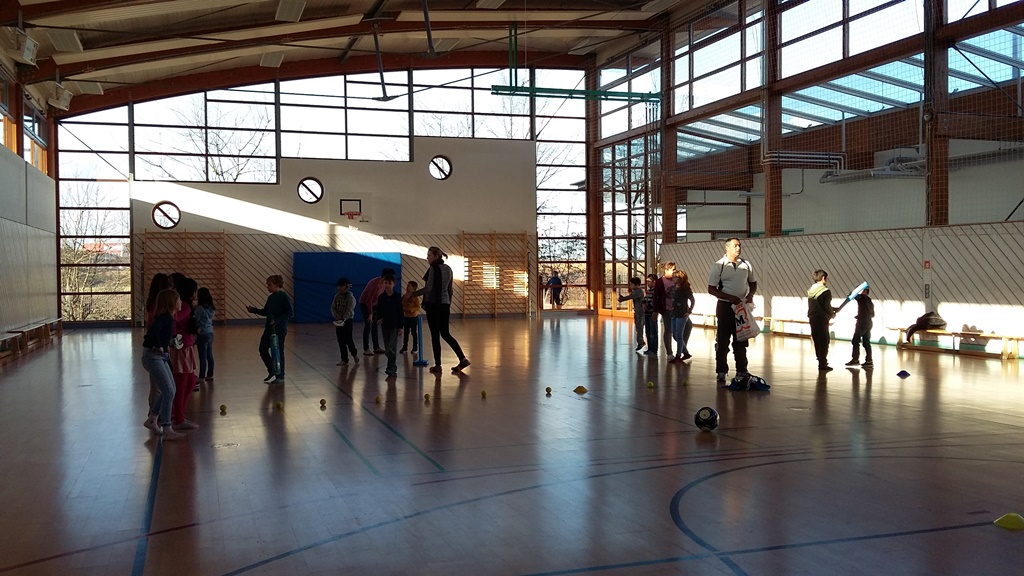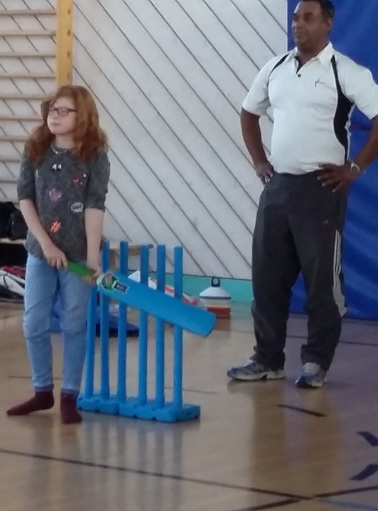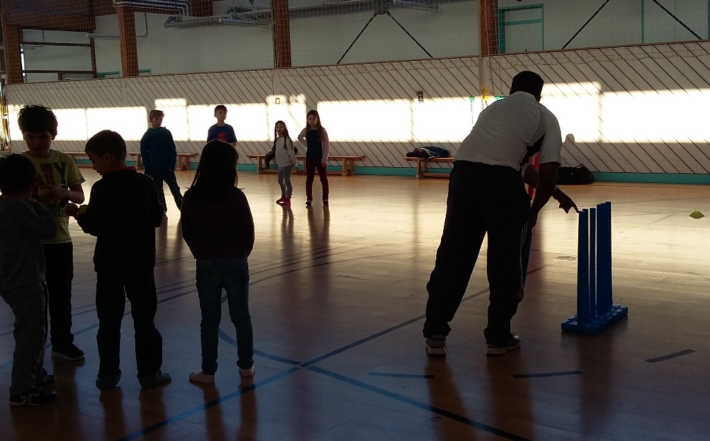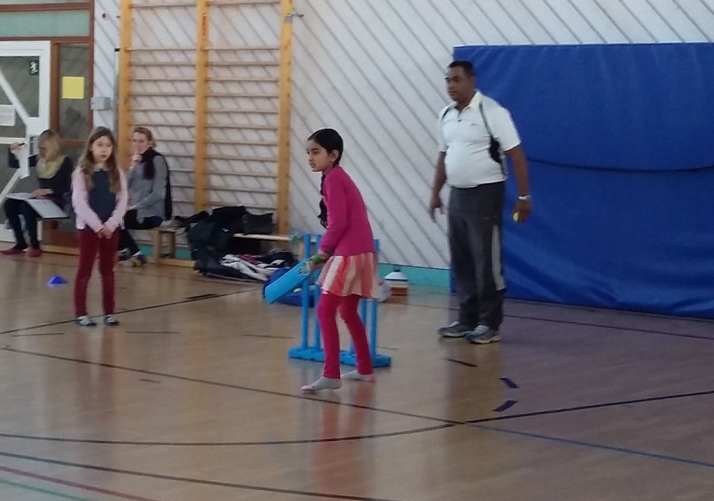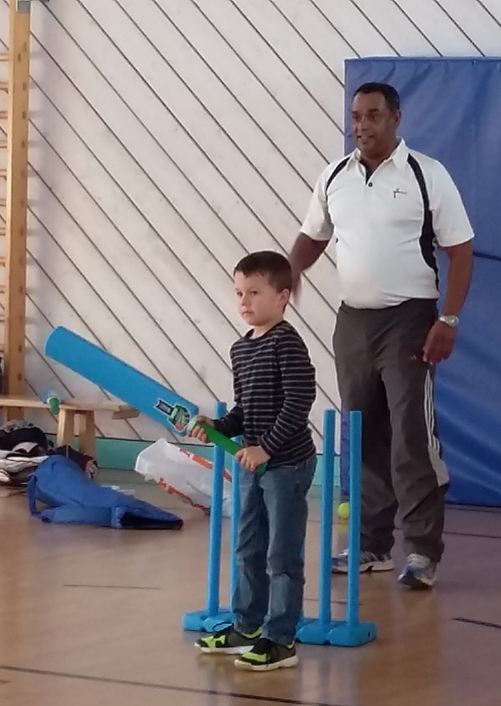 „Als wir am letzten Donnerstag zur ersten Cricket-Stunde erschienen, waren wir schon sehr gespannt darauf, ob die Kinder sich überhaupt für diese Sportart interessieren. Schließlich hatten die meisten von Cricket bestimmt noch nie gehört. Aber offenbar waren sie genauso gespannt wie wir und freuten sich darauf, etwas Unbekanntes auszuprobieren. Jedenfalls kamen alle ganz erwartungsvoll mit zur Sporthalle und waren dann ganz fasziniert, als wir unsere Ausrüstung – die für das Kindertraining sowie unsere professionelle – auspackten und herumgehen ließen. Helm, Beinschützer und das Bat aus englischer Weide hatten es ihnen sofort angetan. Die Kinder waren sehr interessiert und wollten genau wissen, wie das alles benützt wird. Ganz schnell landeten wir so nach einer kurzen Aufwärmphase bei der Praxis und übten das Schlagen, das sogenannte Batting. Jede/r kam an die Reihe und alle waren mit Begeisterung dabei. Und es klappte nach ein paar Übungsschlägen richtig gut! Die Stunde war im Nu zu Ende. Mein Fazit: es hat großen Spaß gemacht -uns und nach meinem Eindruck auch den Kindern. Wir freuen uns schon auf das nächste Mal.“