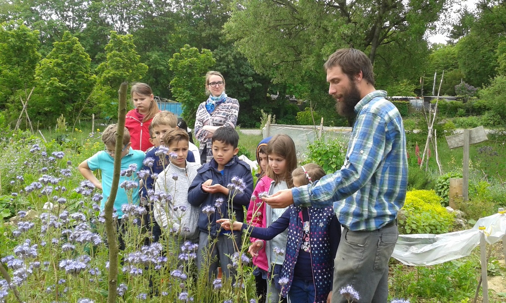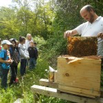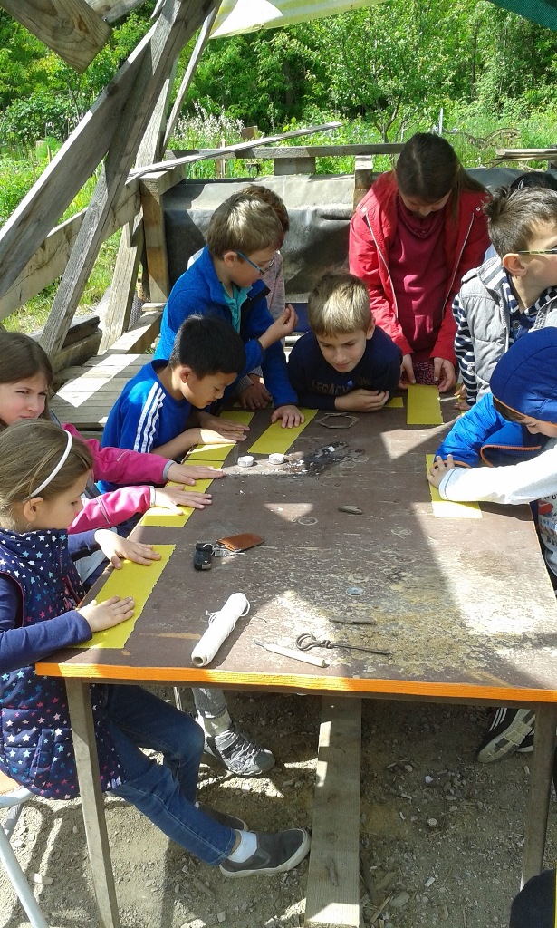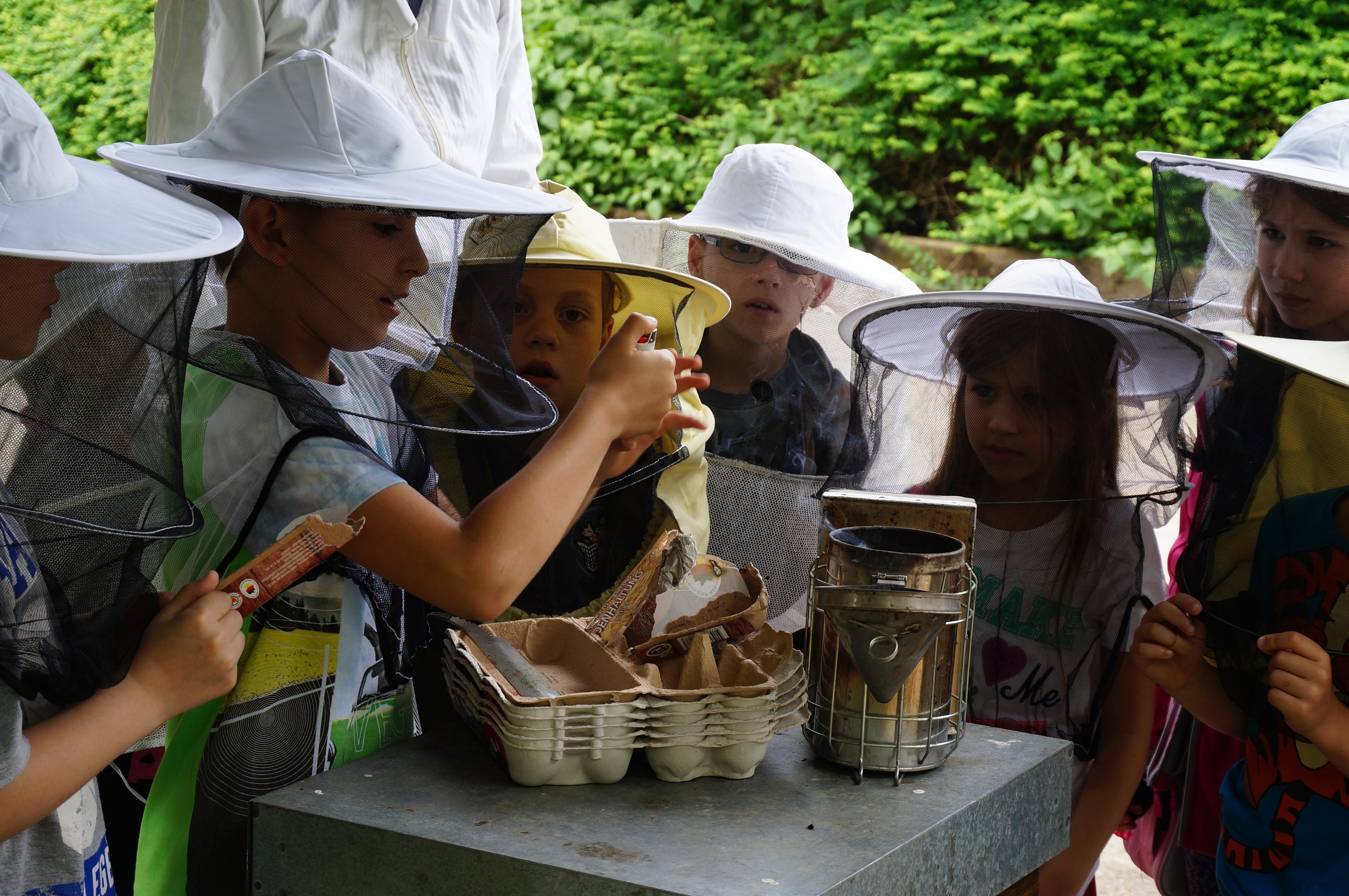 Bei der Imkerei Summtgart gab es am Freitag, den 20.05. für 20 Kinder viel zu entdecken! Mehrere Standorte gehören zur Imkerei. Der Ausflug ging zu einem kleinen idyllisch gelegenen Garten bei den Wagenhallen. Hier sammeln die Bienen zwischen Wohnwägen, kleinen Beeten und unberührter Natur den Nektar und die Pollen. Die Tour startete unter einem, aus Holzlatten selbst zusammengeschusterten Unterschlupf, der auch Sitzmöglichkeiten integrierte. Hier wurden die Kinder in zwei Gruppen aufgeteilt. Die eine Gruppe erhielt eine Wachsplatte und erfuhr, wie Bienen ihre Waben herstellen. Aus der Wachsplatte formte jedes Kind anschließend eine kleine Kerze, die mit nach Hause genommen werden durfte. Die zweite Gruppe lief in dieser Zeit durch die kleinen Beete und beobachtete die Bienen, ehe sie zu den Bienenstöcken gelangte. Dort sahen die Kinder das Heim der Bienen hautnah. Sie durften in volle Waben fassen und den herausrinnenden Honig von den Fingern lecken und eine Drohne auf die Hand nehmen. Eine Gruppe konnte sogar einen Blick auf die Königin erhaschen, die sich in der zweiten Beobachtungsgruppe leider versteckt hielt und dann nicht mehr sichtbar war. Ein seltenes Vergnügen war auch der Stock der Wildbienen, die Waben wie Orgelpfeifen wachsen ließen. Der Imker brach einige Stücke behutsam heraus und jedes Kind konnte das einmalige Erlebnis verspüren Honig aus echten Bienenwaben zu kauen.