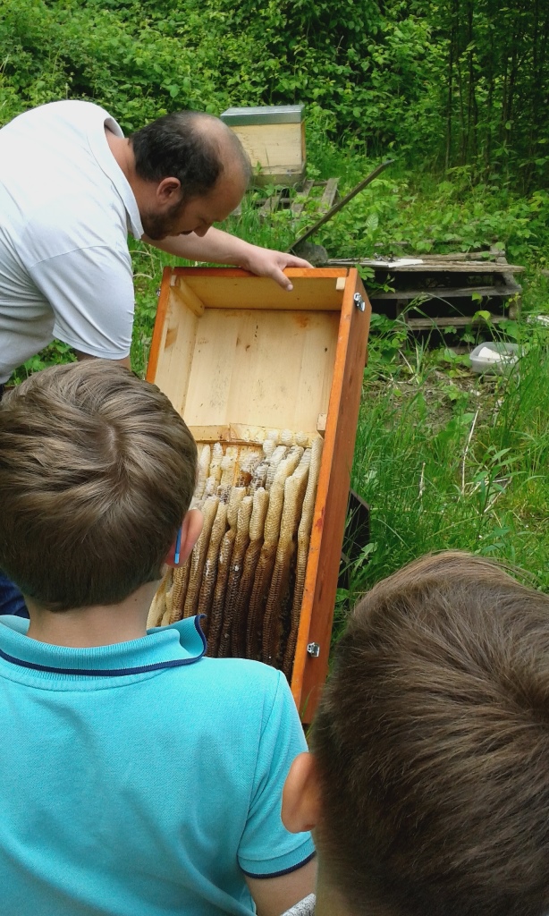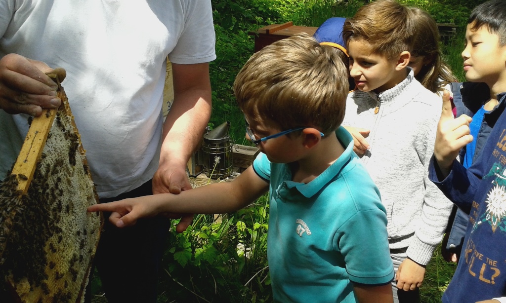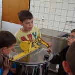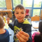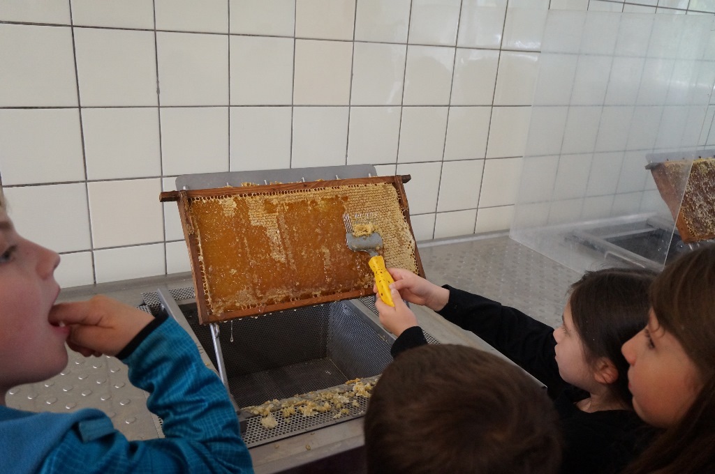 Der Besuch in der Bundesanstalt für Bienenkunde der Universität Hohenheim startete bei schönstem Wetter. Nach einer langen Fahrt mit Bus und U-Bahn hatten die Kinder noch einen kurzen Weg zu Fuß vor sich. Am Institut angekommen, wurden die Kinder in zwei Gruppen eingeteilt. Die eine Gruppe konnte schon mal in einen Bienenstock schauen. Darin waren einzelne Bienen mit Farbtupfern und Nummern markiert, um mehr über ihr Verhalten zu erkunden. Ebenso war es den Kindern möglich Honig direkt aus der Wabe zu „schlürfen“. Die zweite Gruppe begann die Führung mit Honigschleudern. Dazu öffneten die Kinder zunächst die Wabendeckel und stellten dann die geöffneten Waben in die Schleuder. Nach kräftigem Kurbeln lief der Honig aus der Schleuder heraus und die Kinder füllten den Honig in Gläser ab. Anschließend aßen die Kinder den Honig auf mitgebrachten Broten. Am Abend werden die Kinder müde und glücklich in das Wochenende entlassen.