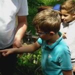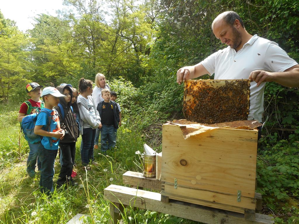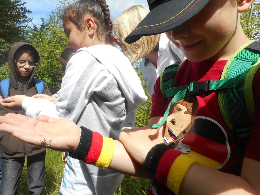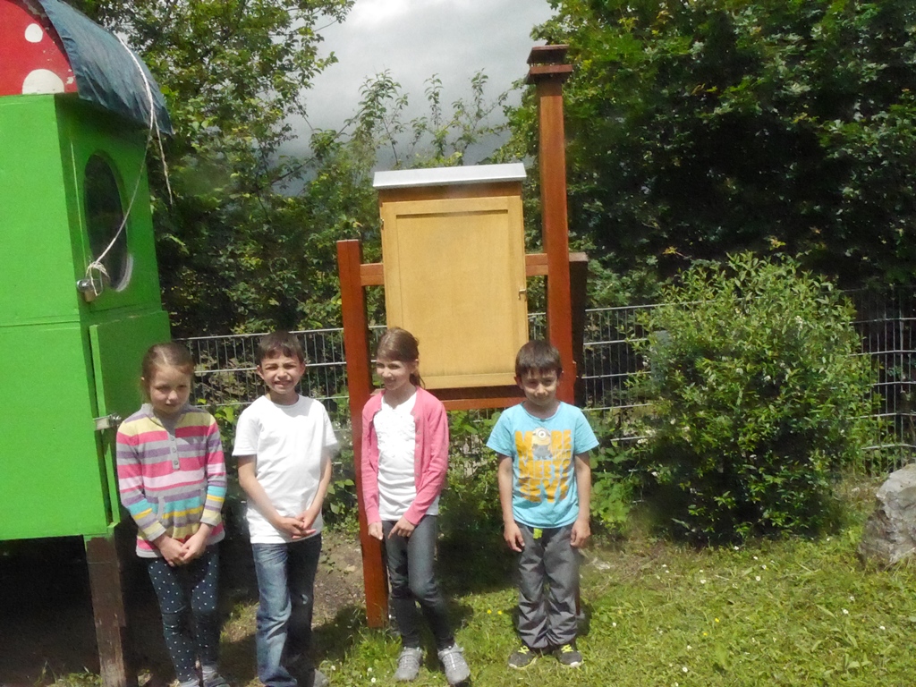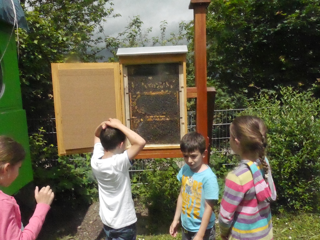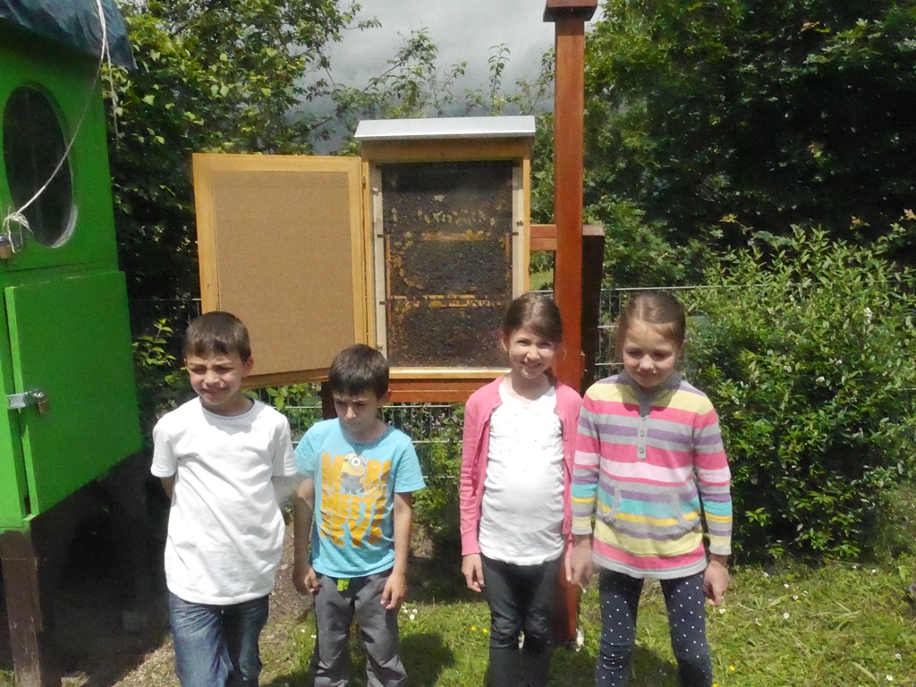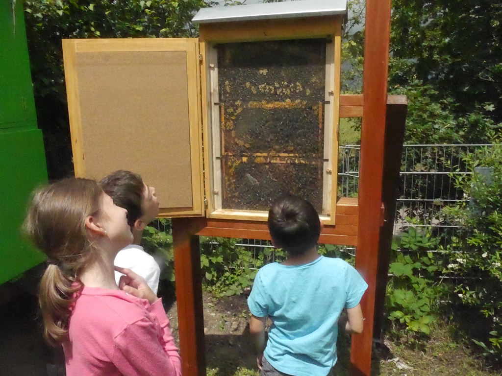 Unser Pfingstferienprogramm sah 11 verschiedene Informationsformen bzw. Ausflüge vor. Besonders erfreulich war, dass der Bienenschaukasten rechtzeitig im Tierbereich der Schule aufgestellt wurde, so dass die Kinder ihre Beobachtungen auch ‚live‘ vor Ort machen konnten. Dort beobachteten sie gerne die, mit einem blauen Punkt gekennzeichnete, Königin und die Arbeiterinnen bei der Pflege der Brut.