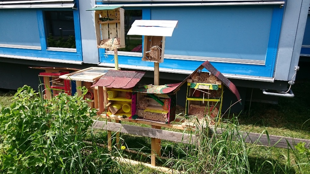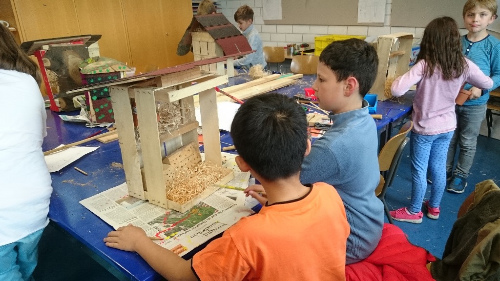 In kleiner Runde bauten die Kinder für Bienen und andere Insekten Hotels. Mit viel Einsatz und der tatkräftigen Unterstützng von Gert Fischer-Baudys haben die Kinder gesägt, gebohrt und gehämmert. In die so entstandenen „Luxuswohnungen“ vor dem Schülerhaus sind auch schon die ersten Bewohner eingezogen.
