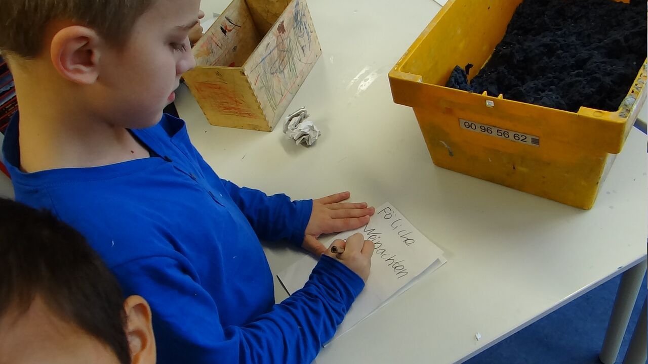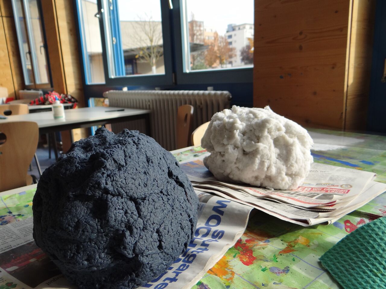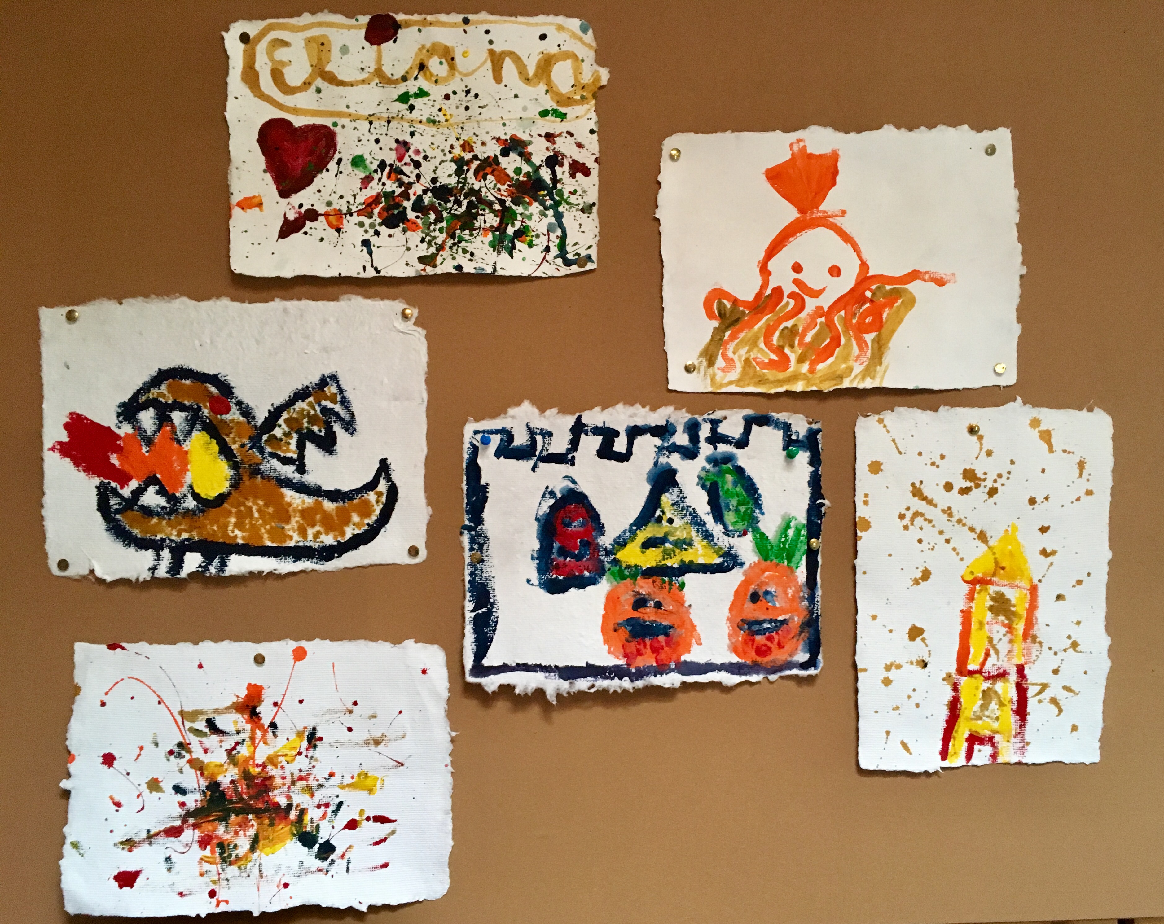 Nein, ihre Kinder machten zusammen mit dem erfolgreichen, bildenden Künstler Clemens Schneider Papier aus alten Jeans und T-Shirts. Der Künstler begeisterte uns mit seiner besonderen Art der Papierherstellung. In seinem Atelier konnten die Kinder am 31.10. nicht nur seine Kunst bestaunen, sondern auch den Weg vom Textil zum Papier verfolgen. Klein geschnittene Jeansstücke wurden in eine Maschine gelegt. Die Maschine ist wie eine Art Mühle aufgebaut. Ein Wasserbad mit den Jeansstücken rotiert darin um ein Mahlwerk. Die Textilstücke werden dabei in ihre Fasern zersetzt. Aus diesen Fasern lässt sich im Anschluss mit Hilfe eines speziellen Sieb Papiers schöpfen. So gewannen die Kinder mit Begeisterung blaues, weißes und gelbes Papier, malten darauf, banden Bücher damit ein und modellierten aus der Textilmasse kleine Figuren.