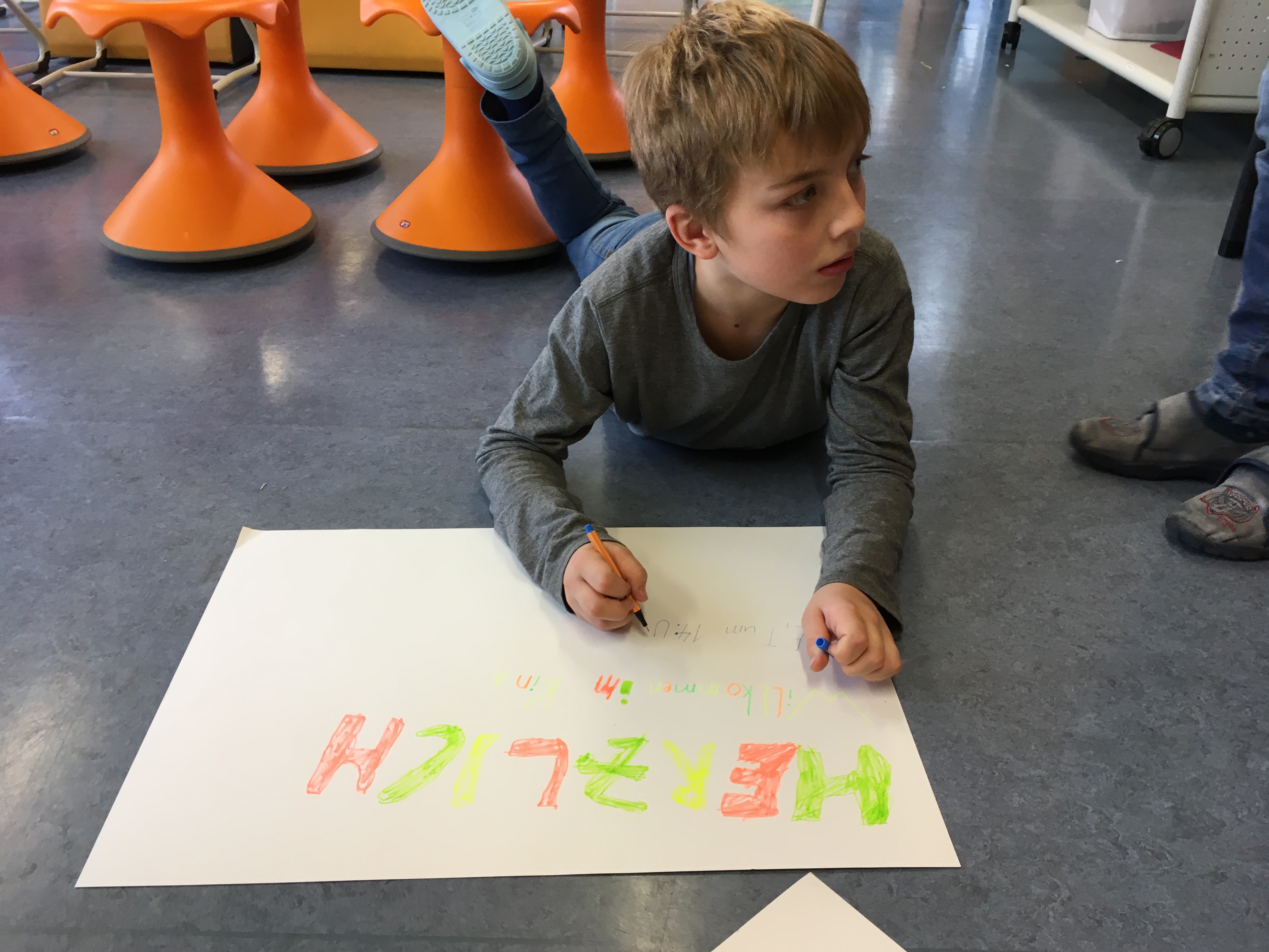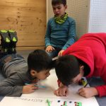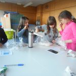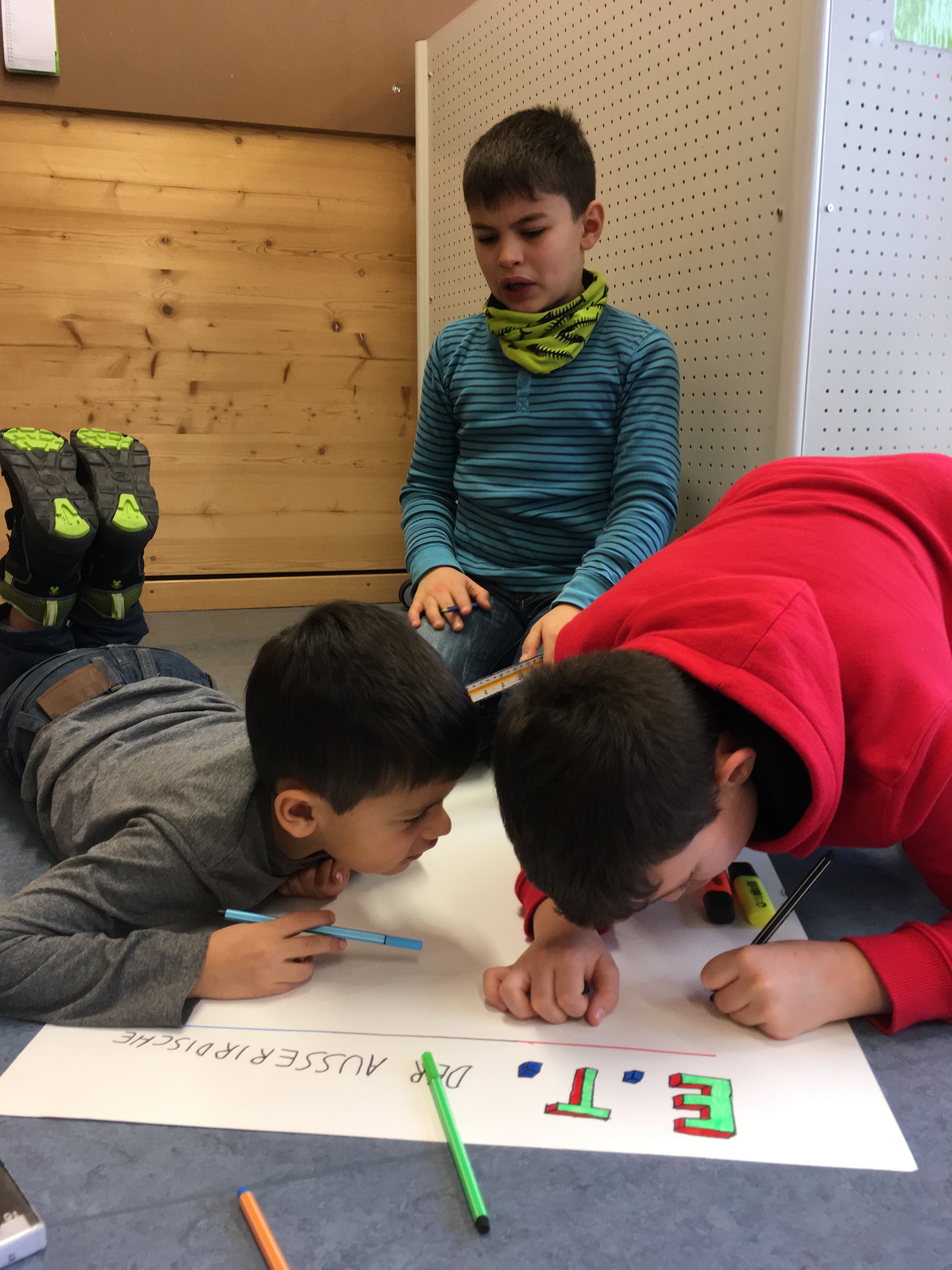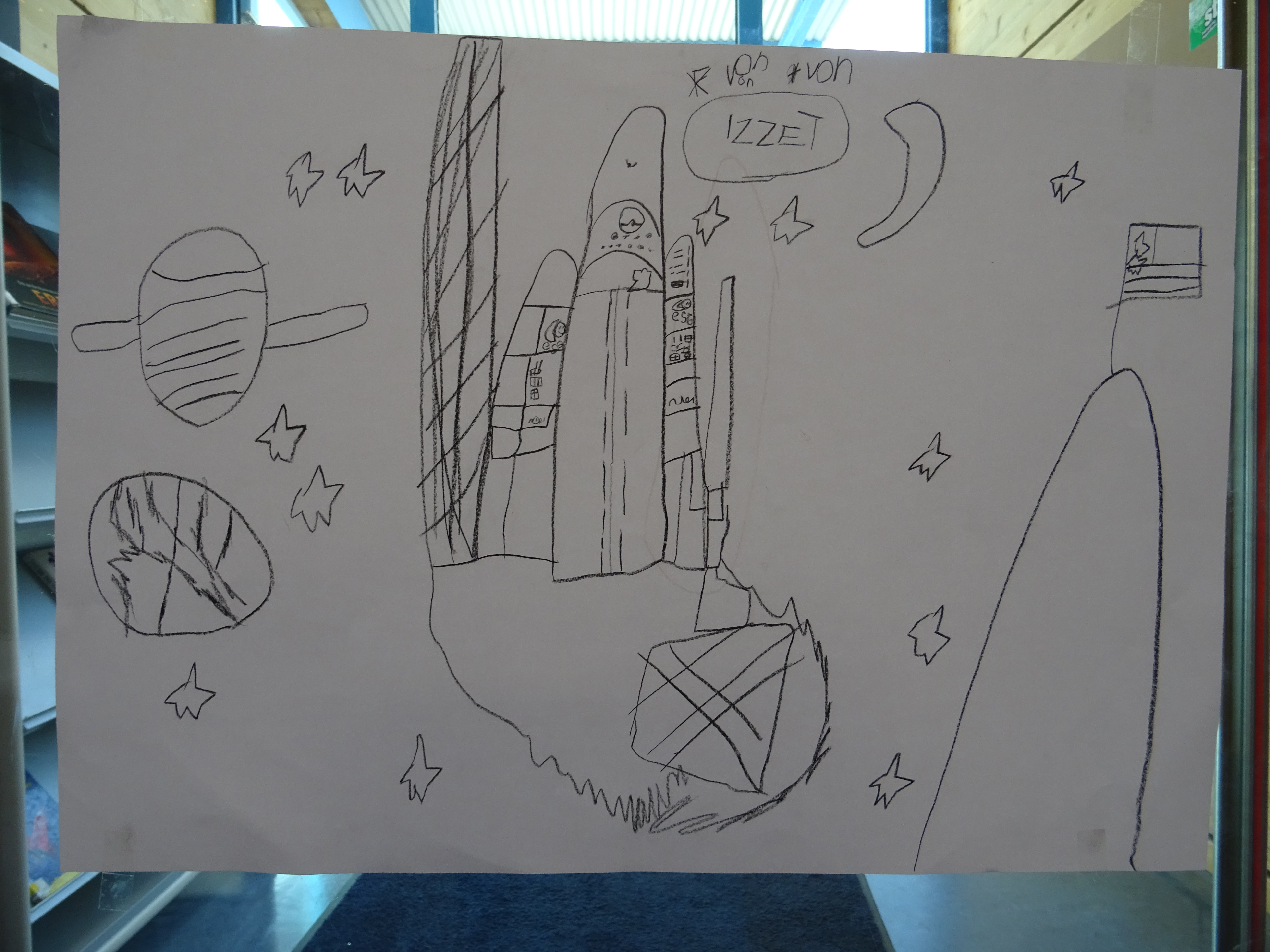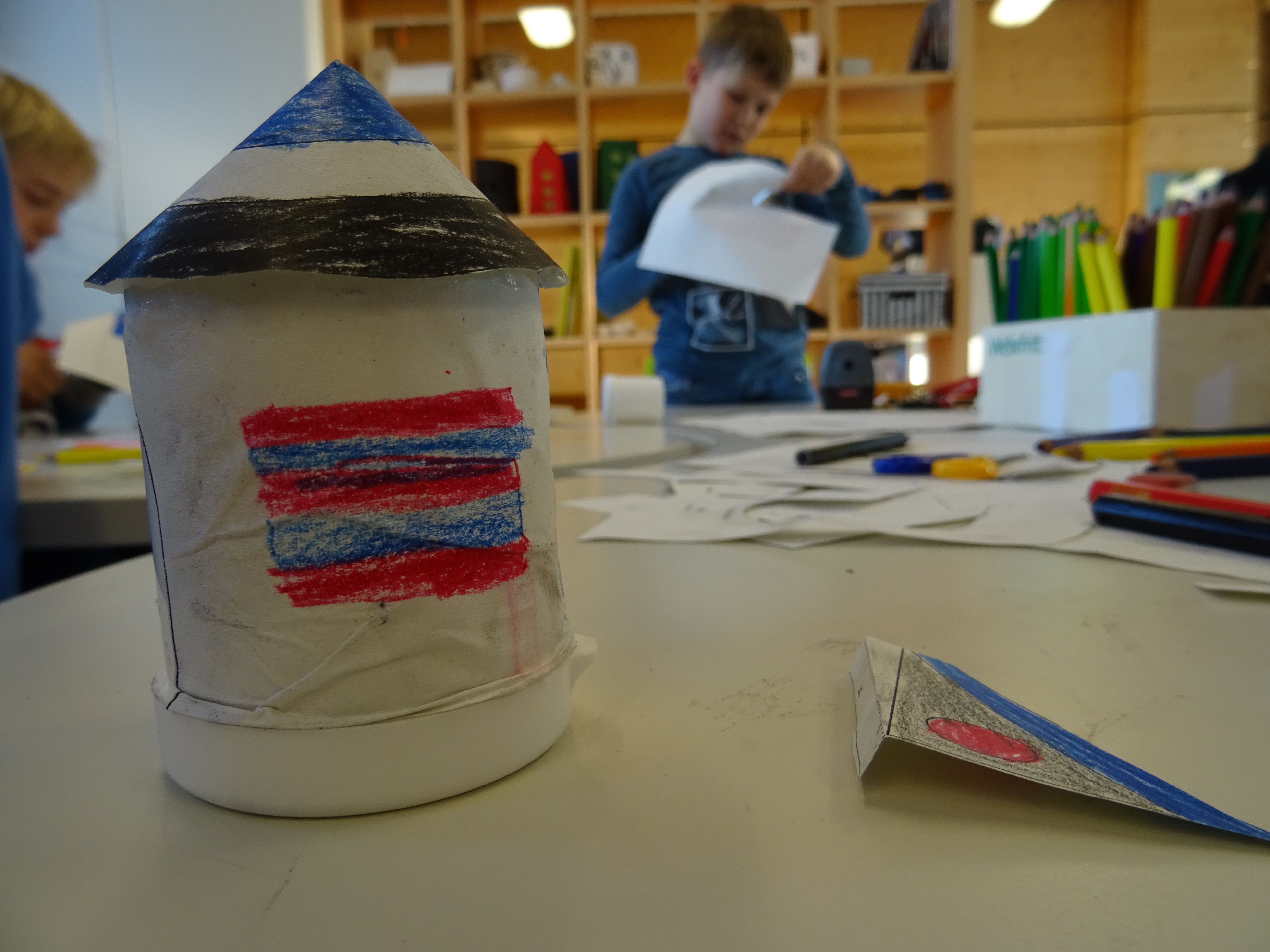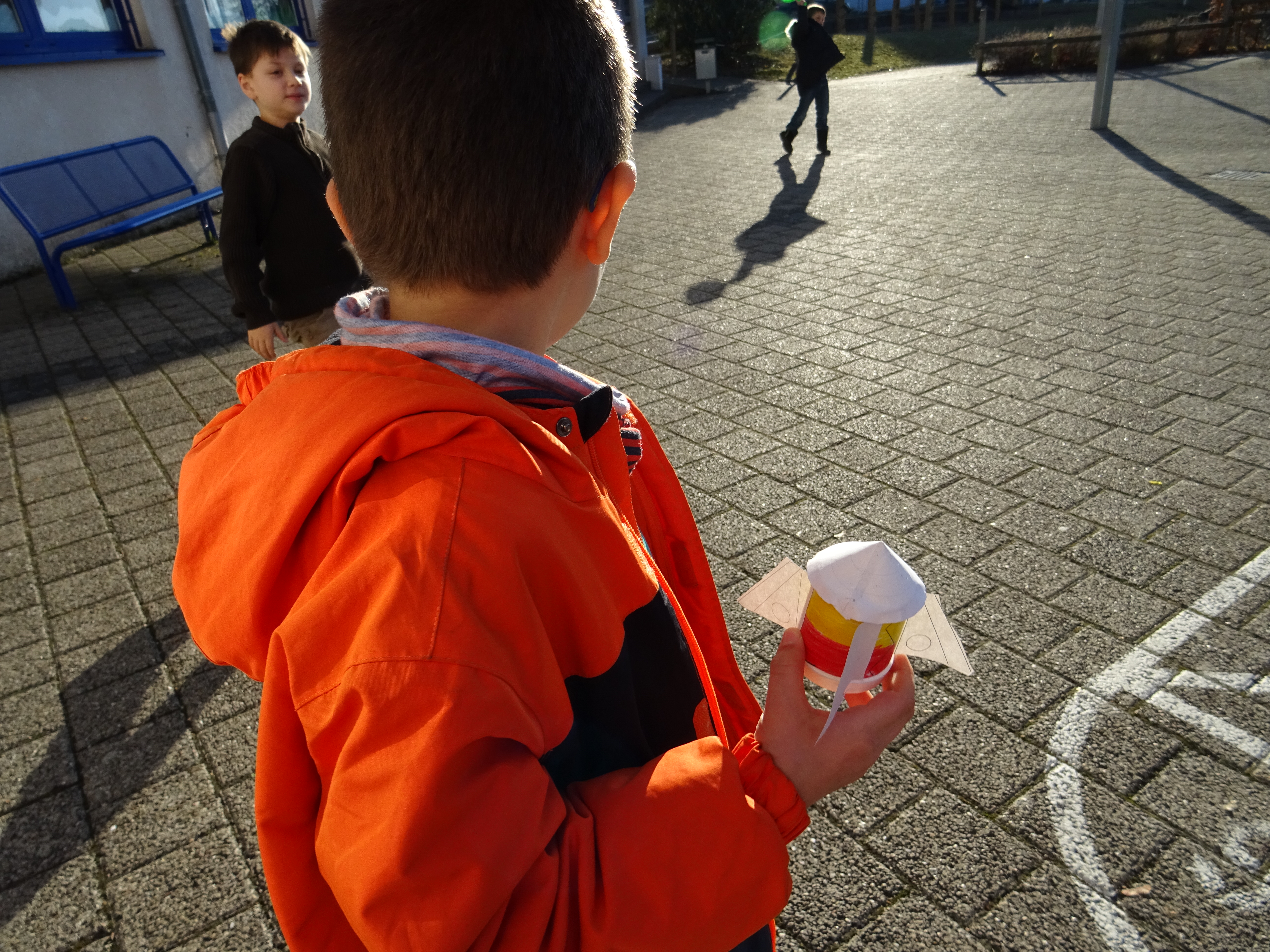 Am Mittwoch, den 28.12. 2016 wechselten die Astronauten der Bodentruppe zum Flug zum Planetarium Stuttgart und die Ausflugsastronauten vom Vortag absolvierten ihr Training in der Turnhalle und machten sich schlau mit den verschiedenen Experimenten. Am nächsten Tag regte das Quiz zum Thema Universum die Kinder spontan an, auf großen Papierbögen Zeichnungen von Raumschiffen und Raketen anzufertigen. Und nach Lösung des Quiz starteten die Kinder unter Aufsicht zwei Teebeutelraketen in die Luft. Eine weitere Gruppe bastelte und gestaltete ebenfalls kleine Raketen aus Papier und Plastikdosen, die wiederum mit einer Mischung aus Backpulver und Essig im Inneren der Rakete später ins Universum fliegen sollten. Gar nicht so einfach wie gedacht. Hier kam es auf die Mischung von Backpulver und Essig an. Gemeinsam wurden die unterschiedlichsten Mischverhältnissen ausprobiert und somit gelang auch der Start der einen oder anderen Rakete.