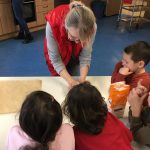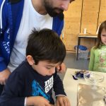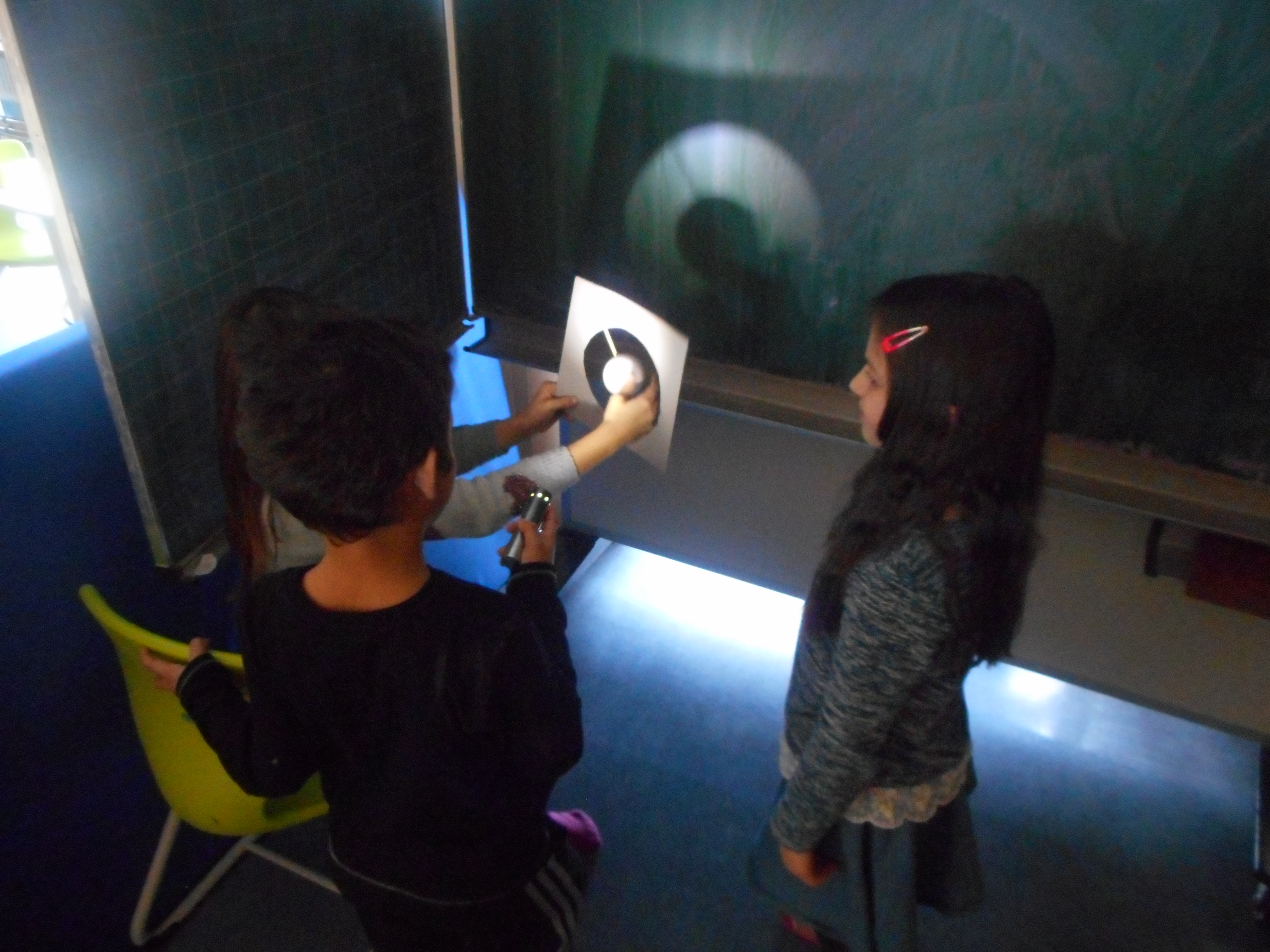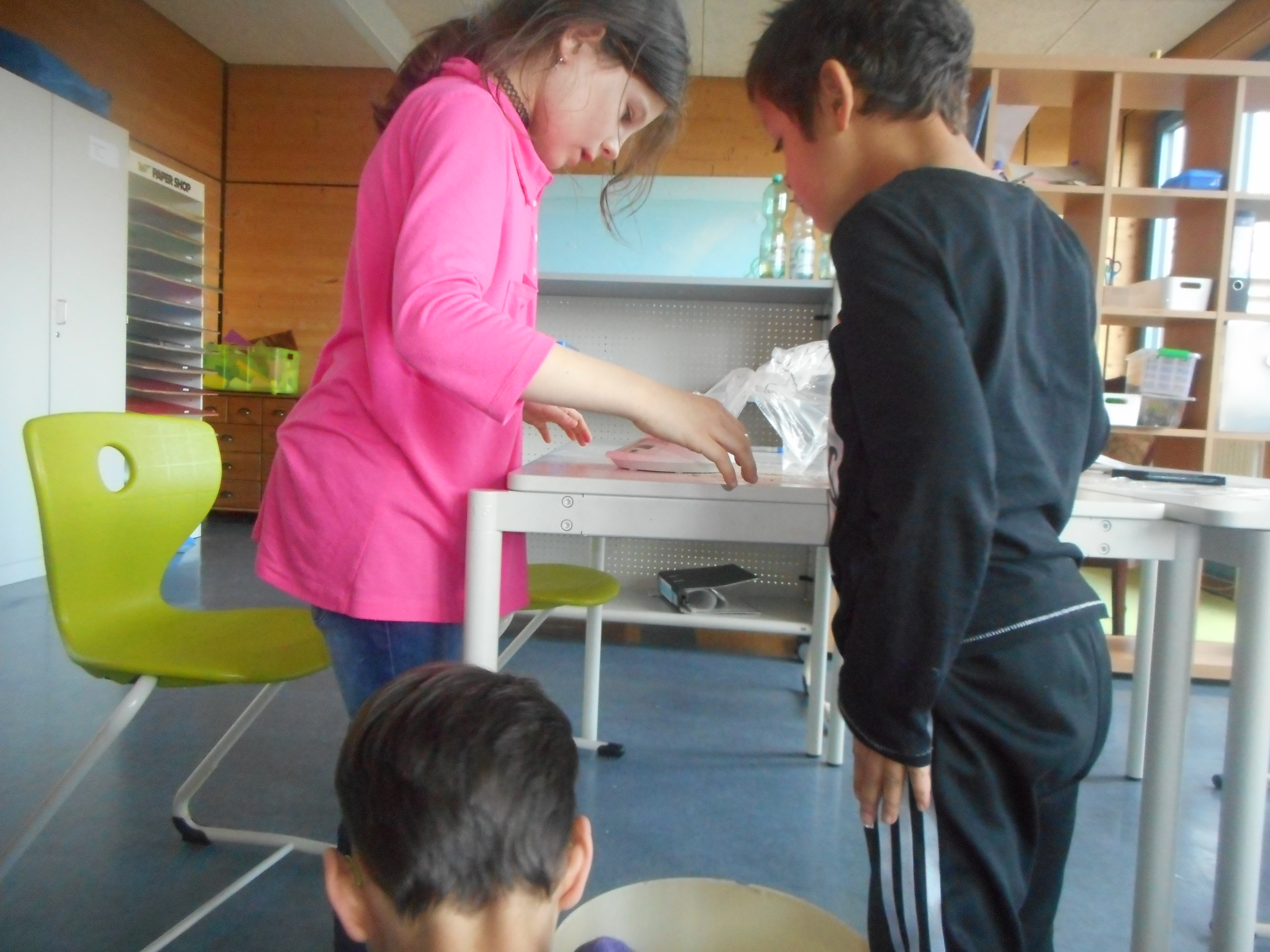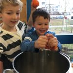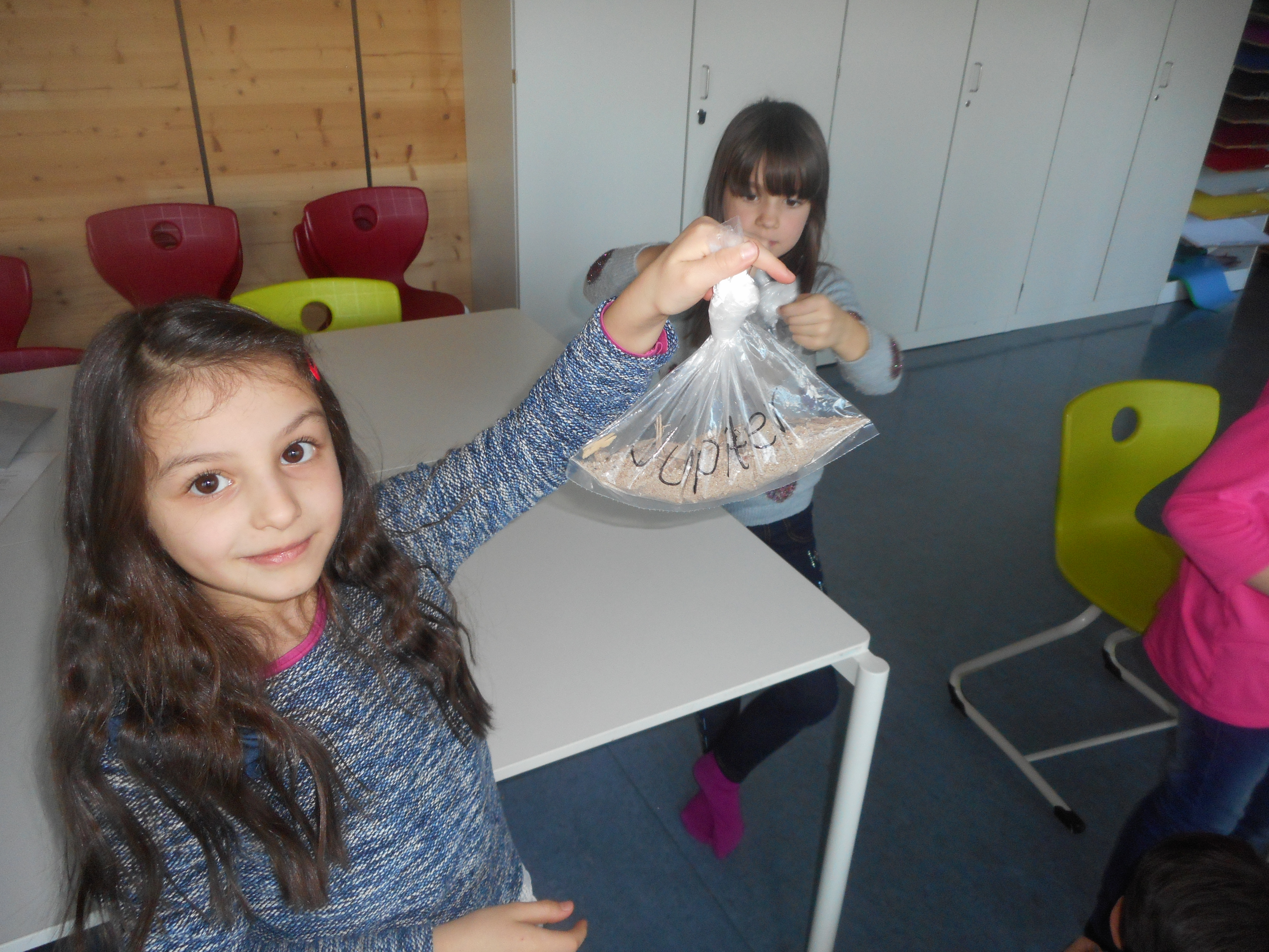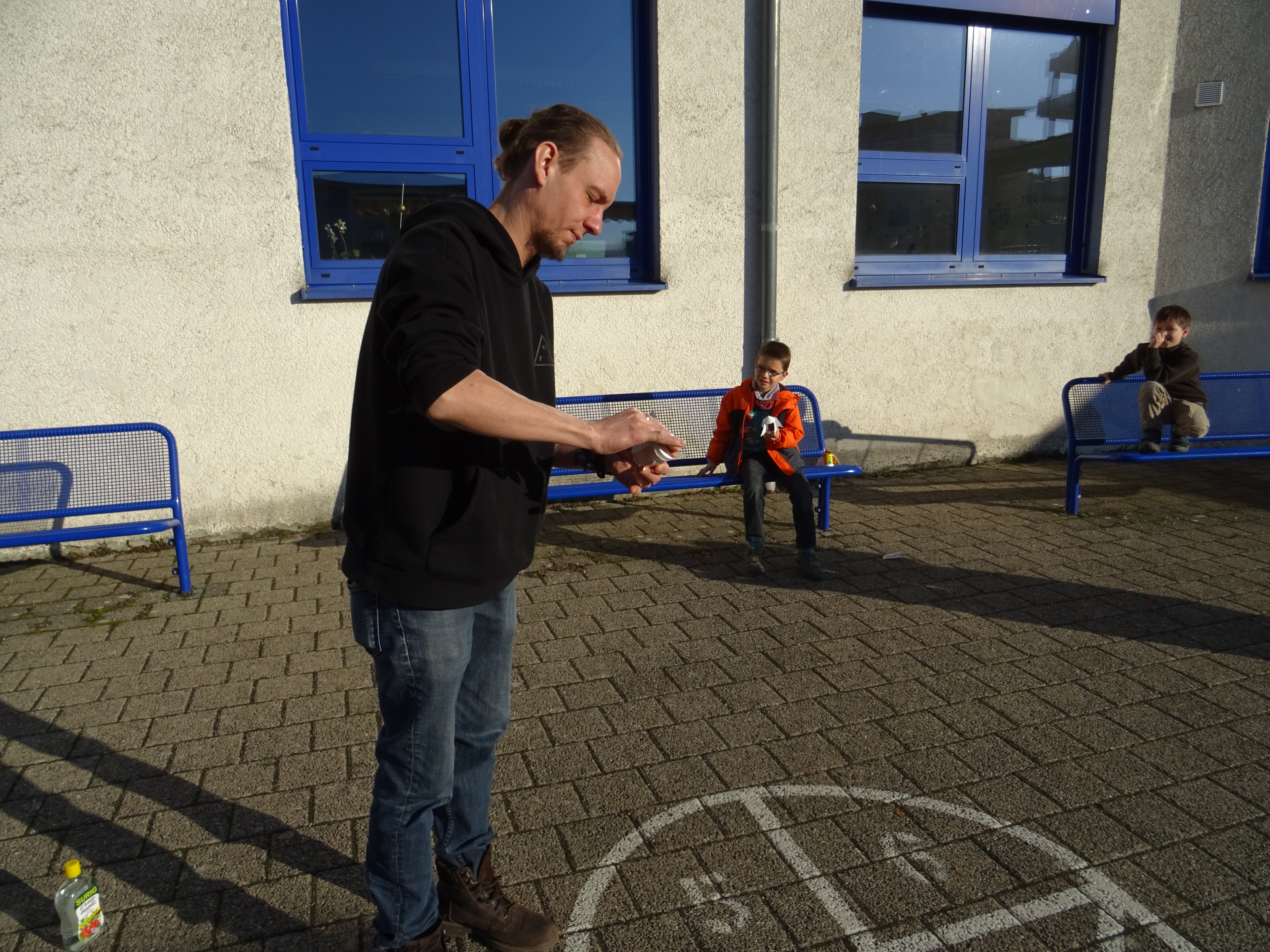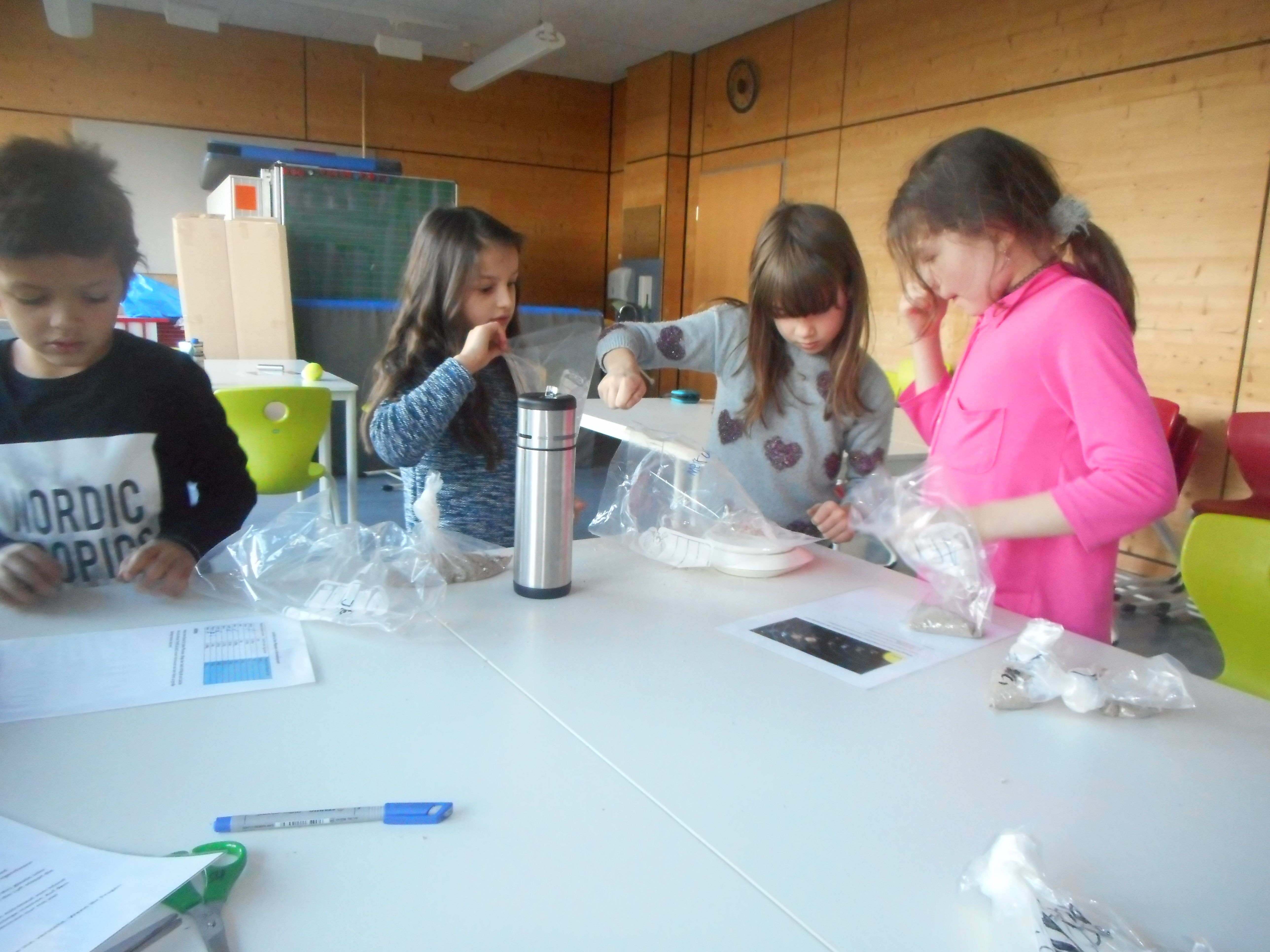 Derweilen beschäftigten sich die Astronauten der Bodenstation mit Experimenten zum Thema Universum. Über das Universum gibt es viel zu erforschen und zu entdecken. Mit Hilfe von Sandsäcken konnten die Kinder spüren wie leicht z.B. ein Stück Käse auf dem Mars und wie schwer es auf dem Jupiter ist. Da die Planeten alle sehr unterschiedlich sind, ist es also kein Wunder dass man auf dem Mond solch große Sprünge machen kann! Aber warum kann man auf dem Mond schwerelos spazieren gehen? Hier fanden die Kinder die Antwort anhand eines Experimentes mit einem Magneten. Je stärker der Magnet – bzw. je größer der Planet – umso stärker ist die Anziehungskraft. Der Jupiter z.B. ist vergleichbar mit einem riesigen Magneten und zieht alles viel stärker an als beispielsweise der kleinere Mond. Außerdem konnten die Kinder entdecken wie Tag und Nacht entstehen und eine erste Idee erhalten wie es zu Winter und Sommer kommt.