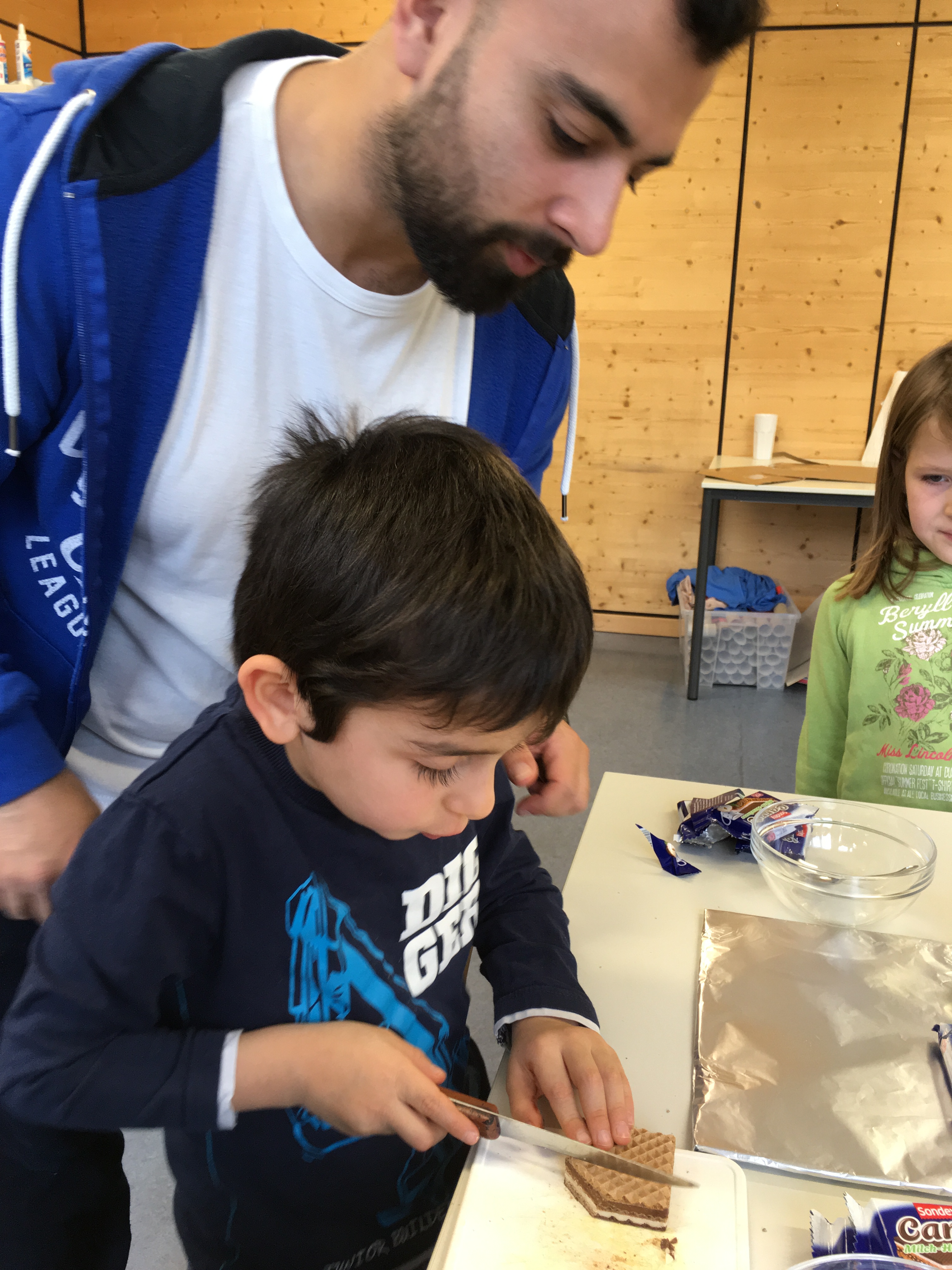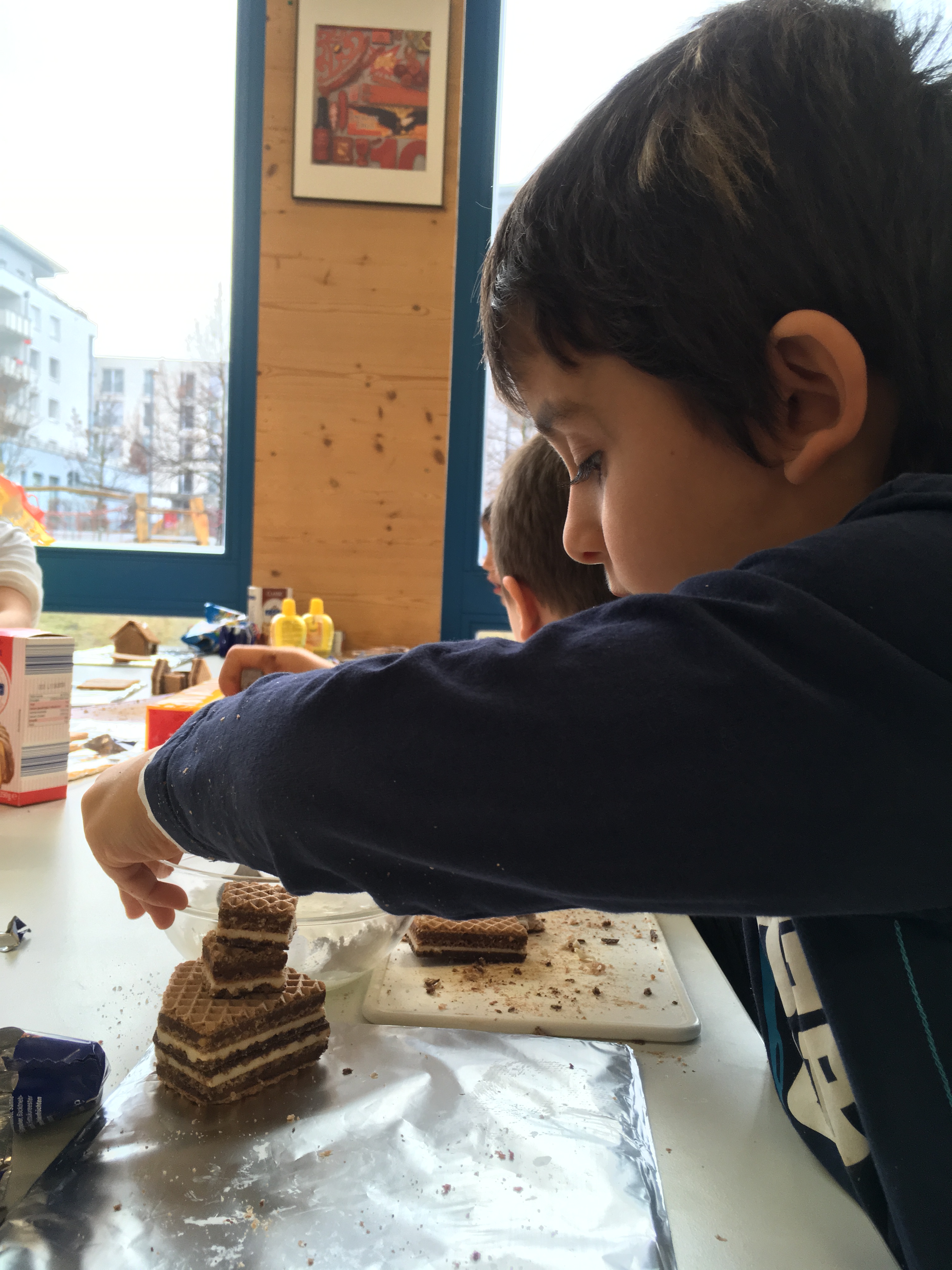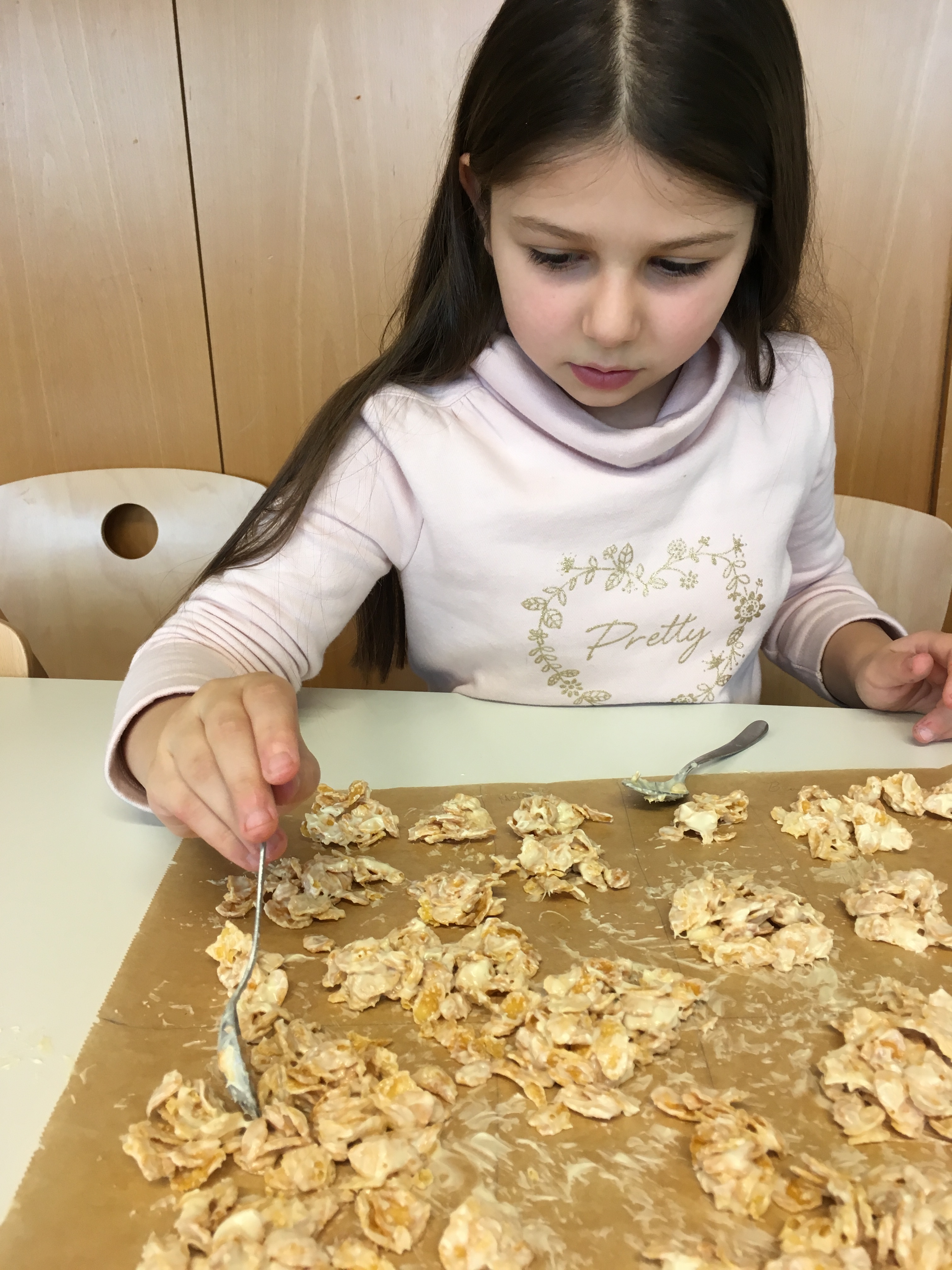 Gegen 11:30 Uhr verströmten schon die ersten selbstgebackenen Plätzchen ihren köstlichen Duft im Schulhaus und die Kinder zeigten sich sehr geschickt im Ausrollen des Teiges, im Ausstechen der Plätzchen und im Vernaschen derselben. Auch die knusprigen Schokoflakes waren eine Freude für die Kinder. Im Wasserbad wurden weiße und dunkle Schokolade geschmolzen, um sie dann mit Cornflakes zu vermischen und sie zu kleinen Häufchen zu stapeln. Gar nicht so einfach! Aber mit Ruhe und Geduld waren bald die ersten Bleche gemacht.