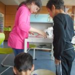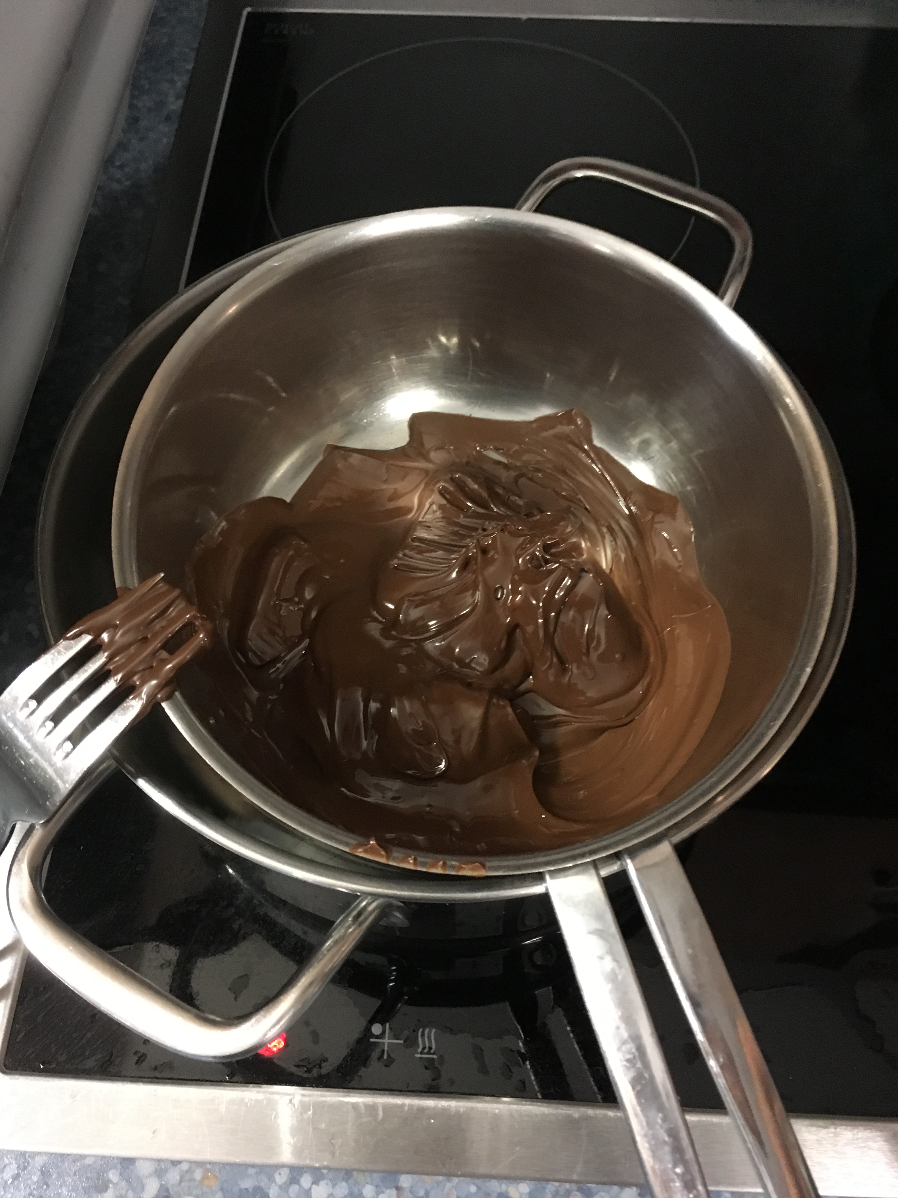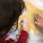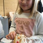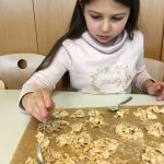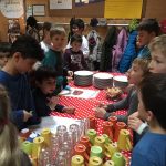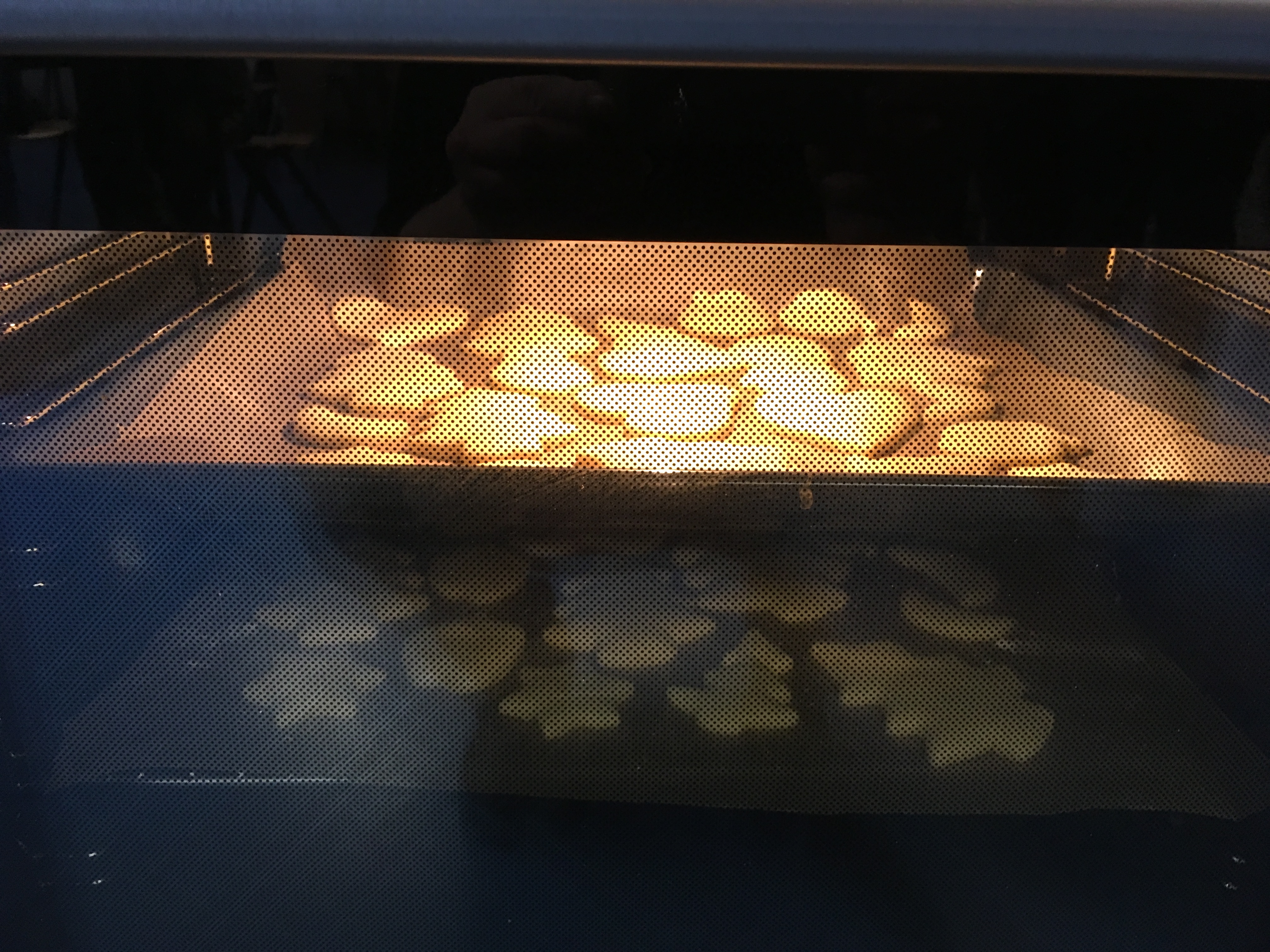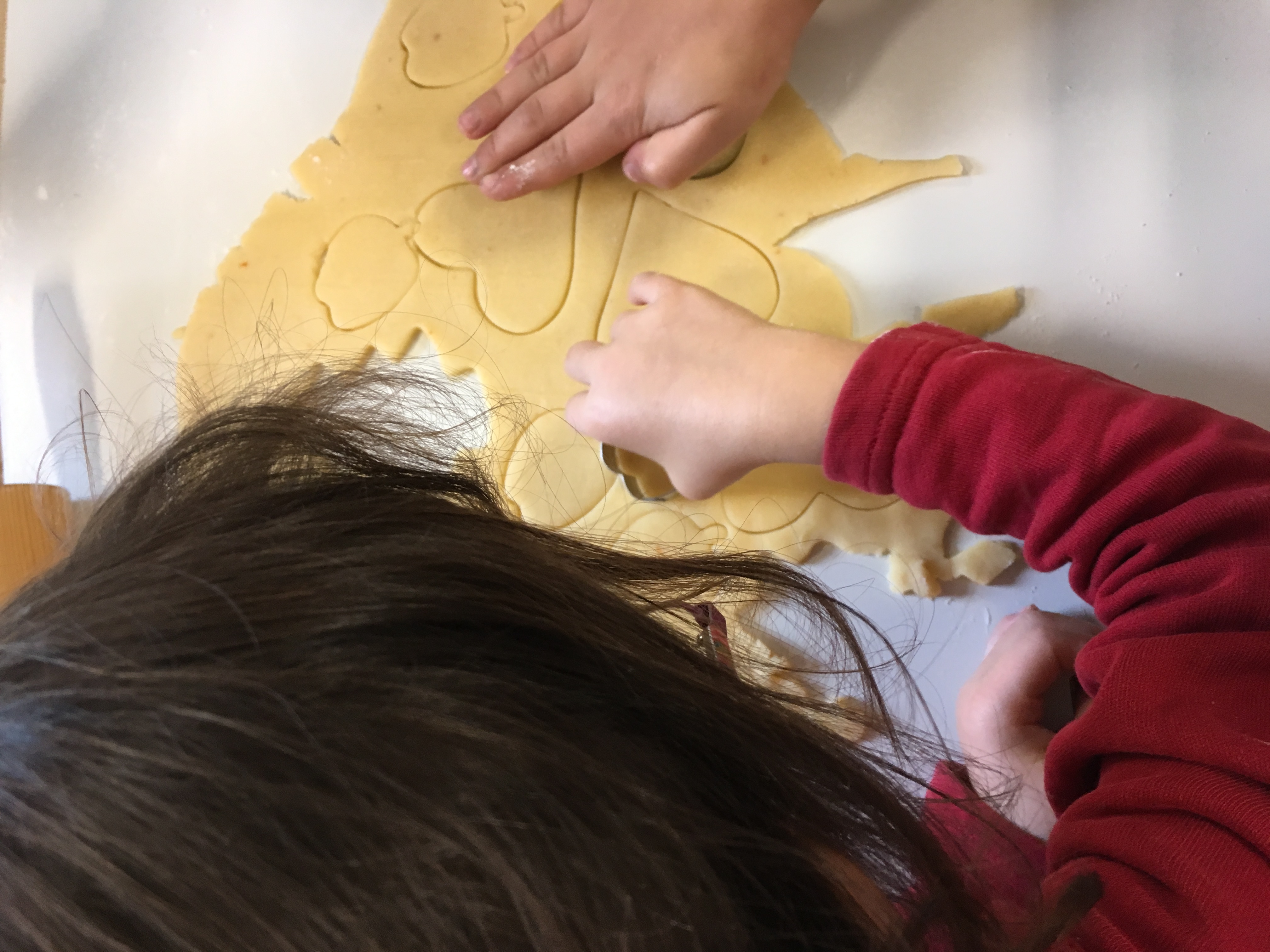 Gegen 11:30 Uhr verströmten schon die ersten selbstgebackenen Plätzchen ihren köstlichen Duft im Schulhaus und die Kinder zeigten sich sehr geschickt im Ausrollen des Teiges, im Ausstechen der Plätzchen und im Vernaschen derselben. Auch die knusprigen Schokoflakes waren eine Freude für die Kinder. Im Wasserbad wurden weiße und dunkle Schokolade geschmolzen, um sie dann mit Cornflakes zu vermischen und sie zu kleinen Häufchen zu stapeln. Gar nicht so einfach! Aber mit Ruhe und Geduld waren bald die ersten Bleche gemacht.