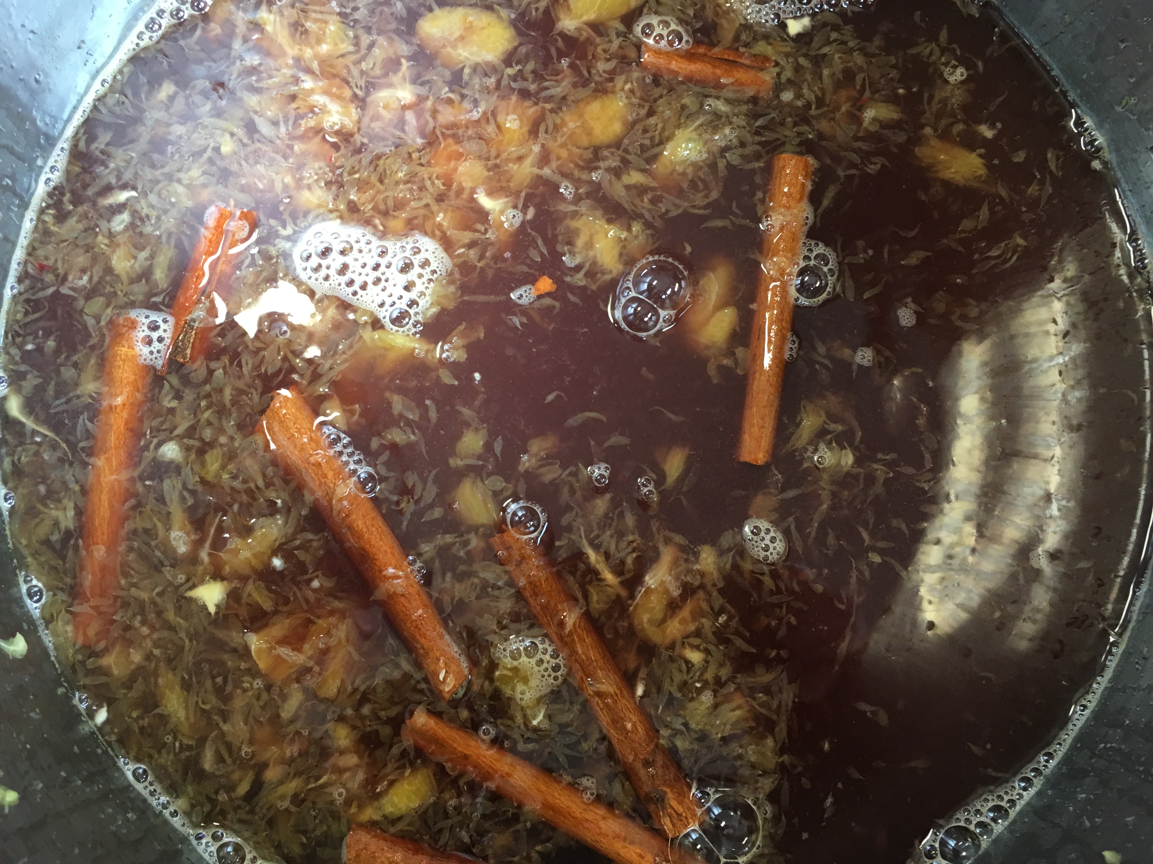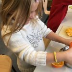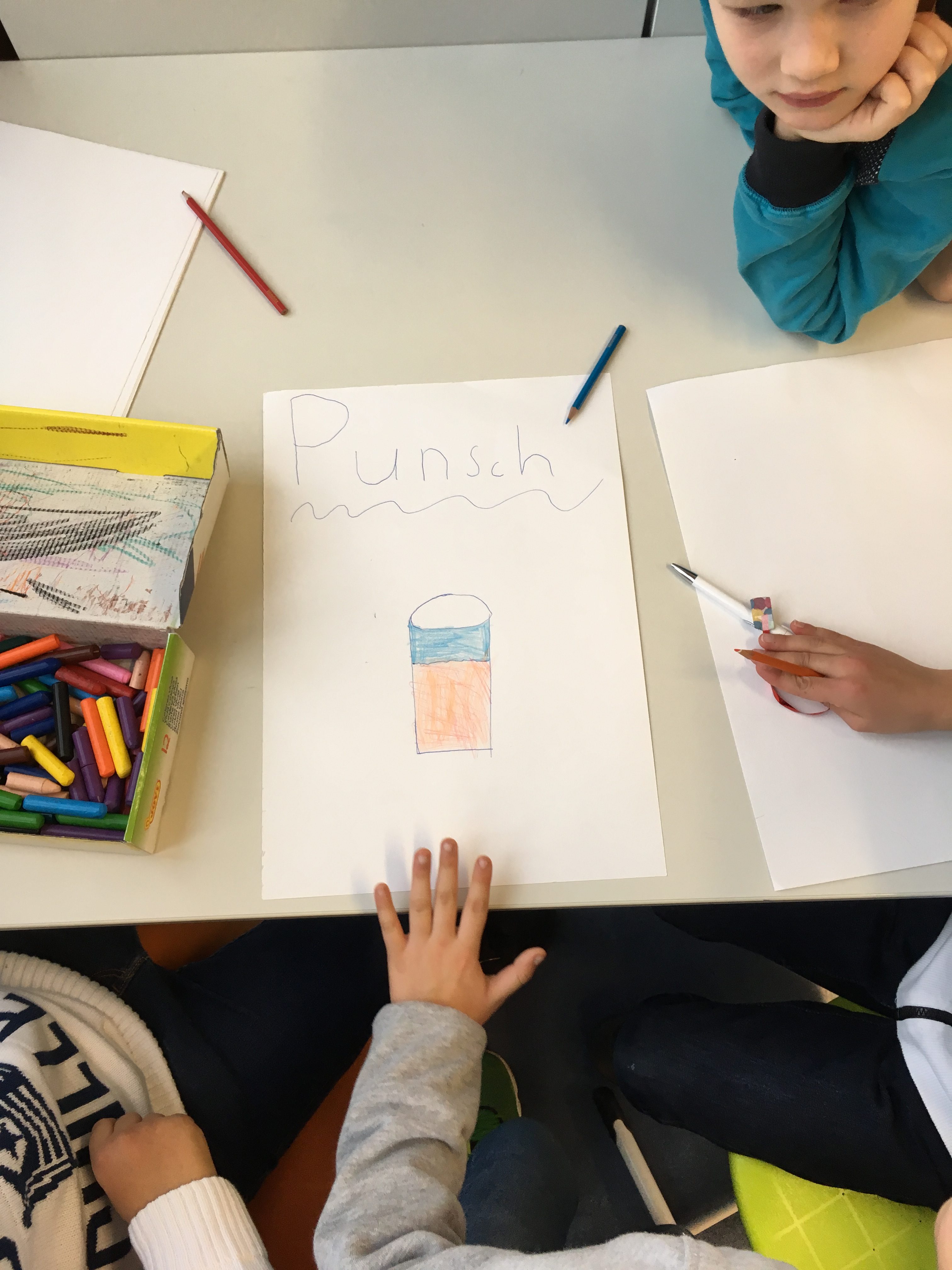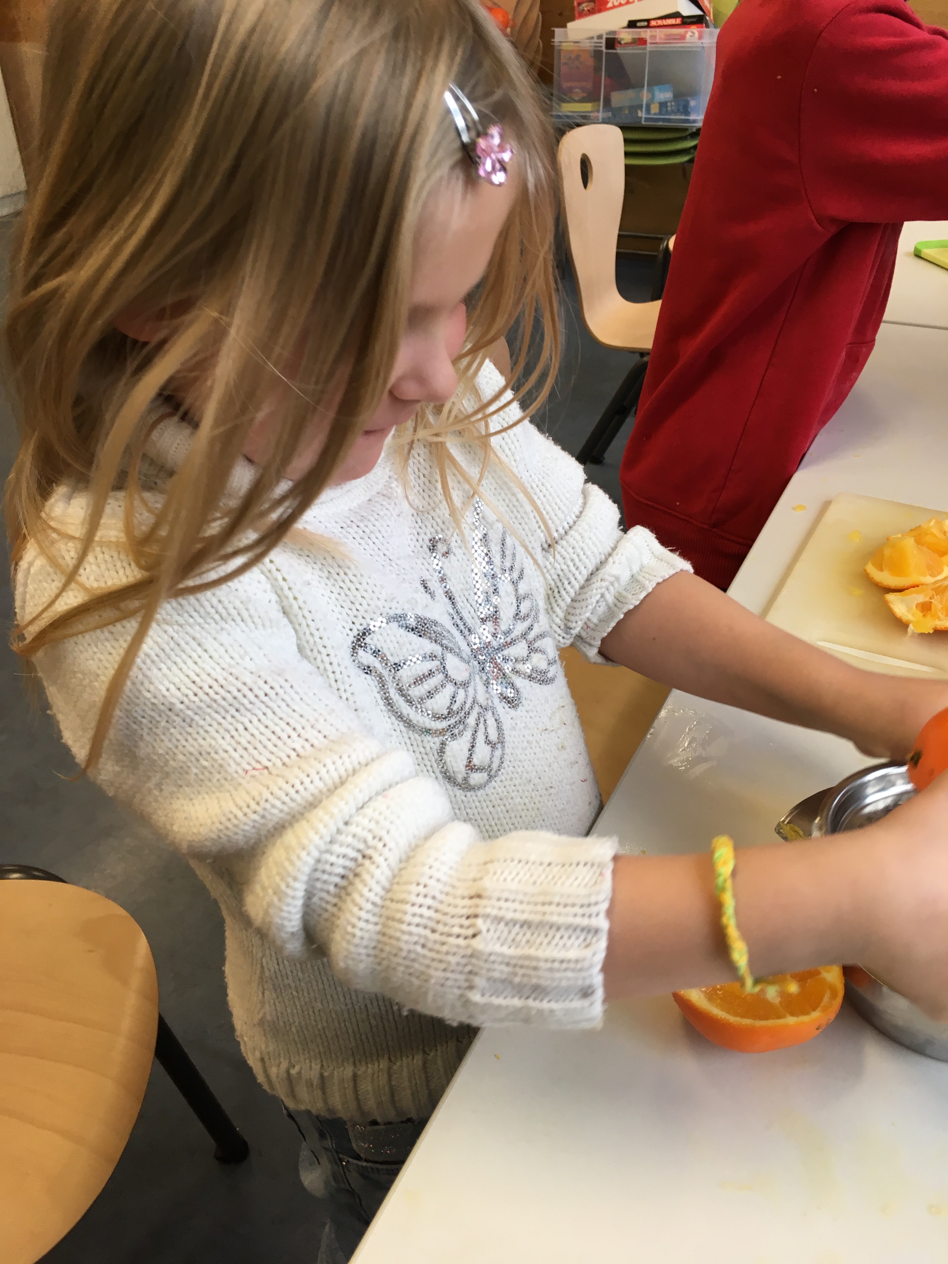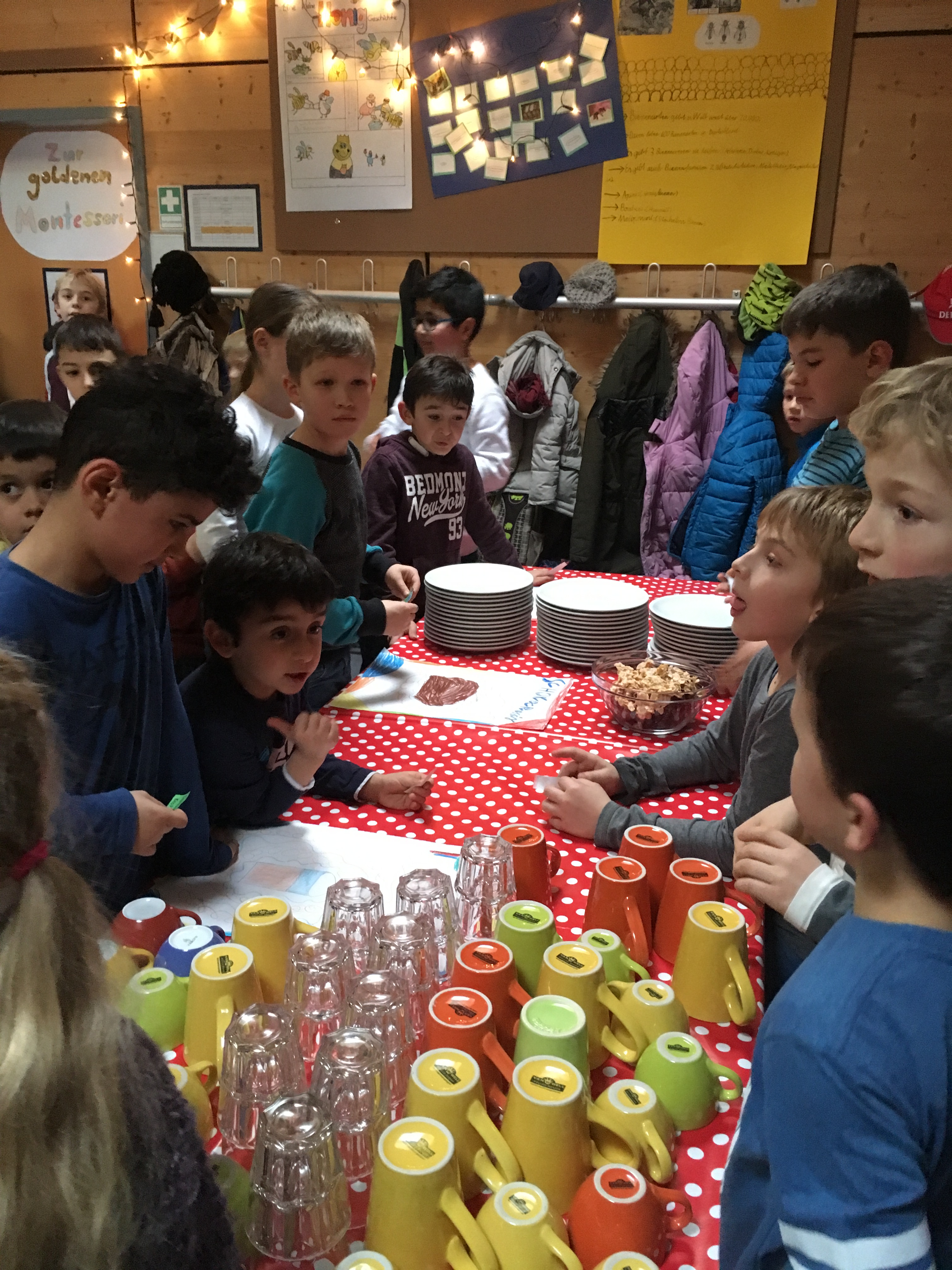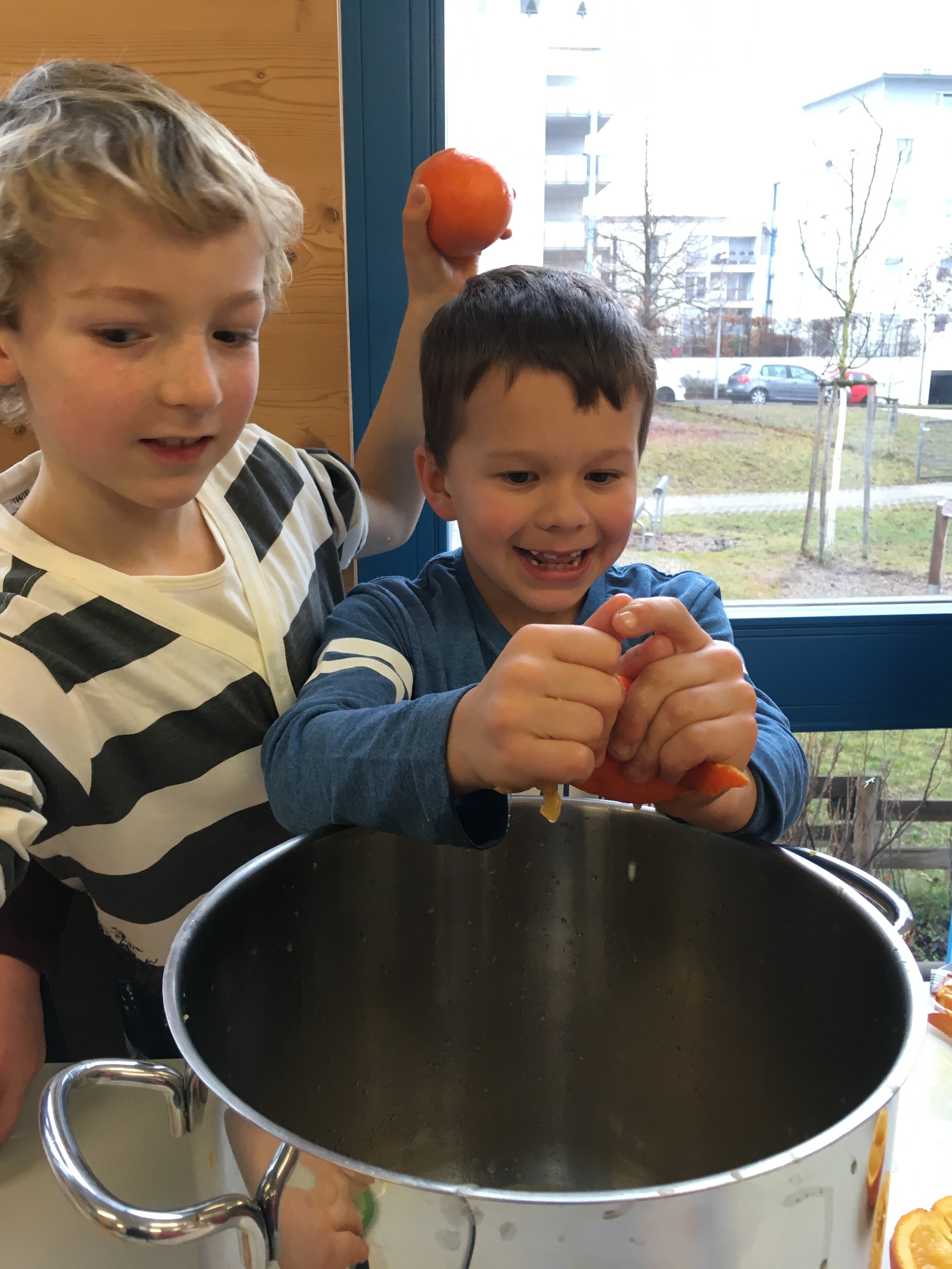 Im Zimmer ‚Zum Goldenen Montessori‘ wurde ebenfalls schwer gearbeitet. Hier pressten die Punschexperten 7 Kilo frische Orangen zu Saft und wunderten sich, dass so eine Menge Orangen nicht so viel Saft ergaben wie erwartet. Doch natürlich standen noch weitere Zutaten auf dem Punschrezept. Echte Zimtstangen und Weihnachtsgewürze verfeinerten den Punsch.