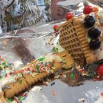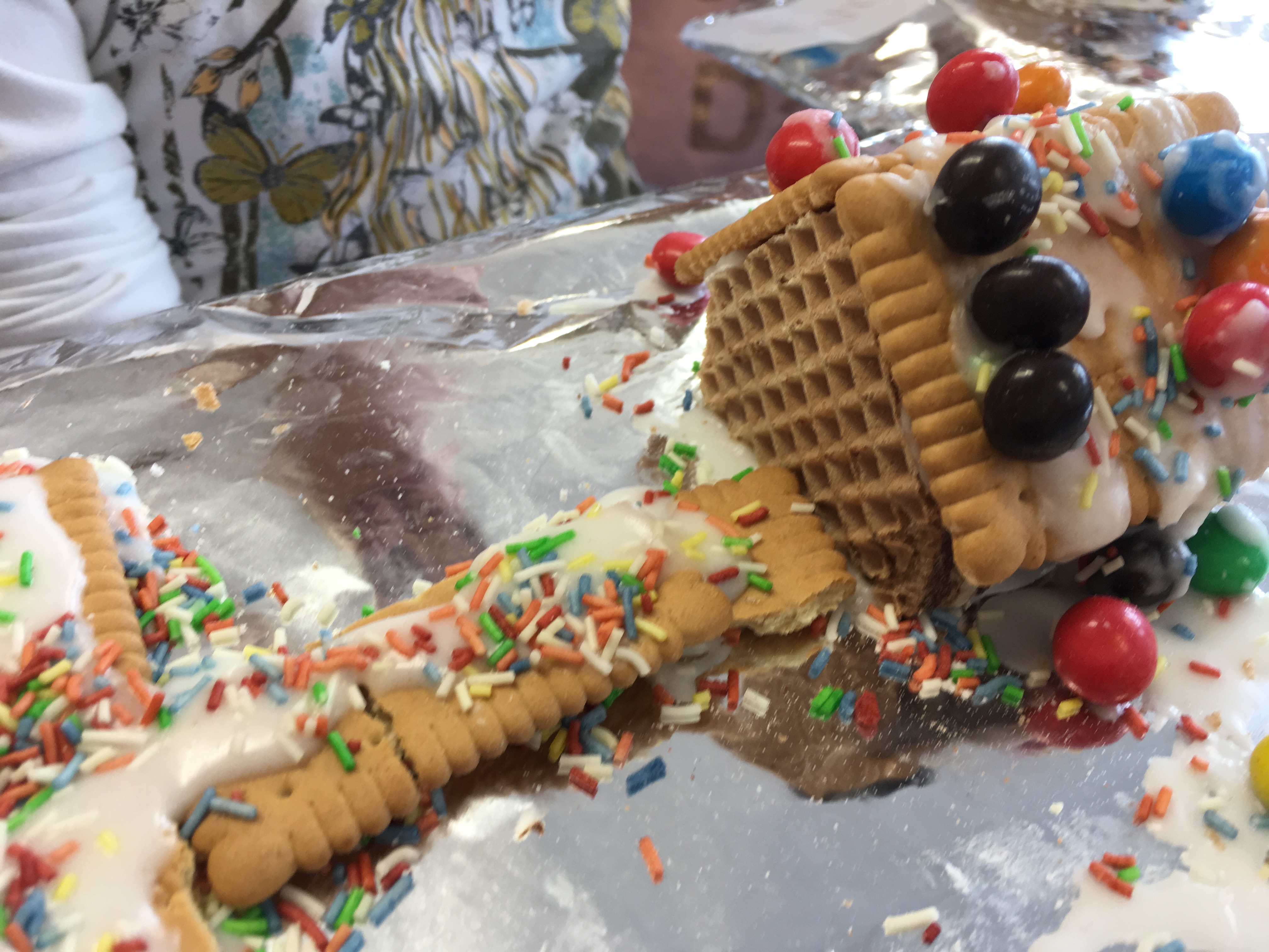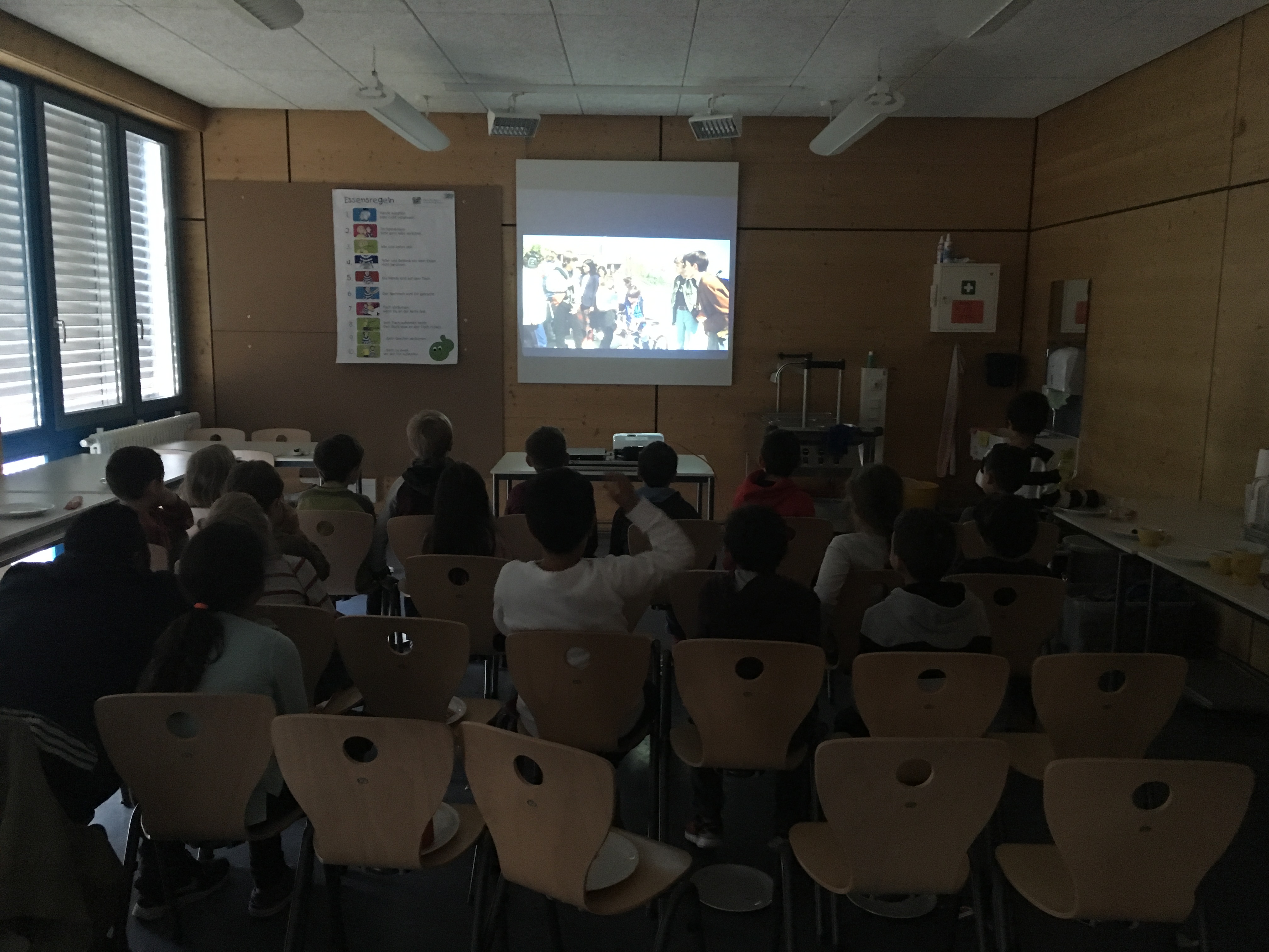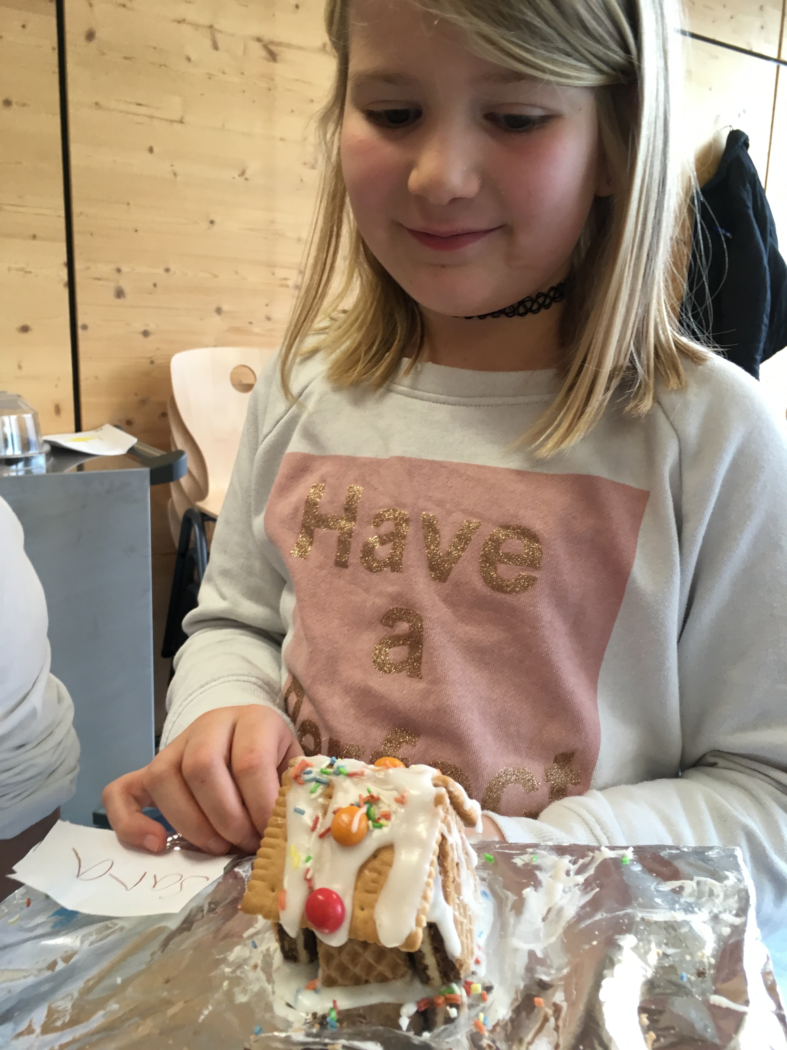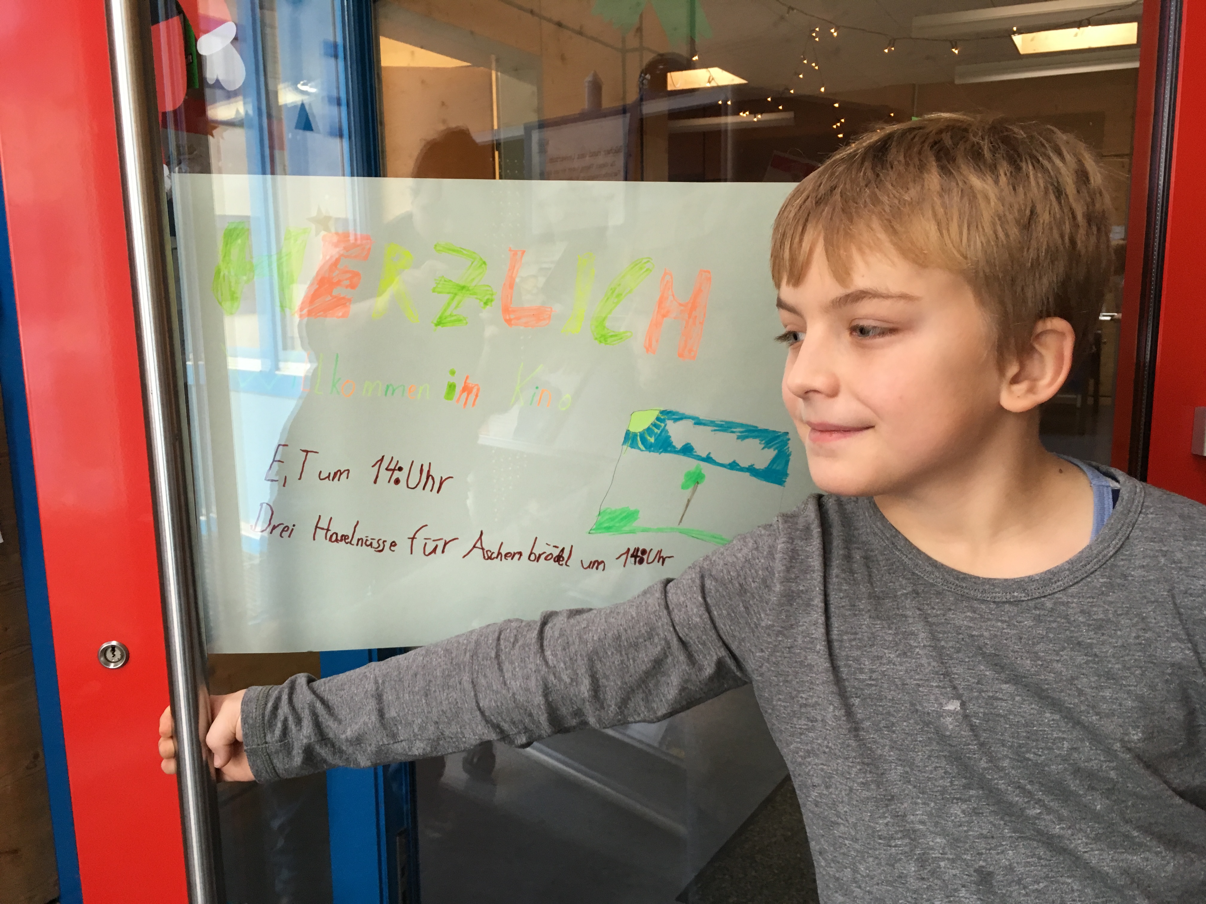Am Tisch nebenan wurden die selbst zusammengesetzten Knusperhäuschen aus Knusperschnitten und Puderzucker leidenschaftlich eng mit Gummibärchen und bunten Schokolinsen beklebt. Natürlich landete die Verzierung im einen oder anderen Kindermund, genau wie geplant! Und dann, am frühen Nachmittag, öffnete das Kino seine Türen. Es war eine große Freude zu sehen, wie toll die Kinder sich hier organisiert hatten. Es gab einen Verkäufer der Kinokarten und das Buffet war mit freundlichen Punsch- und Plätzchenverteilern besetzt. Die Stimmung war klasse! Alle holten sich ihre Leckereien und verschwanden entweder zu „ Drei Haselnüsse für Aschenputtel“ im Kino 1 oder zu „ET –der Außerirdische“ im Kino 2. Gemeinsam räumten wir dann nach der Vorstellung unser Kinoequipment zusammen, beseitigten den angefallenen Müll in den Kinosälen und freuten uns. Über was? Na über eine so tolle Zusammenarbeit der Kinder untereinander und dann natürlich auf die Reise ins Universum in den Ferientagen nach Weihnachten.