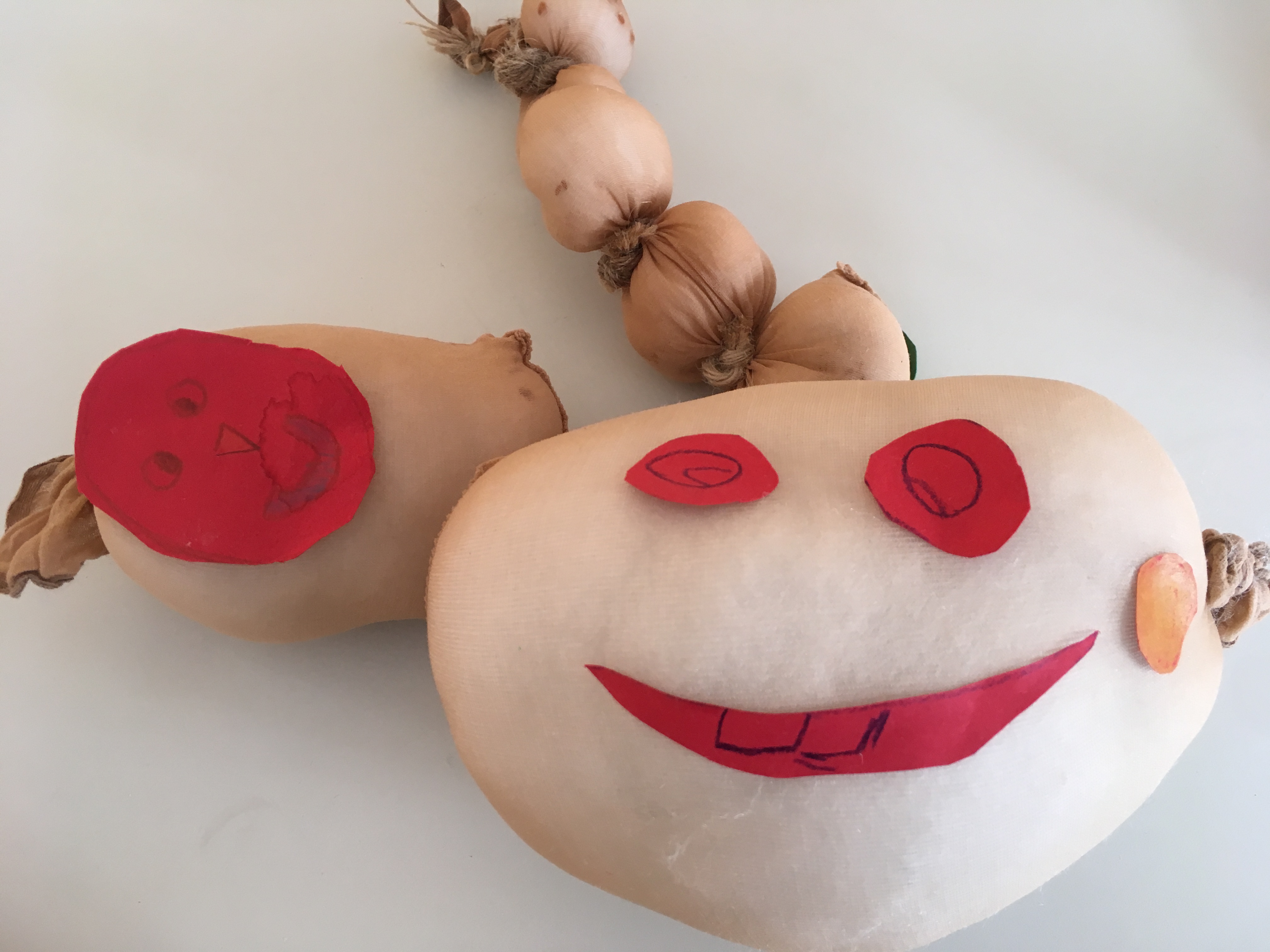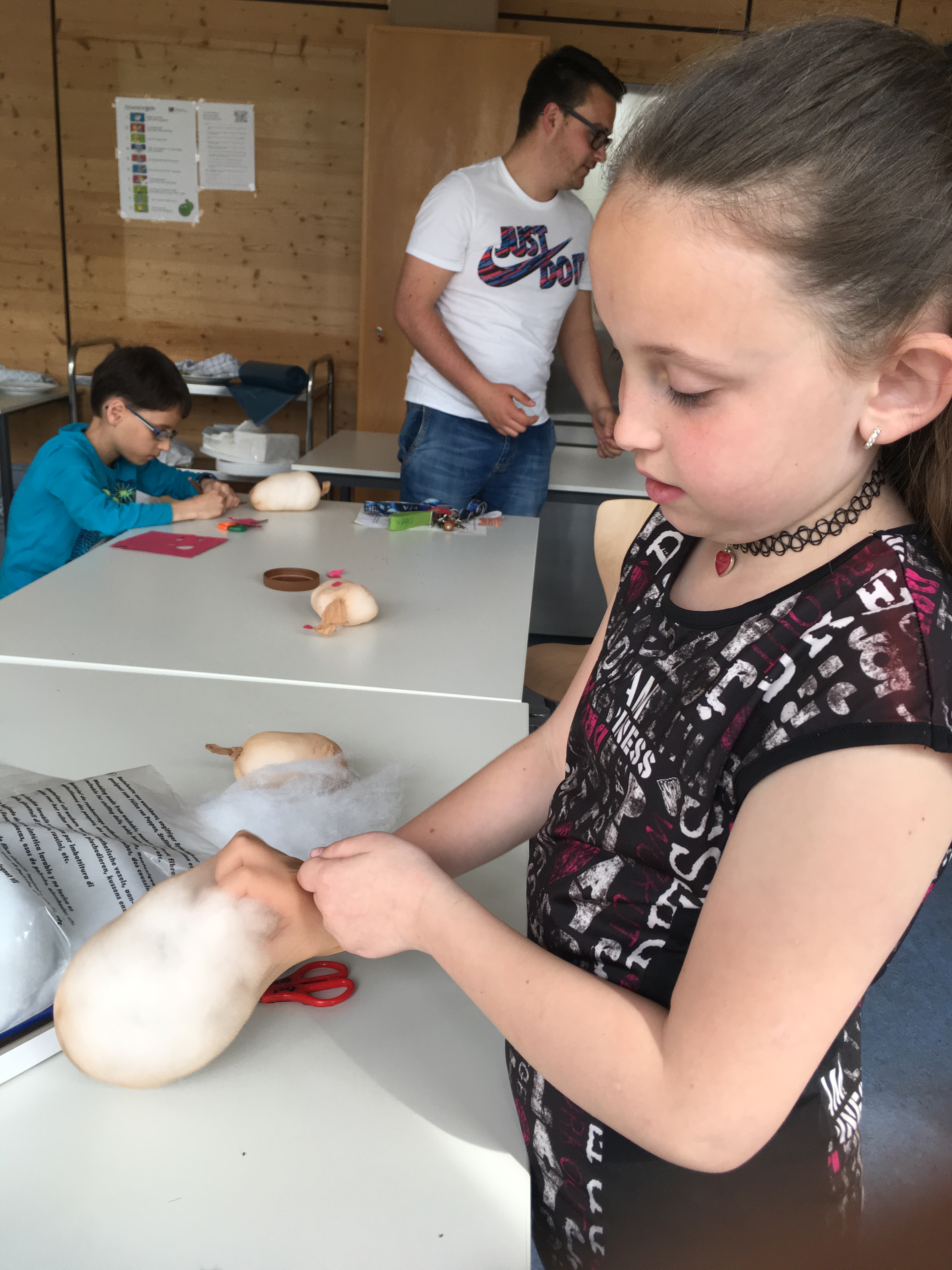 Doch nicht nur im Garten, sondern auch im Pavillon ließen wir Blumen wachsen. Hier gestalteten wir aus Nylonstrümpfen, Watte und Kressesamen sogenannte Kresseköpfe. Dafür haben wir die Strümpfe mit Watte und Kressesamen gefüllt und anschließend lustige Gesichter auf die Kressekugeln geklebt. Hier entstanden ganz lustige, eigene Charaktergesichter, welchen sicherlich schon das ein oder andere Kressehaar gewachsen ist.