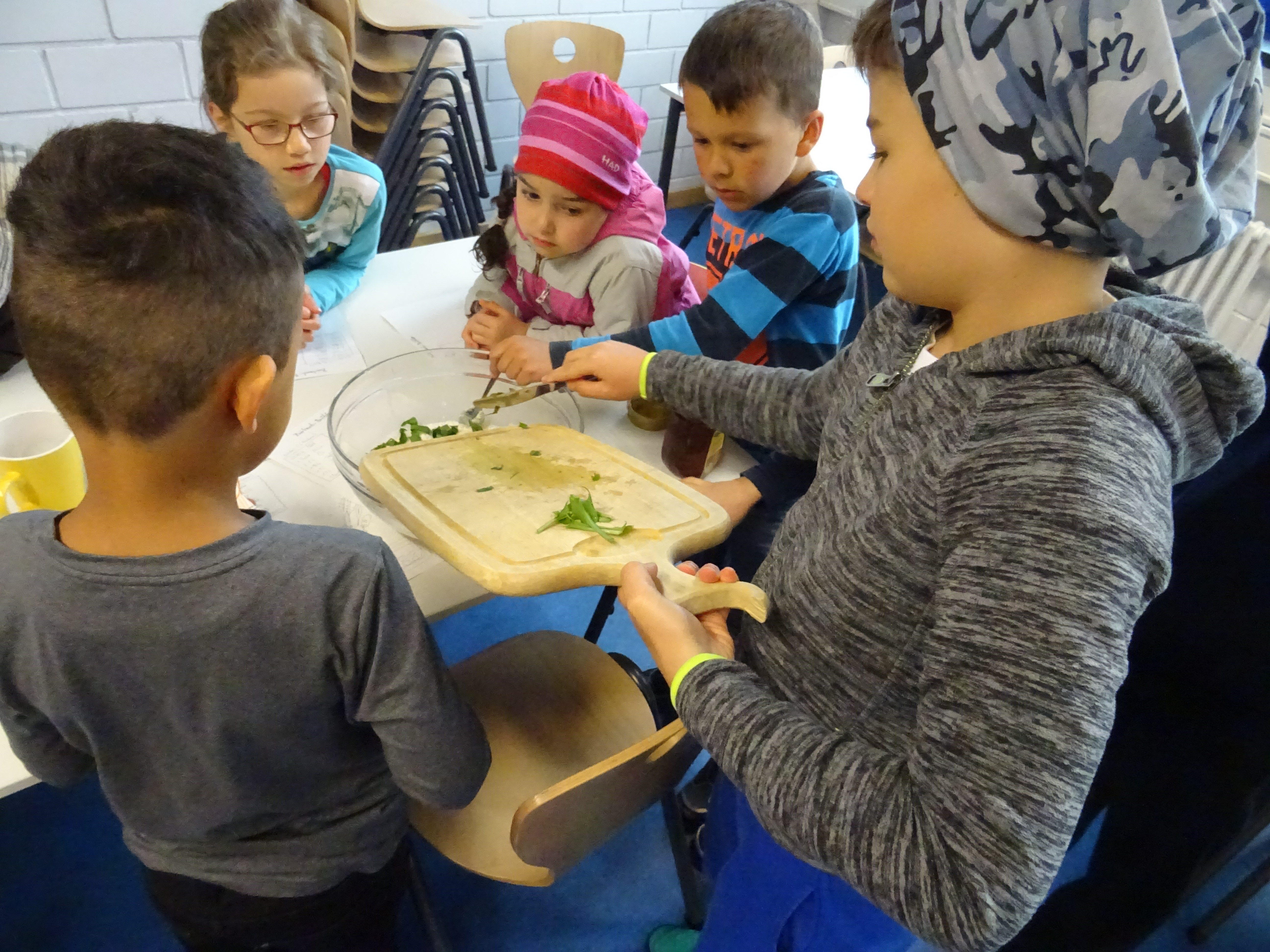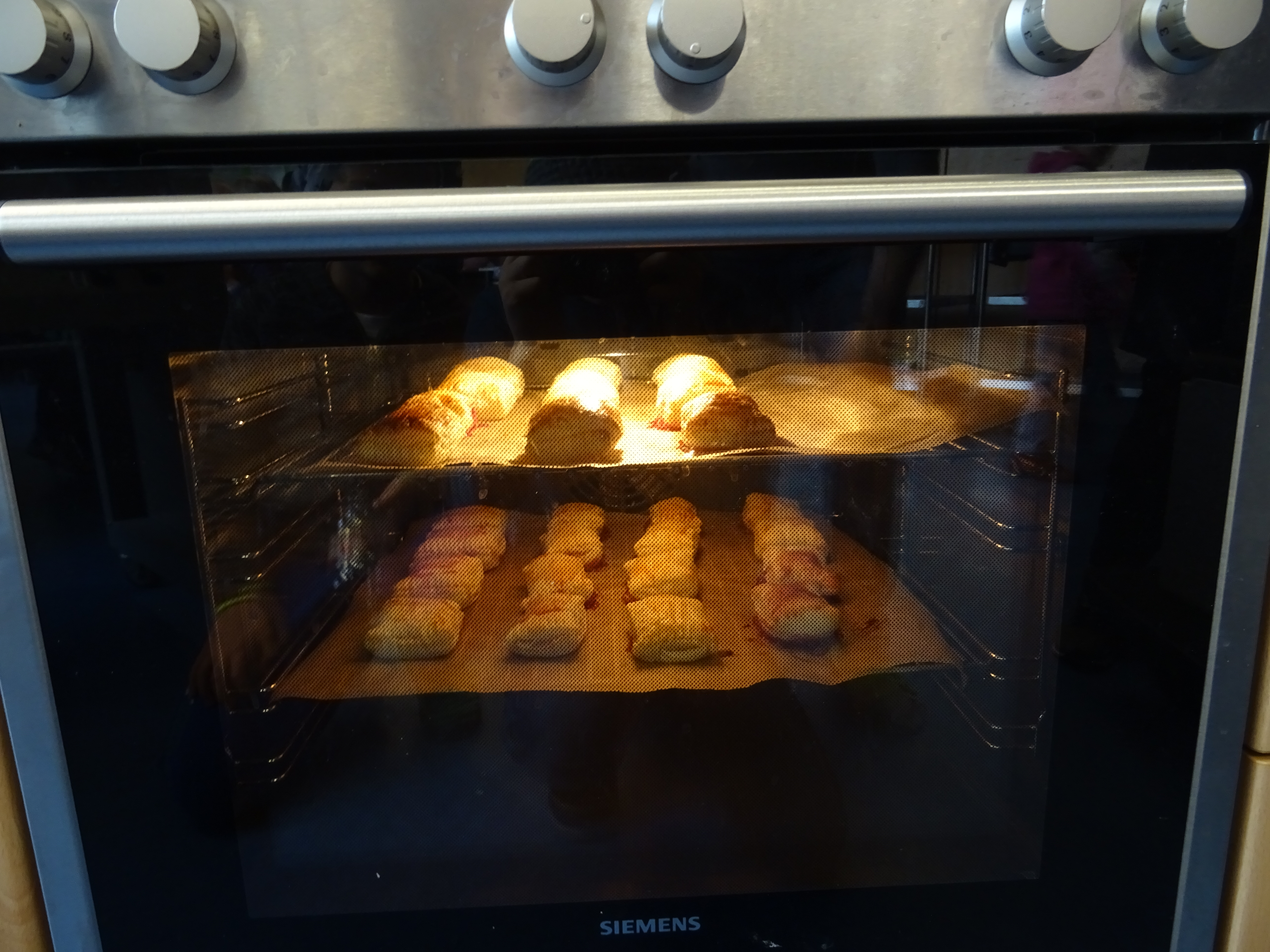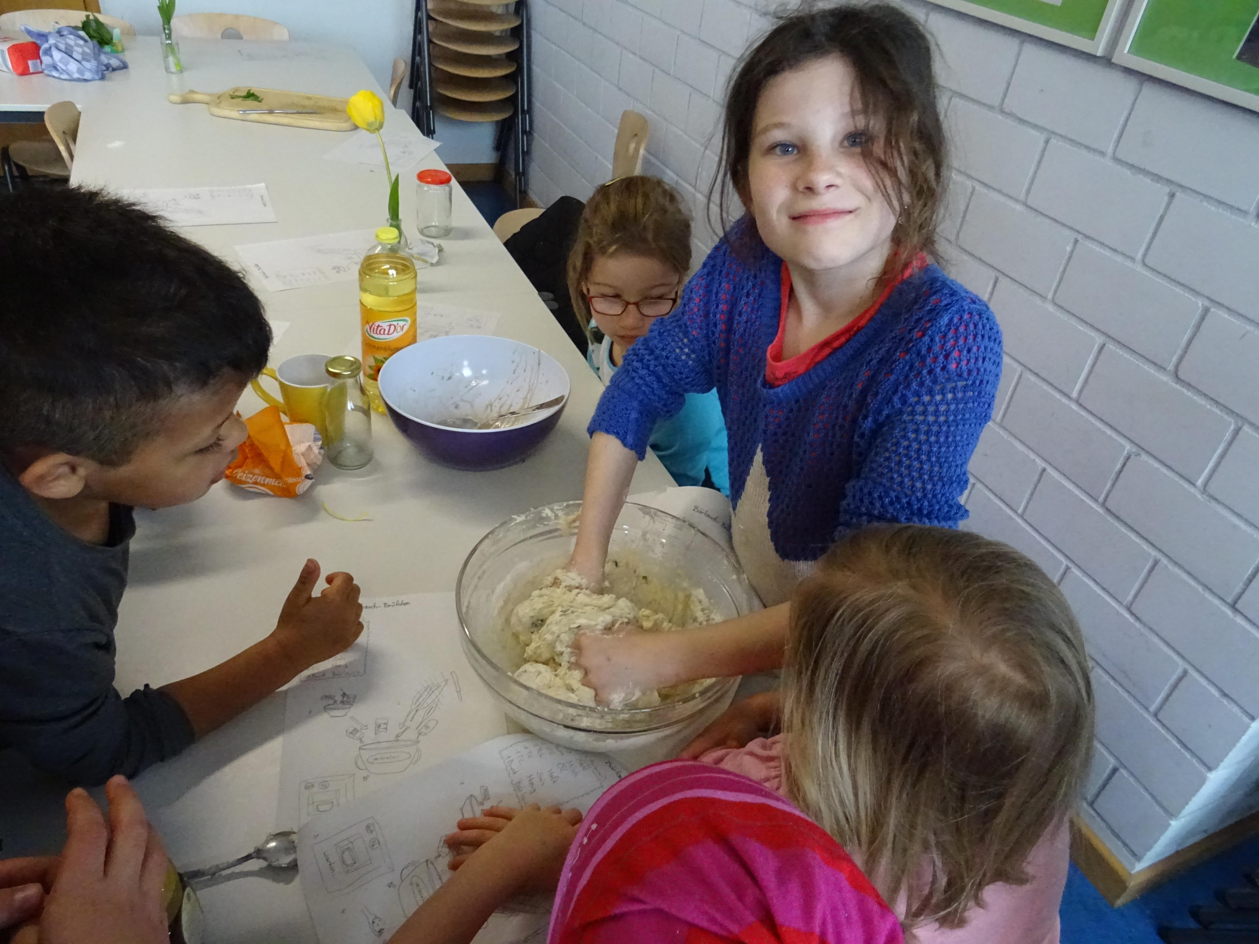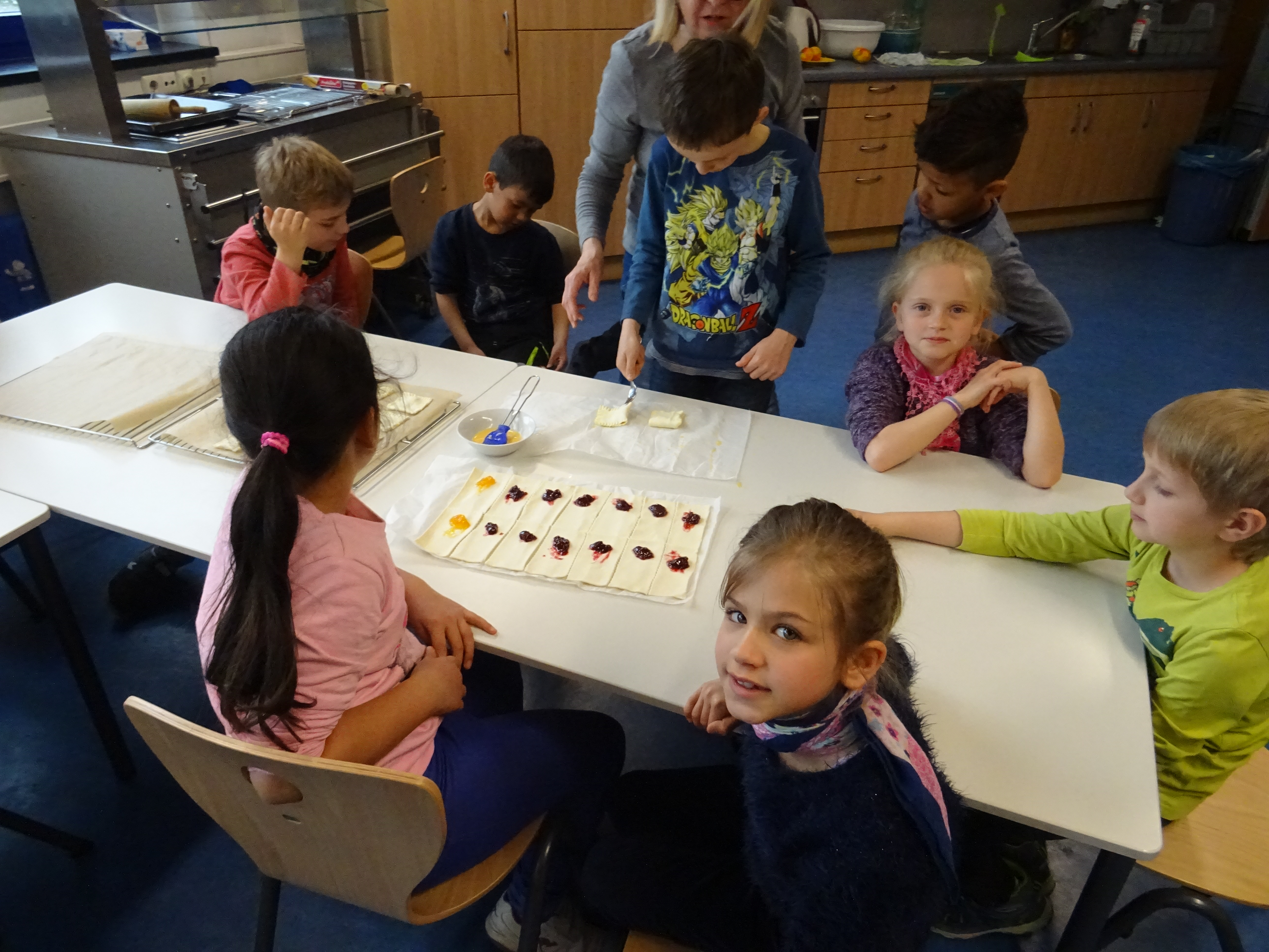 Gartenarbeit macht hungrig, egal ob draußen oder im Pavillon. Daher machte auch das Kochangebot wieder besonders Spaß. In der ersten Woche backten wir bunte Osterhäschen. In der zweiten Woche verschiedene Kuchen. Die Blätterteigtaschen und die Biskuitrolle mit Marmeladenfüllung schmeckten uns besonders gut. Am Ende sind wir mit vollem Bauch nach Hause gegangen.