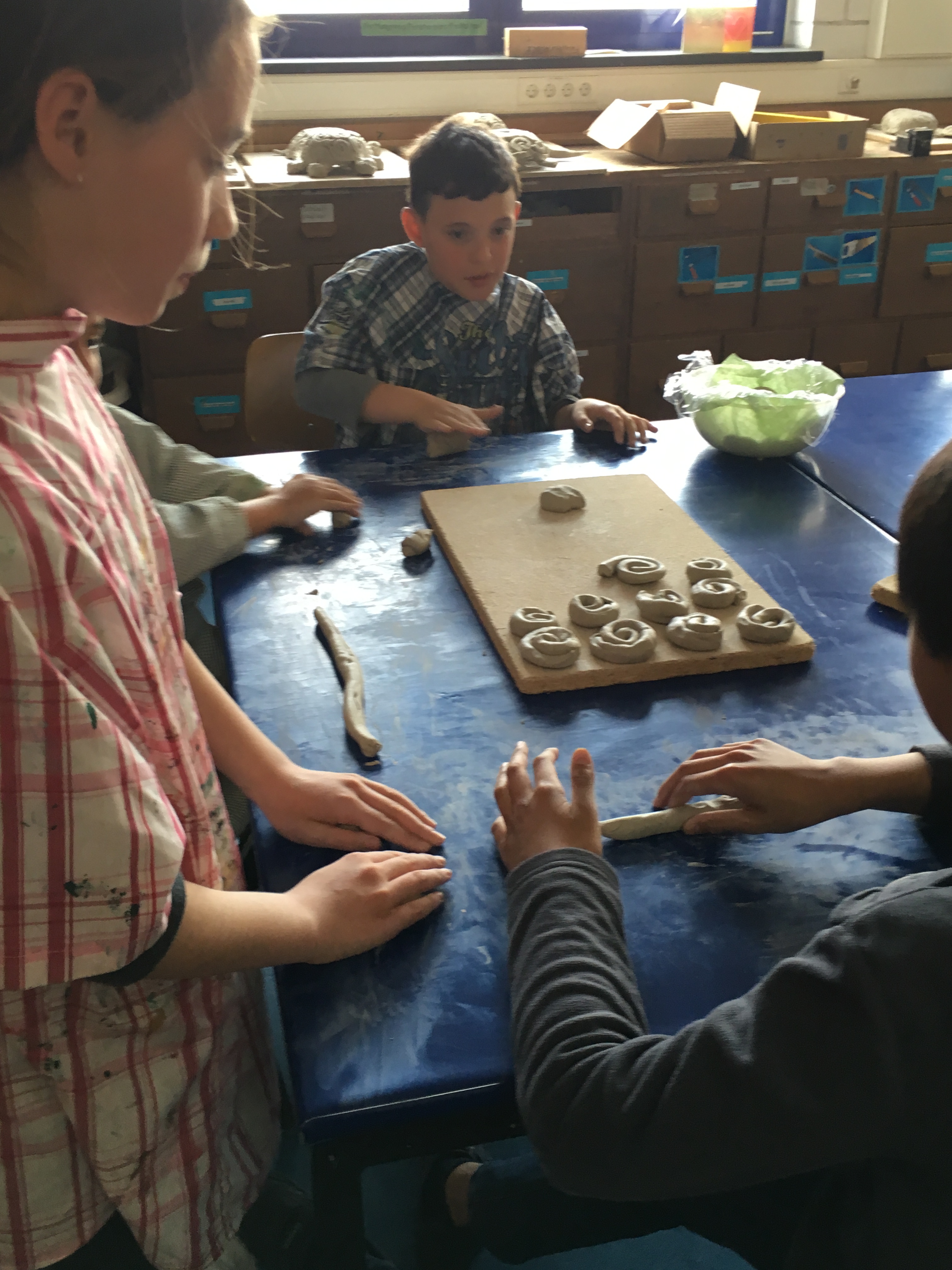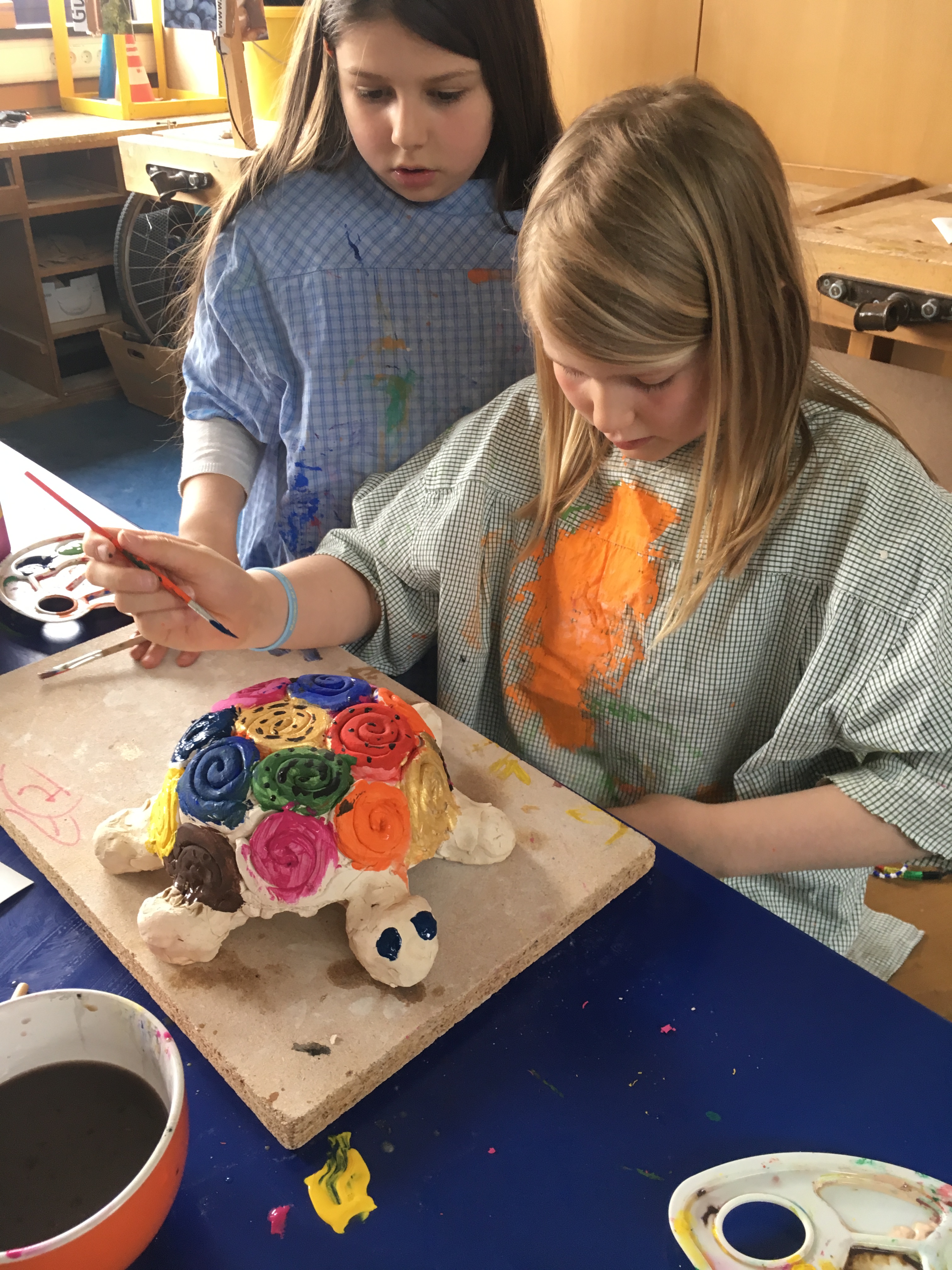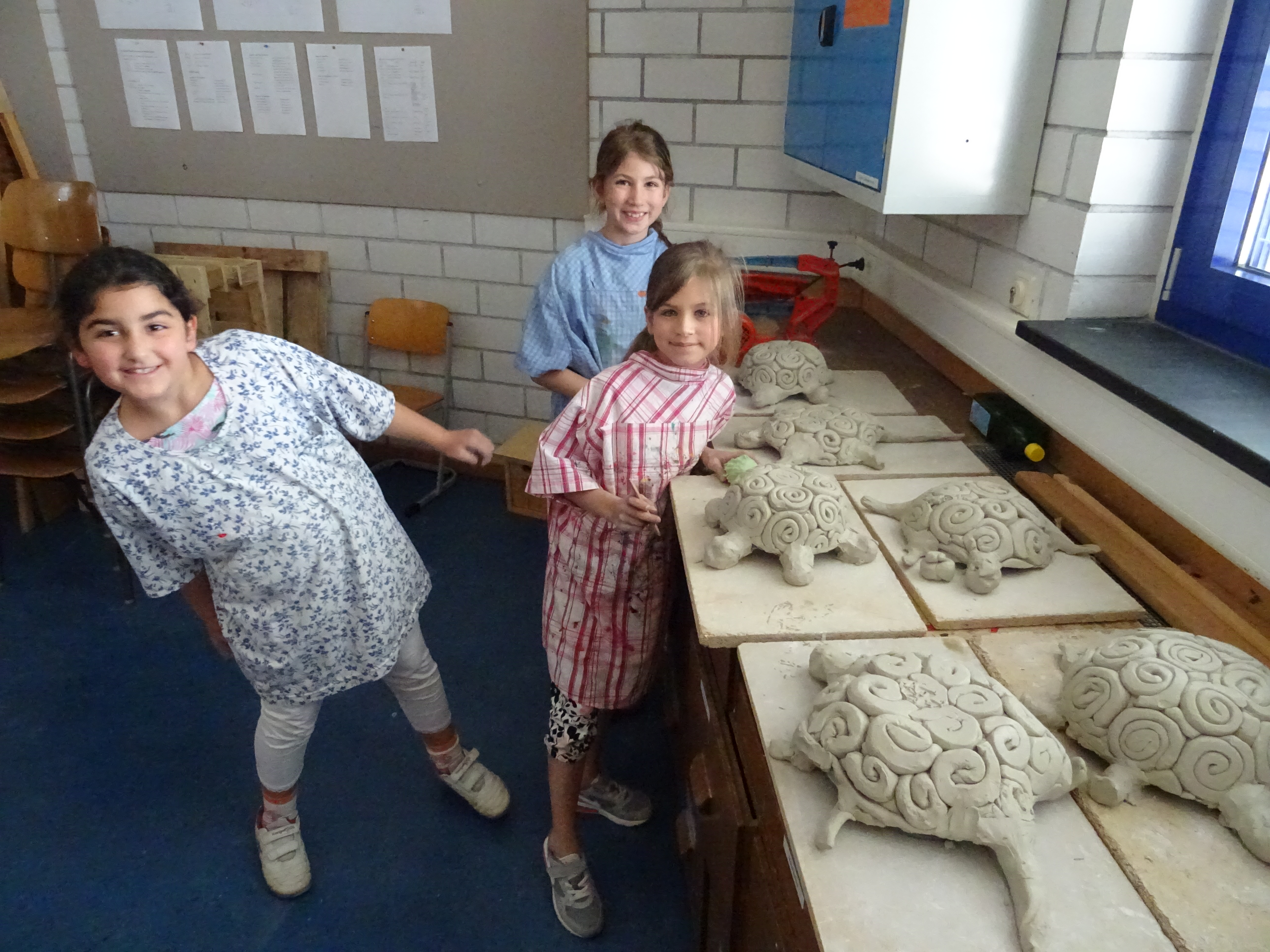 Kreatives aus Ton gestalteten wir in der Werkstatt. Aus Tonwülsten legten wir kleine Schnecken in große Schüsseln und tonten aus diesen dann später wunderschöne Schildkröten, die nun in unserem Schulgarten sitzen und mit uns auf das schöne Wetter warten.
