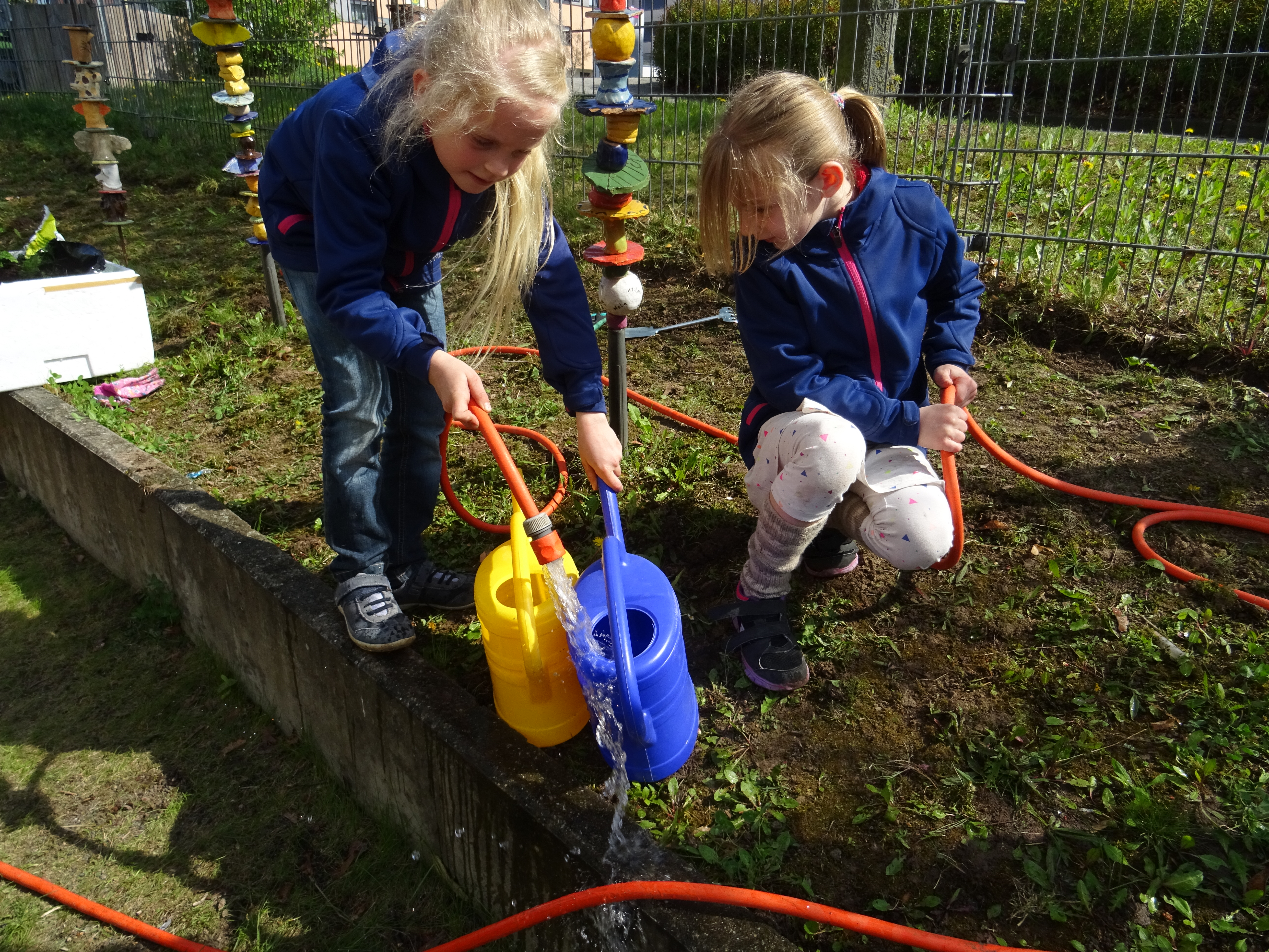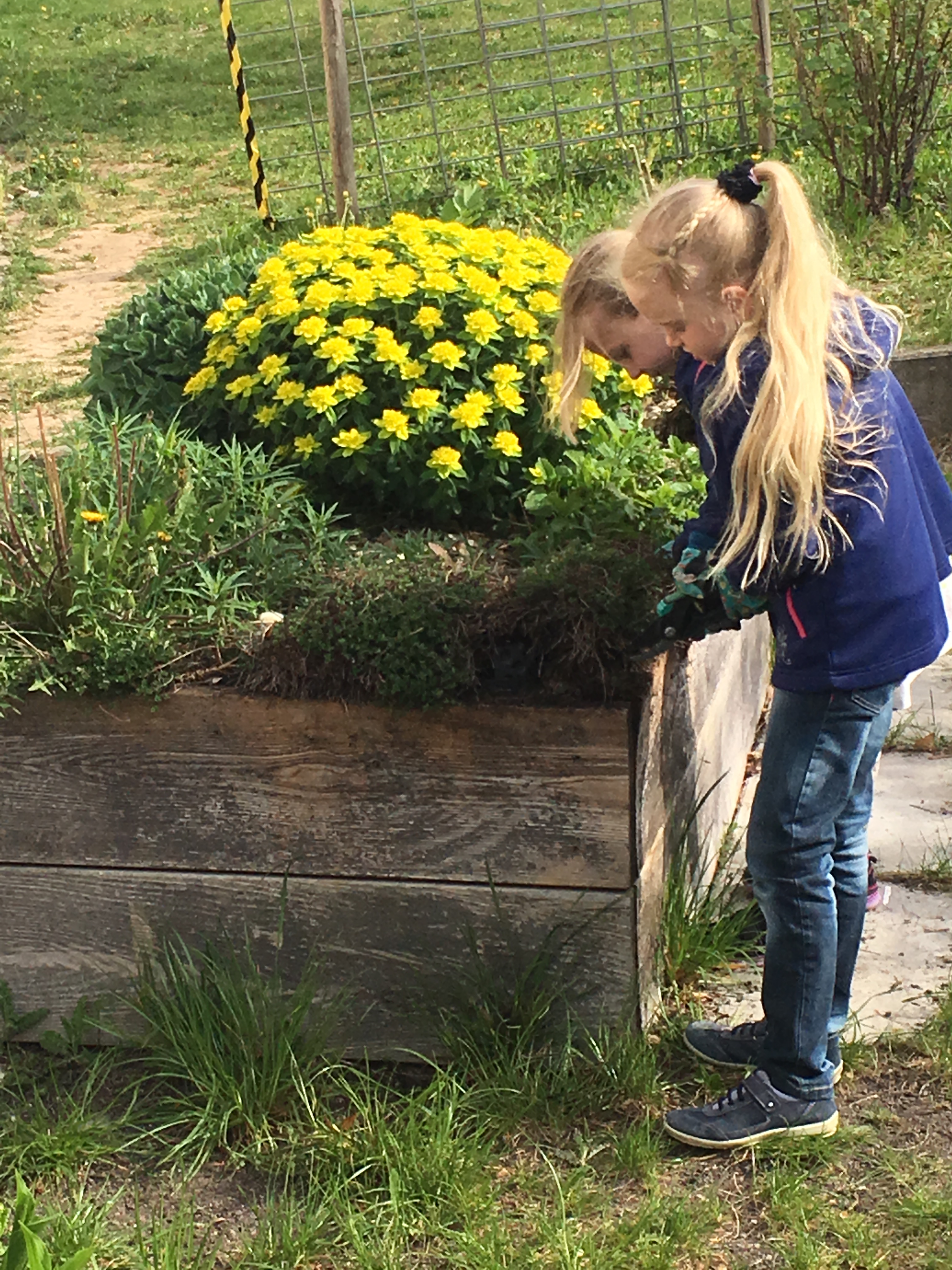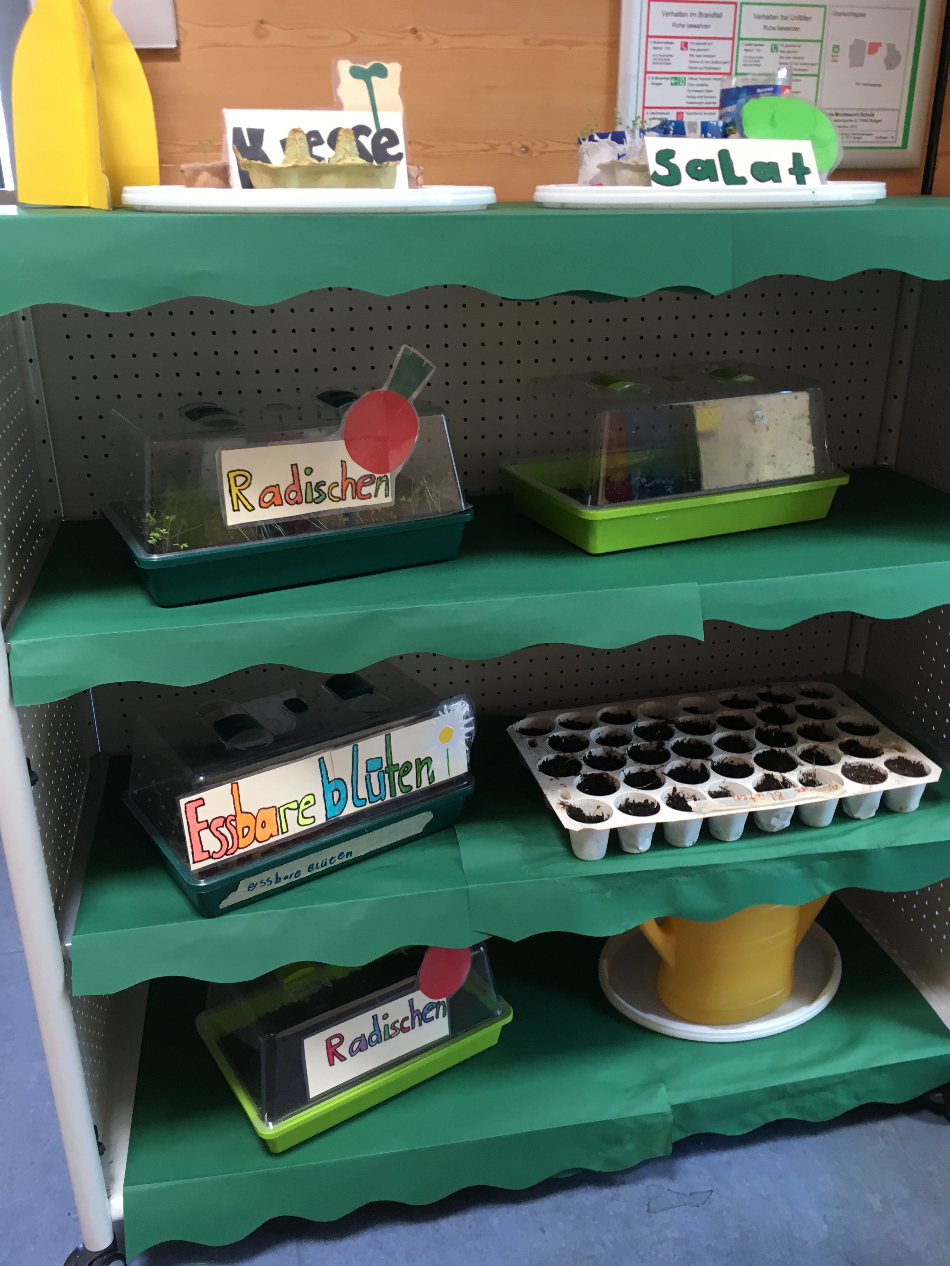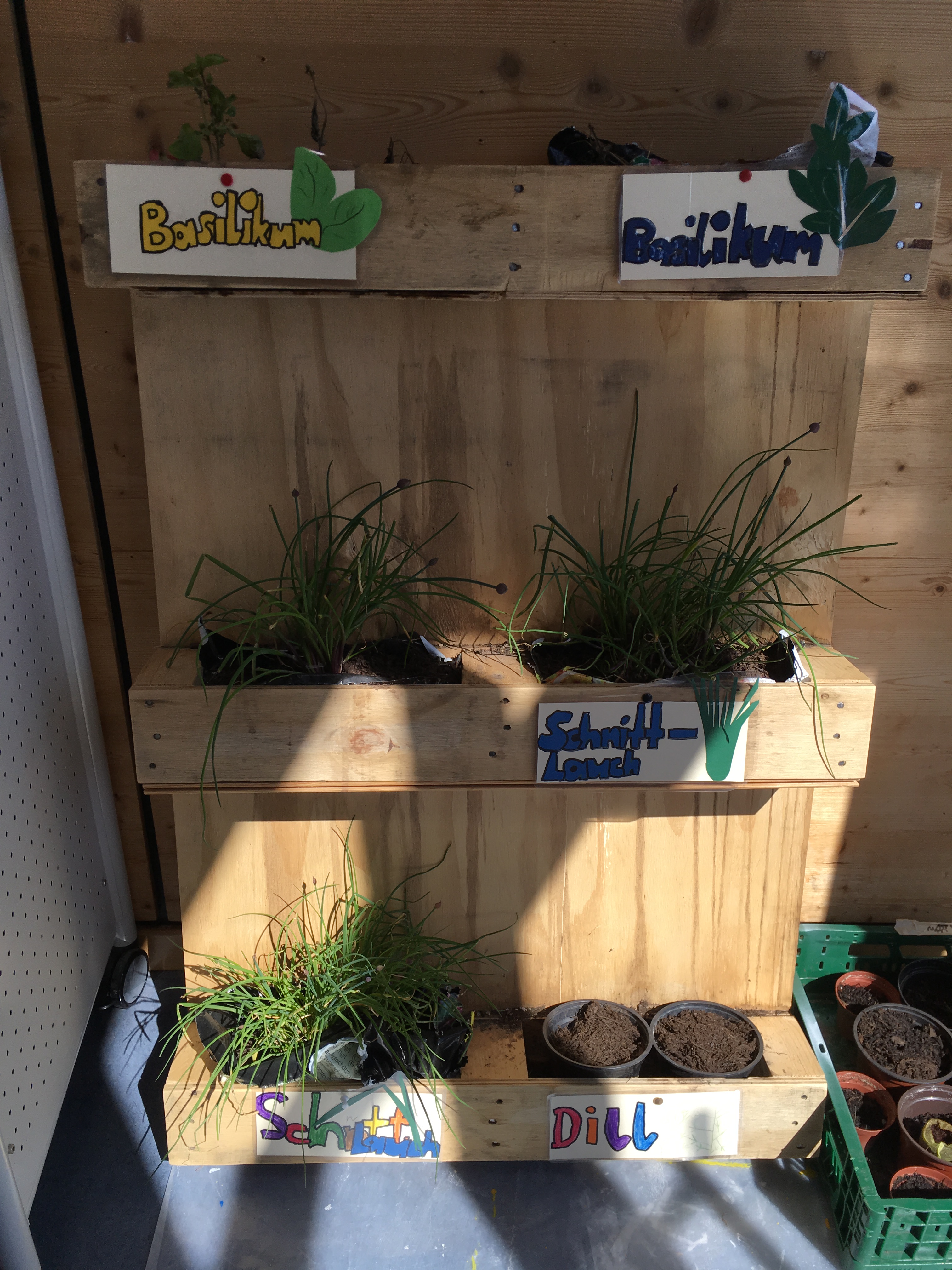 Die Osterferien lagen in diesem Jahr mitten im April, und dieser zeigte sich von seiner besten Seite. April, April macht was er will… somit hatten wir, was das Wetter anging, von allem etwas dabei: Sonne, Regen, Hagel und sogar Schnee. Die Wetterlage passte nicht ganz zu unserem Thema: Alles, was wächst und gedeiht – wir pflegen unseren Schulgarten. Aber wir ließen uns nicht vom unsteten Aprilwetter abhalten. Regenjacken, Schneehosen und Handschuhe an und nichts wie raus in den Schulgarten. Hier arbeiteten wir fleißig mit Schaufeln, Erde, Blumensamen und gingen dem Unkraut an die Wurzeln. Auch unser selbstgebautes Kräuterregal bepflanzten wir mit Basilikum, Schnittlauch und Dill. In unseren Mini-Gewächshäusern zogen wir aus verschiedenen Samen Zöglinge von Kräutern und Blumen, die wir bald nach draußen setzen wollen.