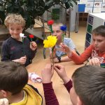 Und nicht nur die Blumensamen in unseren verschiedenen Töpfchen begannen zu wachsen, auch die selbstgebauten Türme in der Turnhalle wuchsen in die Höhe. Gemeinschaftlich bauten wir hohe Türme und stellten uns anschließend unserer Bauprojekte vor. Dafür hatten wir in der Turnhalle schön viel Platz.