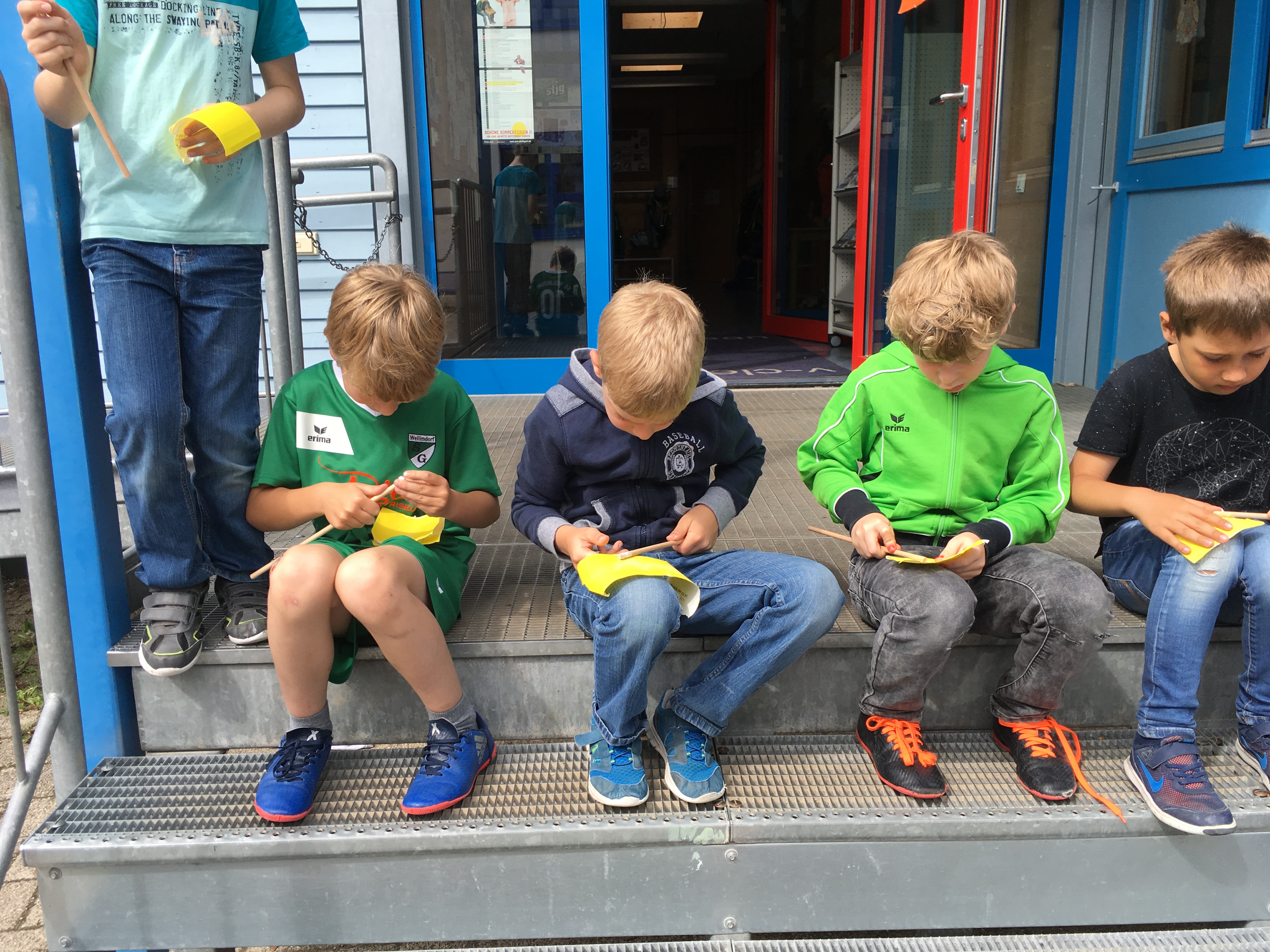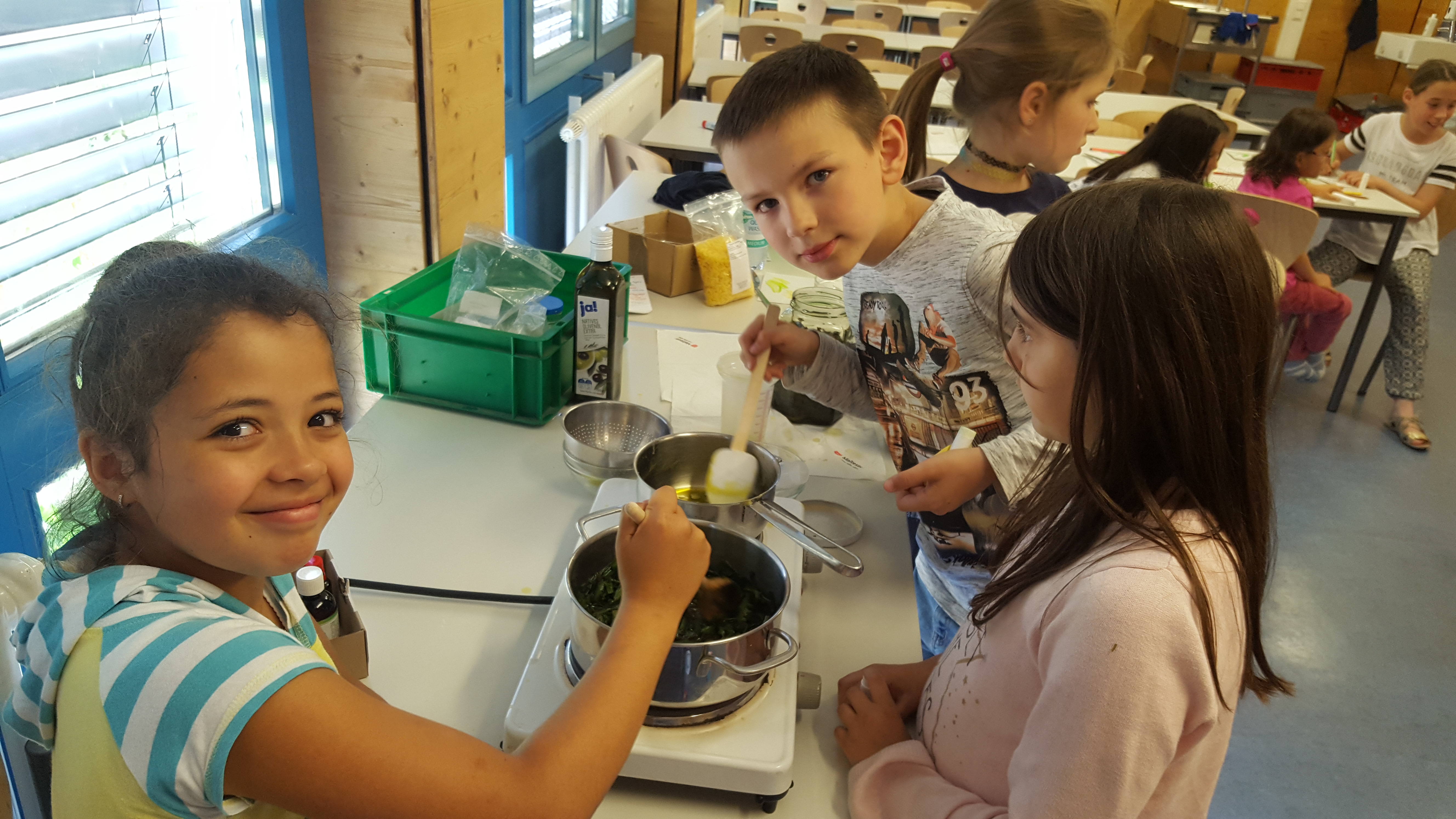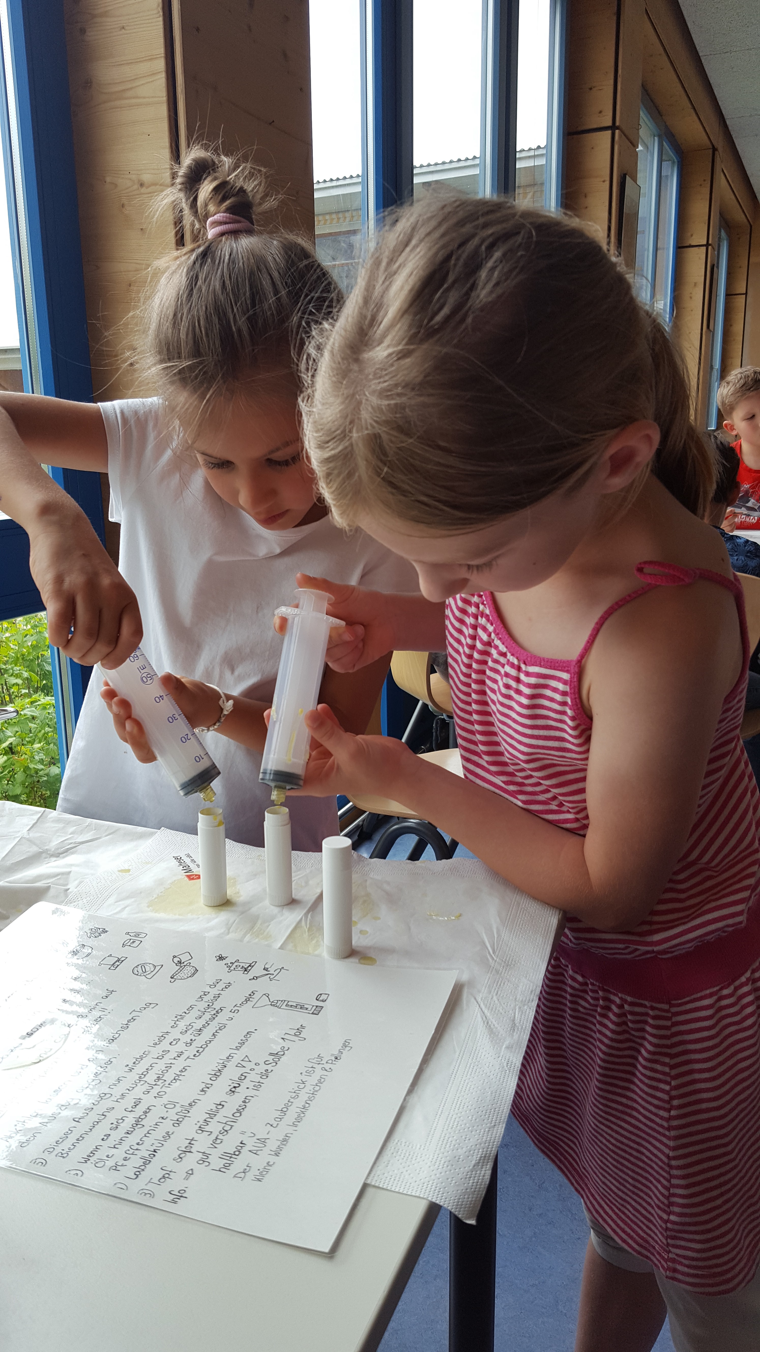 Toll war auch die Erfindung mit Heilkräutern. Wir sammelten z.B. Spitzwegerich auf den Wiesen rund um die Schule und krierten unseren eigenen „Aua Stick“. Hierzu verarbeiteten wir die gesammelten Kräuter in Kombination mit heißem Bienenwachs und füllten die Mischung in leere Lippenstifthülsen. Das Ergebnis konnte sich sehen lassen und wir haben den einen oder anderen Mückenstich sofort damit behandelt.