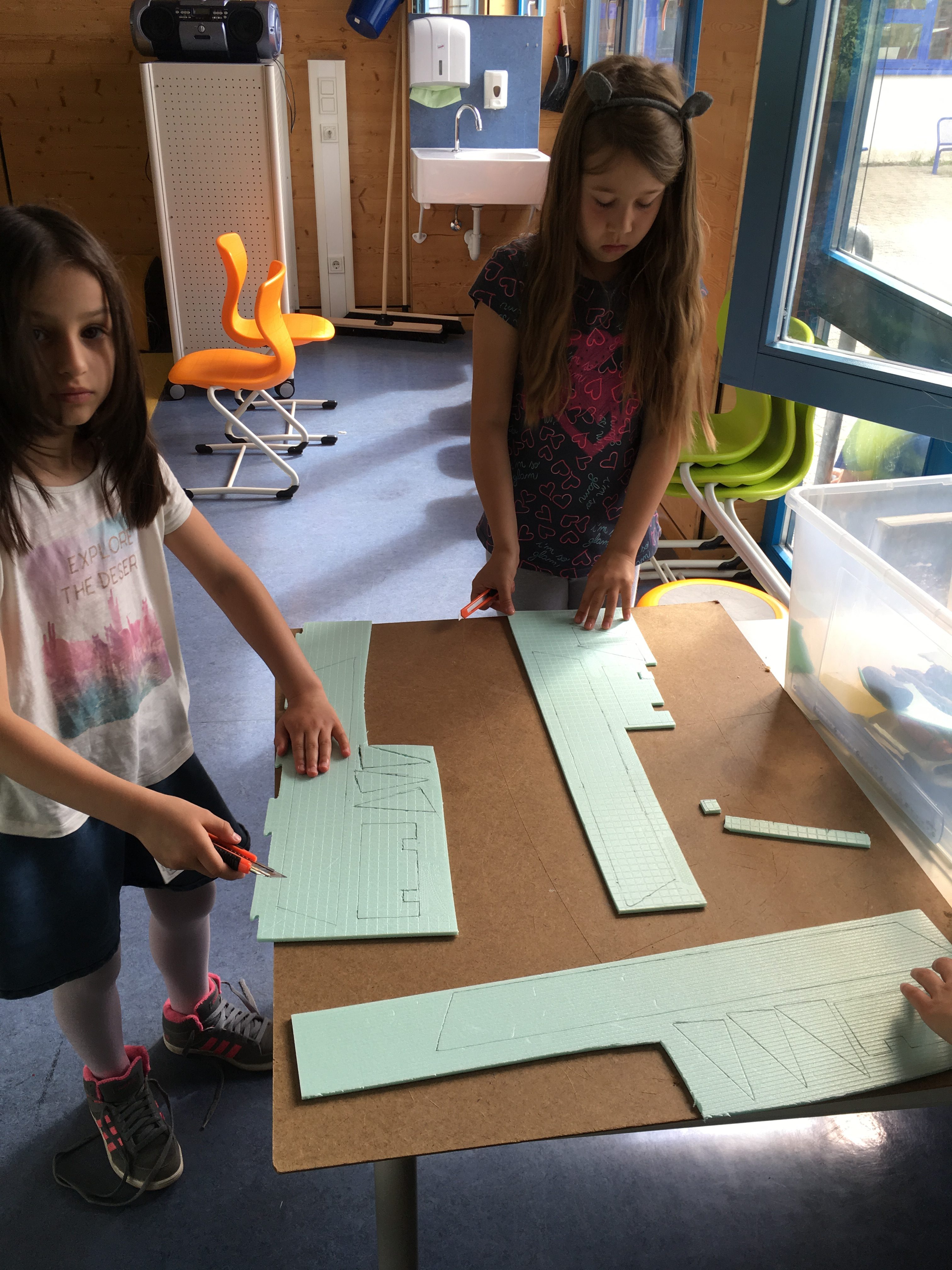 Mit unseren selbst gebauten Segelfliegern aus Styropor und Holz ging es hoch hinaus in die Lüfte. Aber zuvor stand die Arbeit! Es war gar nicht so einfach, die Anleitung genau zu lesen und die einzelnen Schritte dann auszuführen. Wir mussten Holzstangen in verschiedenen Längen sägen, Styropor nach Schablonen zuschneiden und dann all diese Teile zu einem Segelflieger zusammensetzen und fixieren. Das Sägen mit der Handsäge machte besonders Spaß. Sobald wir wussten, dass es keinen Sinn macht, mit großer Kraft und starkem Druck die Säge zu führen, ging alles viel leichter von der Hand und die Stäbe waren im Nu durchgesägt. Sobald ein Segelflieger fertig war, probierten wir diesen aus. Natürlich gab es auch viele Bruchlandungen, aber gekonnt reparierten wir alle und schon war der Segelflieger wieder in der Luft unterwegs.