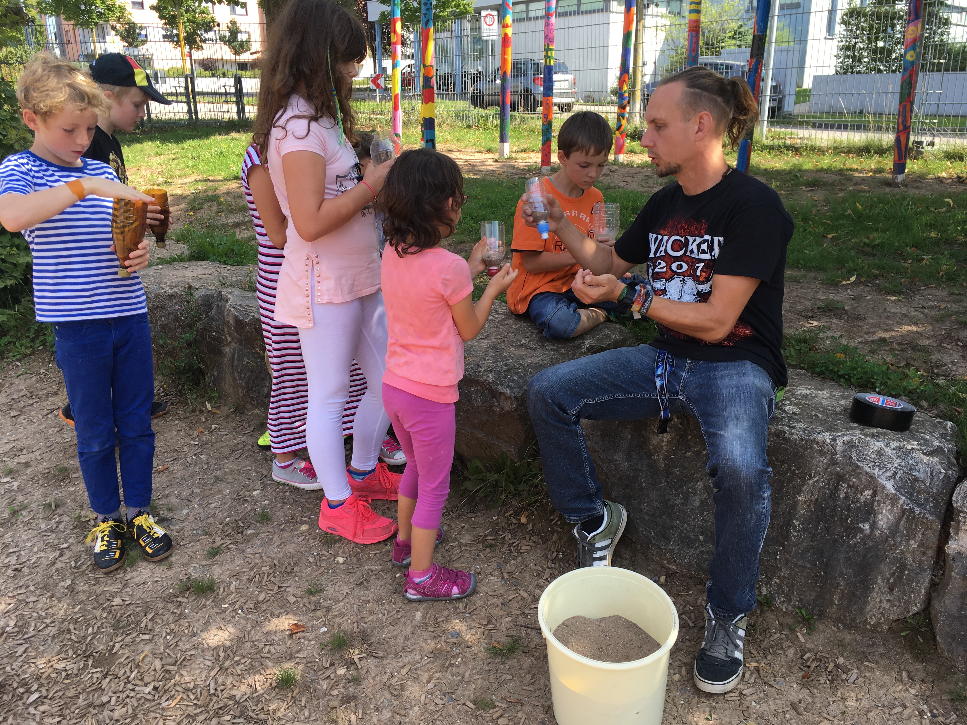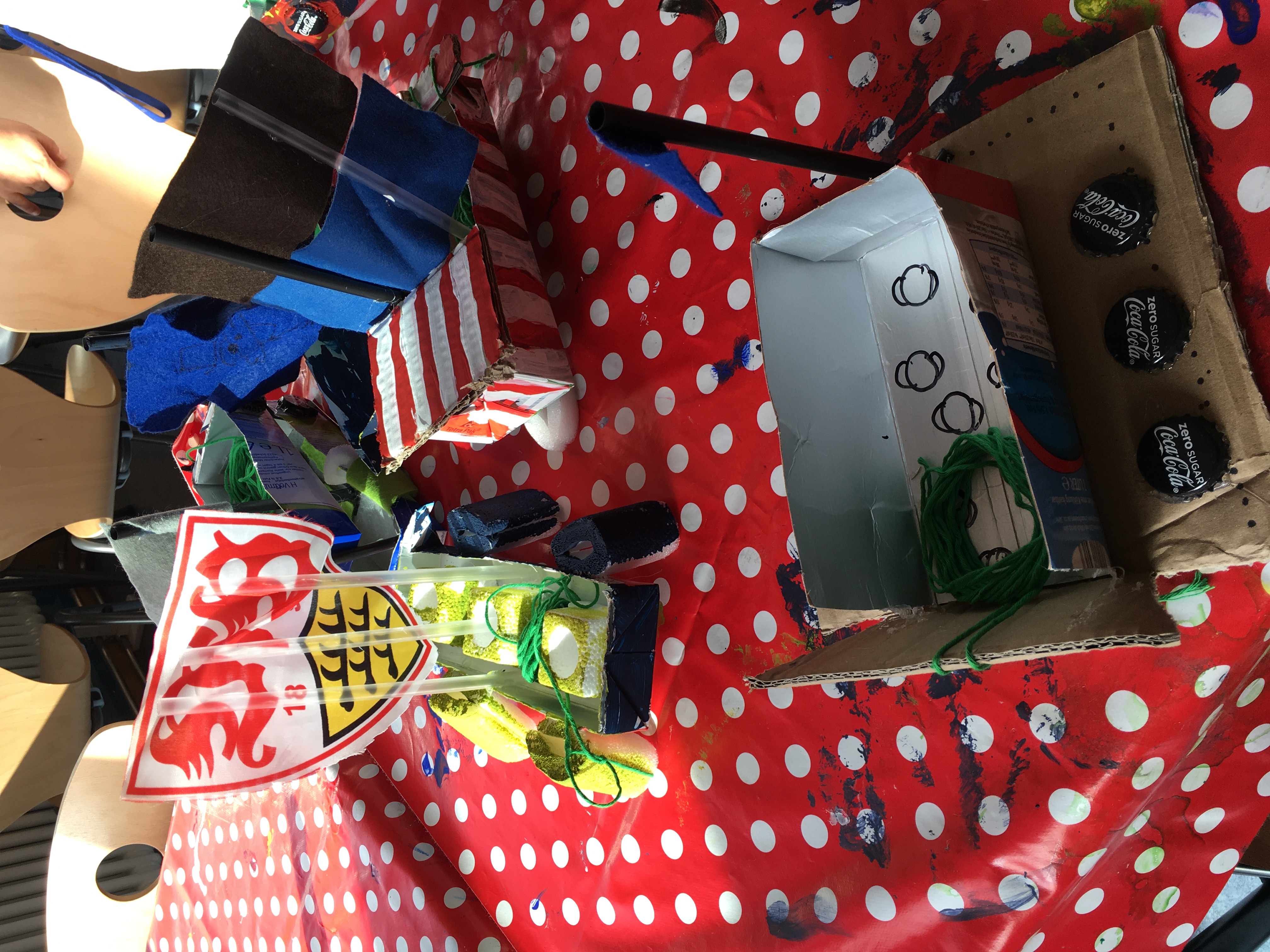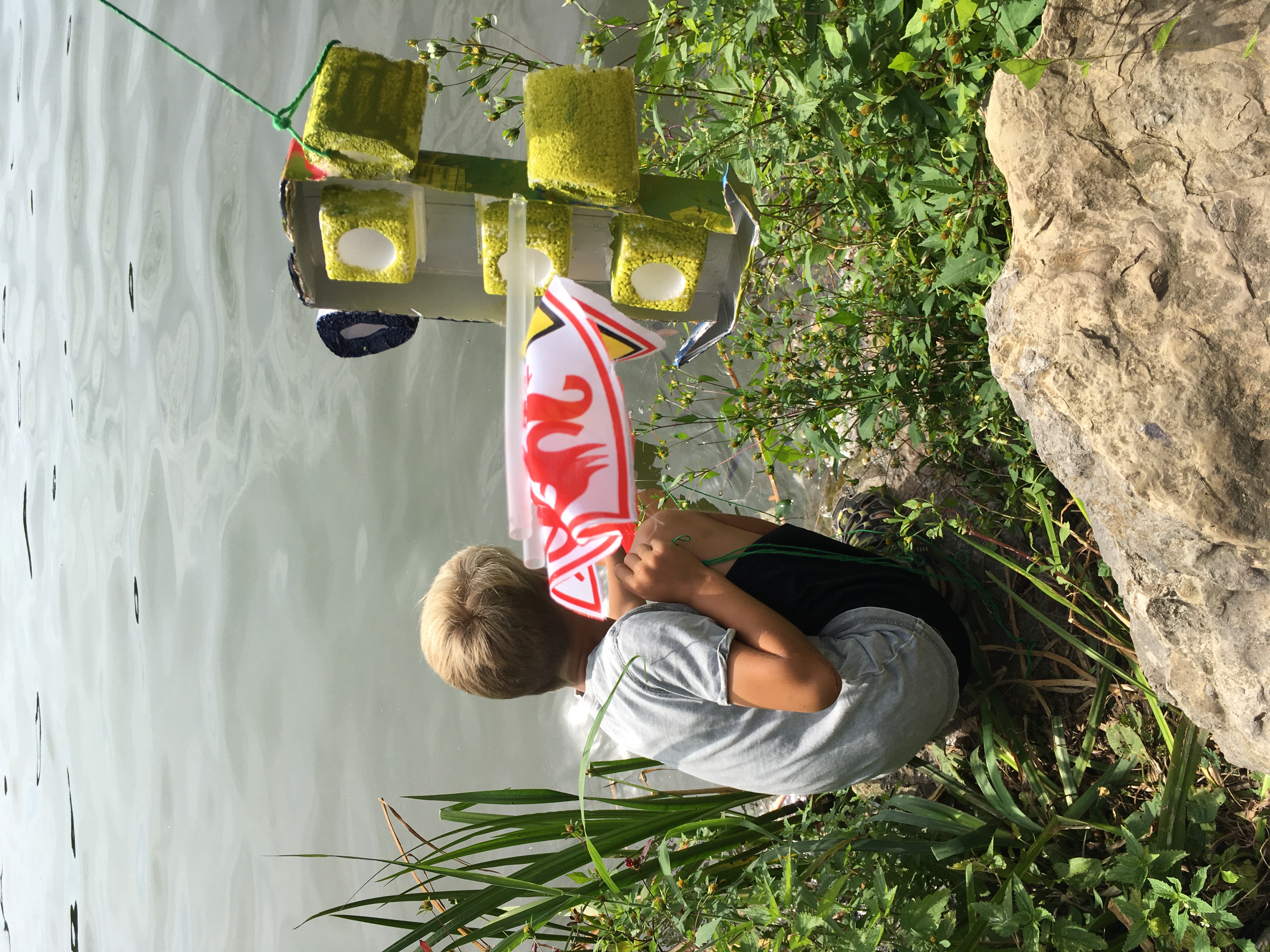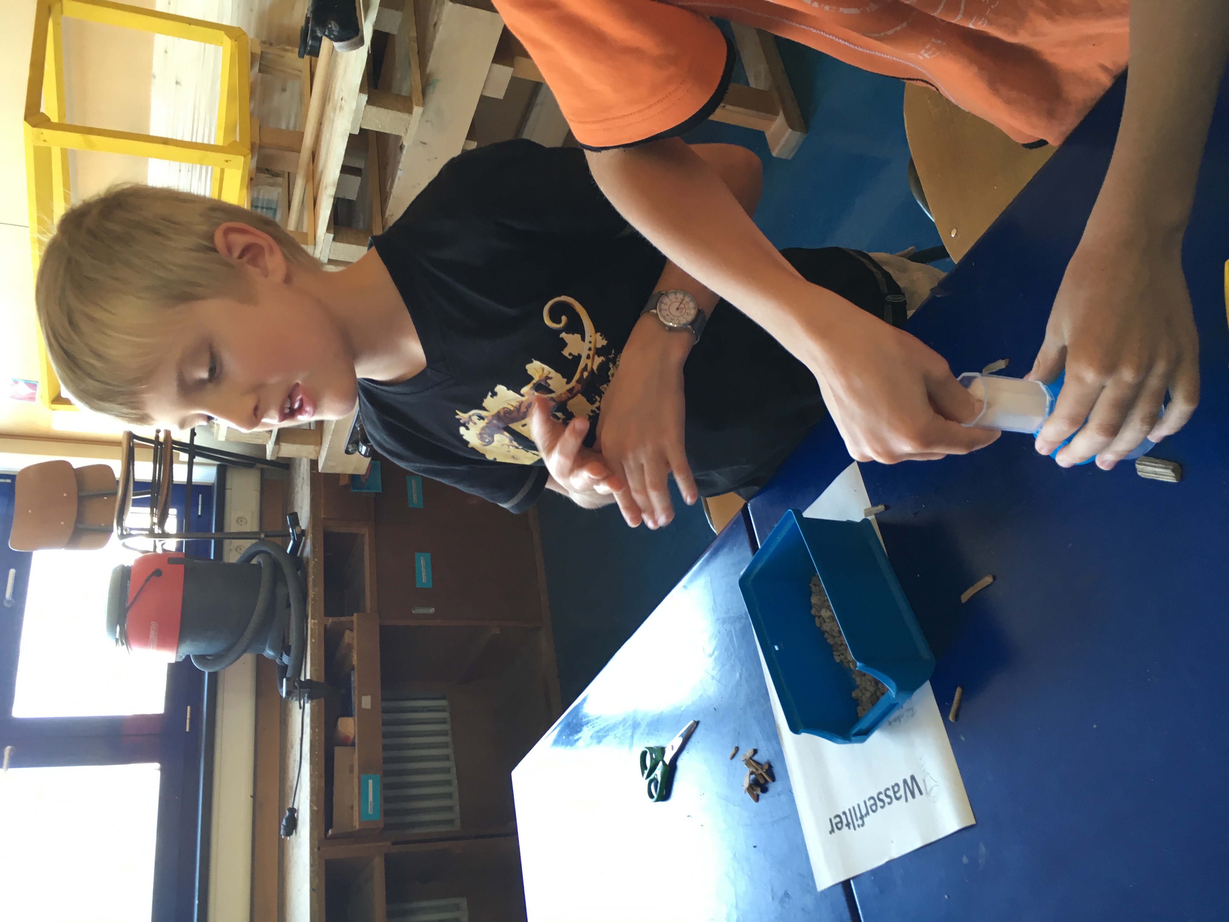 Ein Highlight war sicher der Bau der Unterwasserwelt – eine Snoozelecke im Pavillon. Es wurden Kissenbezüge genäht und mit Stofffarben und eigens hergestellten Stempeln bedruckt und Holzbalken gesägt und zusammengeschraubt. Tag um Tag wurde fleißig gearbeitet und das Ergebnis kann sich sehen lassen! Eine Unterwasser –Snoozelecke zum Relaxen und Entspannen. Die Snoozelecke ist schon jetzt ein begehrter Platz in den Pausen und Entspannungsphasen und wir können uns das Schulleben schon gar nicht mehr ohne unsere Unterwasserwelt vorstellen. Beim Bootsbau aus Tetrapacks, Styropor und Kronkorken wurden tolle Boote gebaut, die wir bei unserem Ausflug zum Max Eyth See auf den Leiterwagen packten und diese dann auf dem See schwimmen ließen. Am Ausflugstag war herrliches Sommerwetter und wir ließen uns auf der Wiese direkt beim Klassenzimmer im Grünen nieder. Schnell hatten alle ihre Badesachen angezogen und plantschten in dem neu angelegten Wasserbecken mit Zulauf zum See. Die Experimente rund um das Thema Wasser waren manches mal fast zauberhaft. Wenn weiße Blumen plötzlich blau wurden oder das Öl sich langsam wieder vom Wasser trennte um dann ganz oben im Glas zu schwimmen, wurde dies doch sehr bestaunt. Die selbst gebauten Wasserfilter funktionierten tatsächlich. Das Wasser wurde oben verschmutzt eingefüllt und kam unten klar und sauber wieder an.