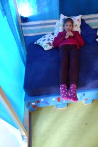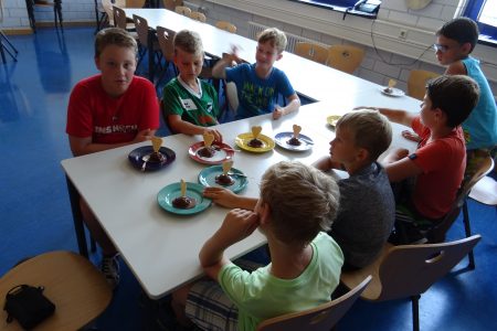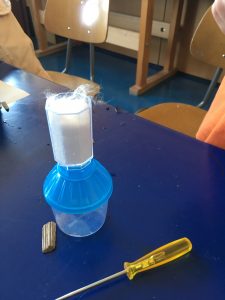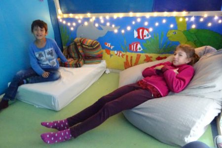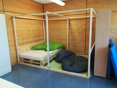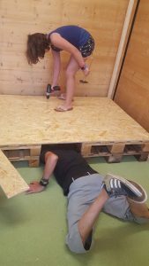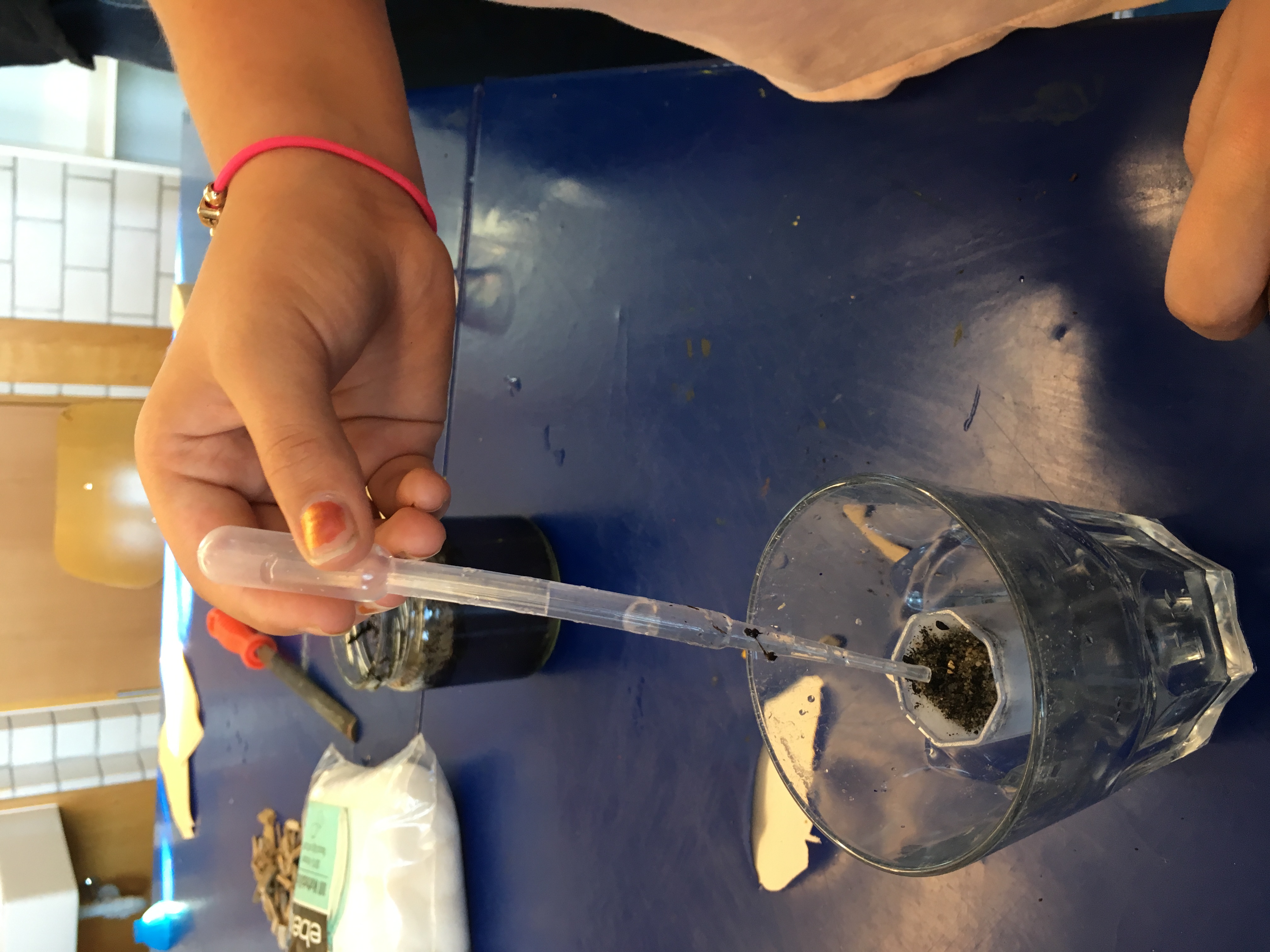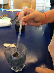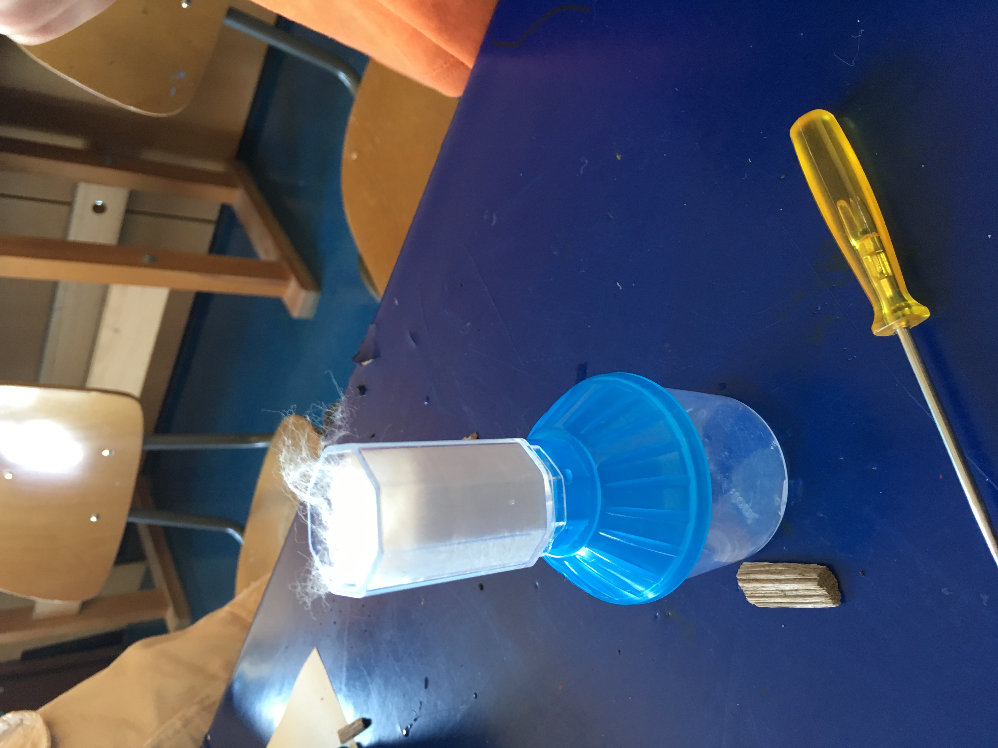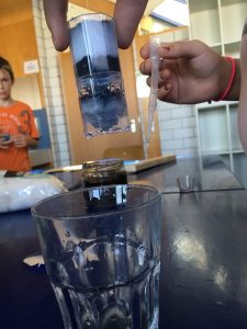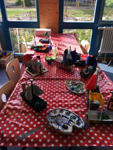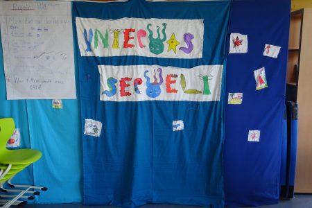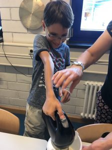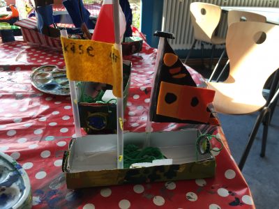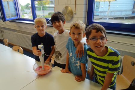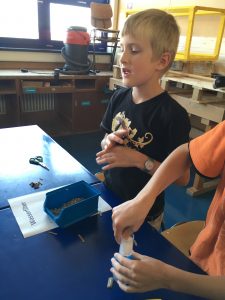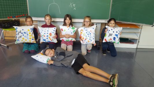 Ein Highlight war sicher der Bau der Unterwasserwelt – eine Snoozelecke im Pavillon. Es wurden Kissenbezüge genäht und mit Stofffarben und eigens hergestellten Stempeln bedruckt und Holzbalken gesägt und zusammengeschraubt. Tag um Tag wurde fleißig gearbeitet und das Ergebnis kann sich sehen lassen! Eine Unterwasser –Snoozelecke zum Relaxen und Entspannen. Die Snoozelecke ist schon jetzt ein begehrter Platz in den Pausen und Entspannungsphasen und wir können uns das Schulleben schon gar nicht mehr ohne unsere Unterwasserwelt vorstellen. Beim Bootsbau aus Tetrapacks, Styropor und Kronkorken wurden tolle Boote gebaut, die wir bei unserem Ausflug zum Max Eyth See auf den Leiterwagen packten und diese dann auf dem See schwimmen ließen. Am Ausflugstag war herrliches Sommerwetter und wir ließen uns auf der Wiese direkt beim Klassenzimmer im Grünen nieder. Schnell hatten alle ihre Badesachen angezogen und plantschten in dem neu angelegten Wasserbecken mit Zulauf zum See. Die Experimente rund um das Thema Wasser waren manches mal fast zauberhaft. Wenn weiße Blumen plötzlich blau wurden oder das Öl sich langsam wieder vom Wasser trennte um dann ganz oben im Glas zu schwimmen, wurde dies doch sehr bestaunt. Die selbst gebauten Wasserfilter funktionierten tatsächlich. Das Wasser wurde oben verschmutzt eingefüllt und kam unten klar und sauber wieder an.