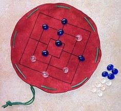 War es zu Ritterszeiten langweilig, so spielten die Ritter gerne mal ein Spiel, wie z.B. Mühle. Mühle ist ein wirklich altes Spiel und wurde früher natürlich nicht auf solch einem Spielbrett wie heute gespielt, sondern auf einem Stück Leder mit echten Steinen. Und genau so etwas bastelten die Kinder sich für zuhause oder für den Schulhof. Anstatt des Leders zauberten sie eine Reisevariante aus Stoff. Dafür schnitten sie erst Stoff mit Hilfe eines Schnurzirkels zurecht, um dann das Spielfeld in die Mitte des Kreises zu zeichnen. Damit das Spiel auch transportfähig wurde, flochten die Bastlerinnen Schnüre, die sie an die Kreise nähten. So war es möglich aus den Stoffkreisen einen kleinen Beutel zu machen. Jetzt fehlten noch die passenden Glassteine und fertig war ein individuelles Mühlespiel, das mit nach Hause genommen werden konnte.