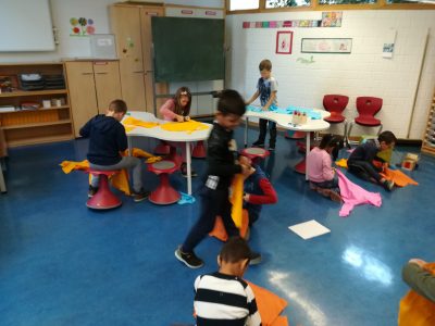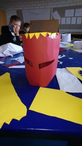 In den Herbstferien wiemete sich die Feriengruppe dem Thema ‚Ritter und Burgfräuleins‘ im Pavillon der Ganztagsschule in Hausen. Kaum waren die angehenden Ritter da, verschwanden einige von ihnen umgehend in der Werkstatt. Hier bastelten sich die Ritter echte Helme aus buntem Papier und bemalten diese dann ganz unterschiedlich.