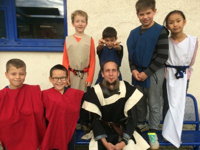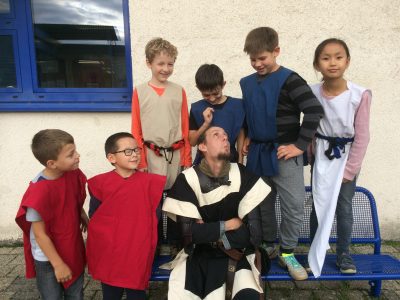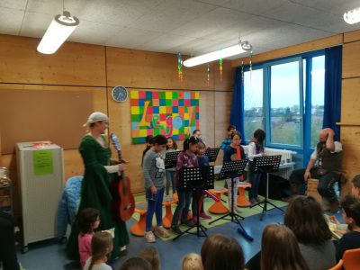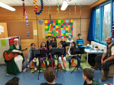 Wie auch ein Ritter auf Reisen war, so waren auch zwei Musiker, zu Ritterszeiten auch Spielleute genannt, auf dem Weg zu uns an die Maria Montessori Schule.