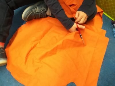Der selbstgenähte Wappenrock fehlte bei fast allen Rittern aus Hausen, so dass es in der Nähwerkstatt recht schnell recht voll wurde. Die Kinder nahmen gegenseitig Maß, um die Wappenröcke in der richtigen Größe zuzuschneiden, zu nähen und zu versäubern. Der Wappenrock gehörte zu Ritterszeiten zur Ausstattung eines jeden Ritters und zeigte den Menschen oder seinen Gegnern im Kampfe, für welchen König oder Fürst der Ritter arbeitete oder kämpfte. Das Zuschneiden und Nähen hat den Kindern großen Spaß gemacht.