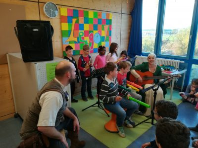 Die Spielleute Julia Groth (Julia die Augenweide) und Dominic Heinze (DomDom) der Mittelalterband „Wildfang“ haben gemeinsam mit den Kindern eigene Lieder, zu Themen, die die Kinder bewegten, geschrieben. Eines handelte von Rapunzel und dem Prinz, der sie befreite und das andere von einem Rappen Namens „Wildfang“. Das Highlight war natürlich die Vorführung der Meisterwerke vor den anderen Kindern und Erwachsenen und so präsentierten am Donnerstag die “Montessori Mäuse“ und am Freitag die „Wilden Eichhörnchen“ zusammen mit den Spielleuten ihre Werke. Der Jubel war natürlich vorprogrammiert und die Rufe nach Zugaben waren nicht zu überhören. Auch das war ein tolles Angebot für die Kinder.
