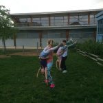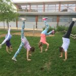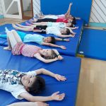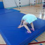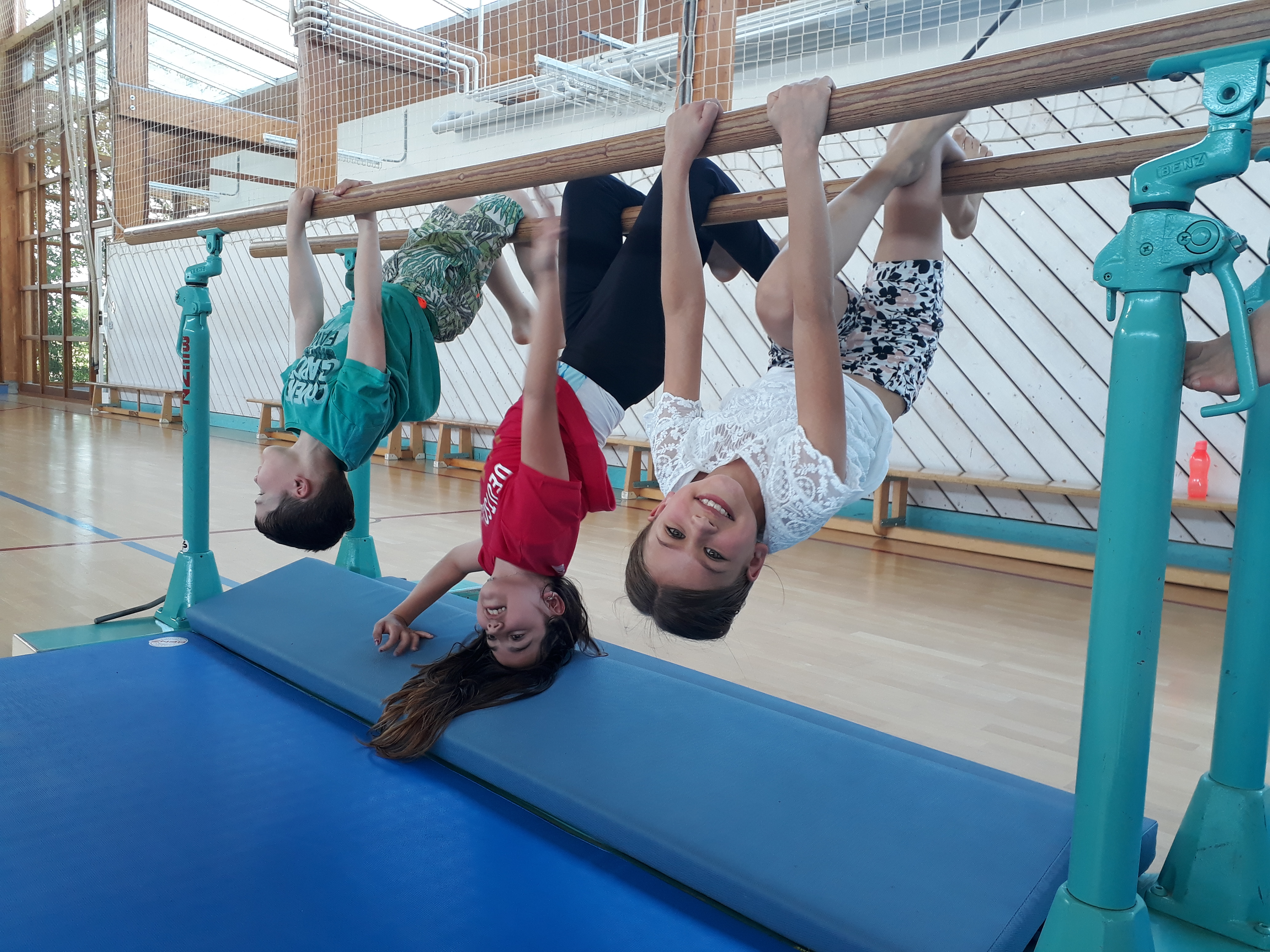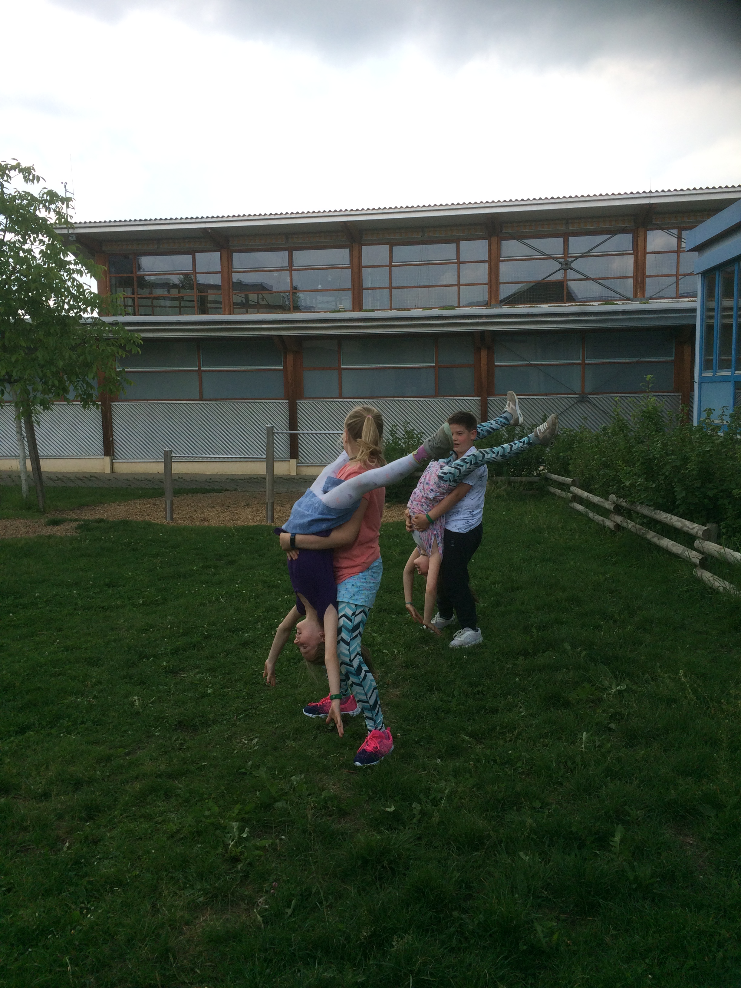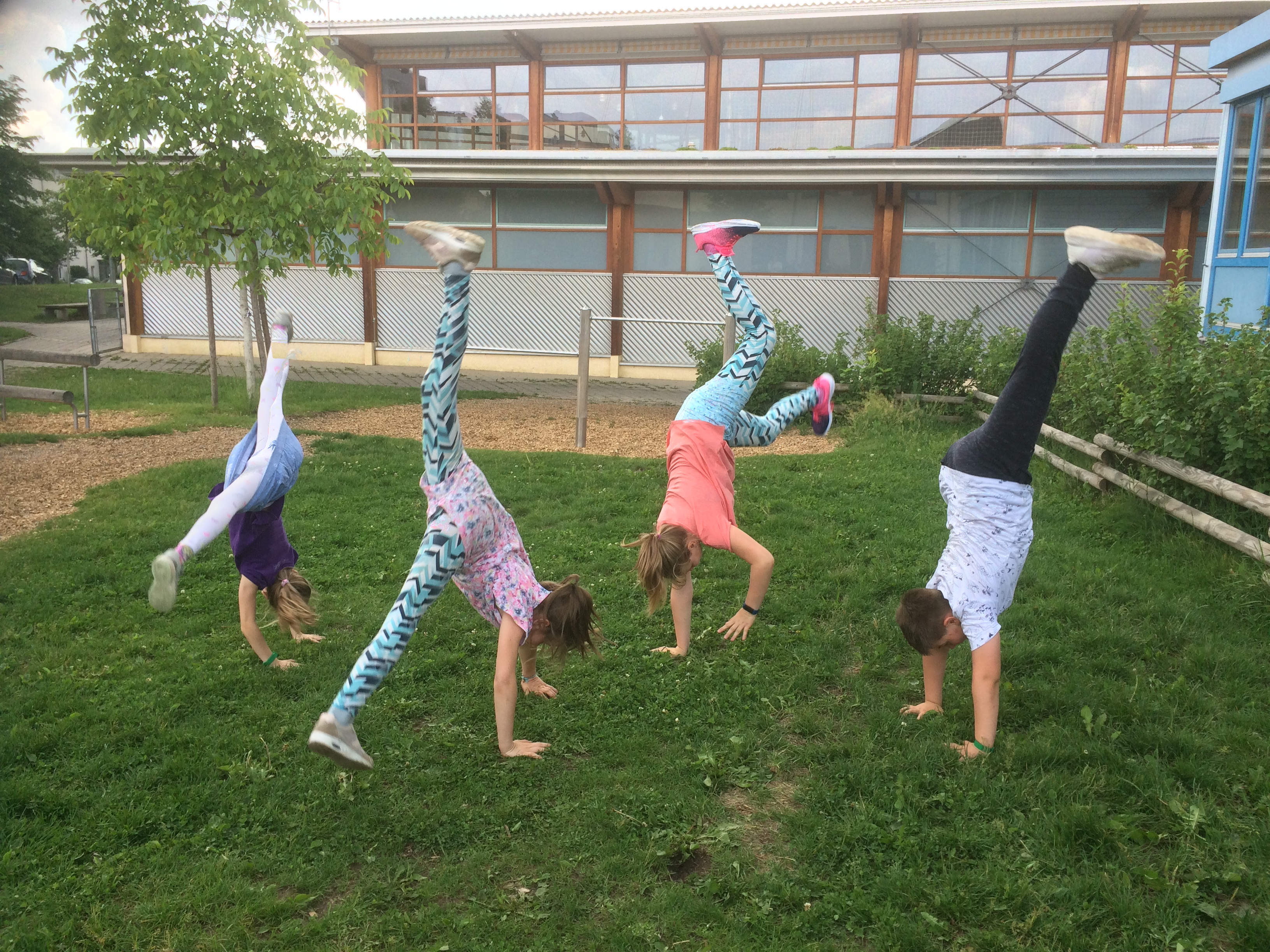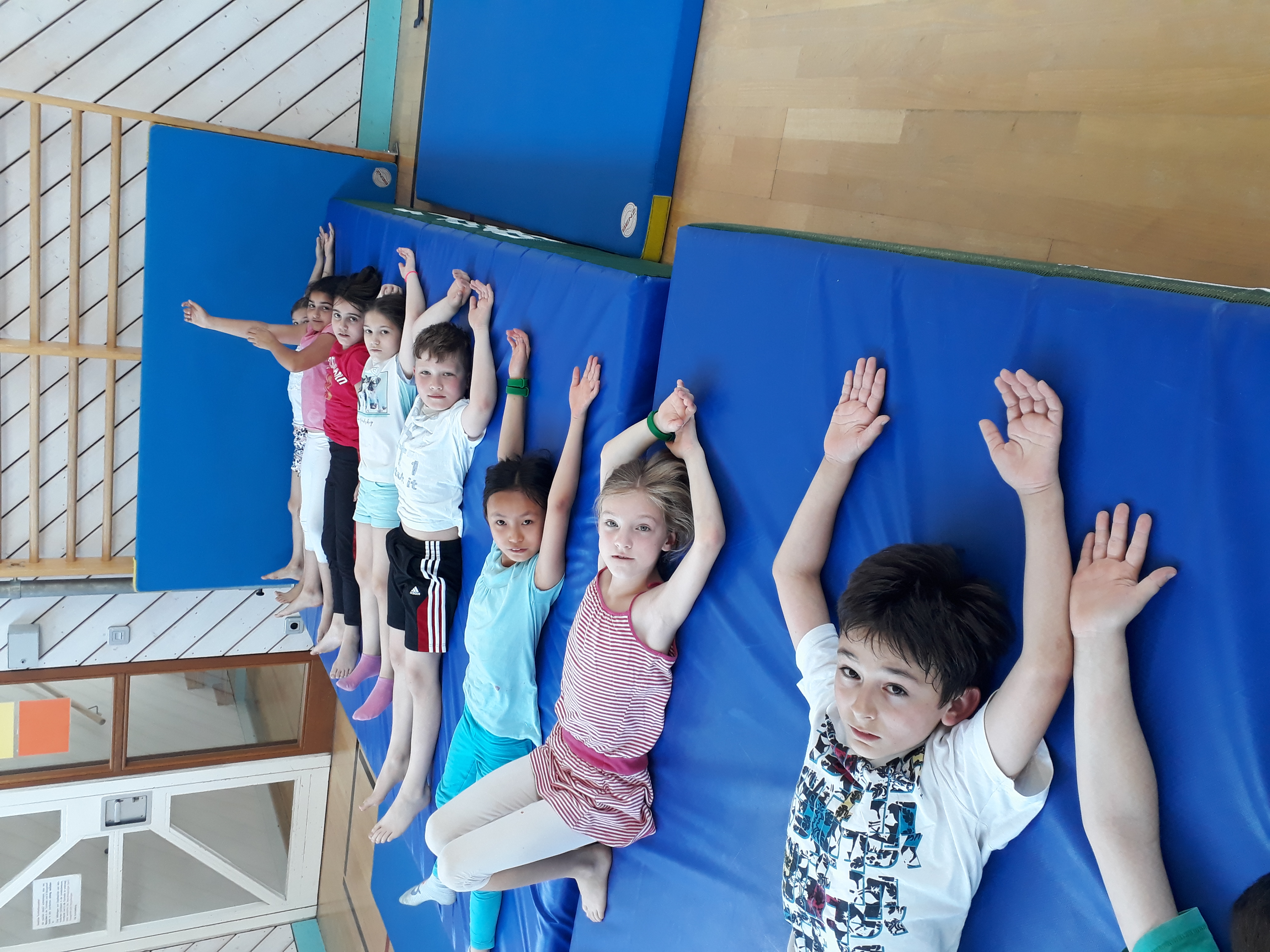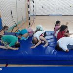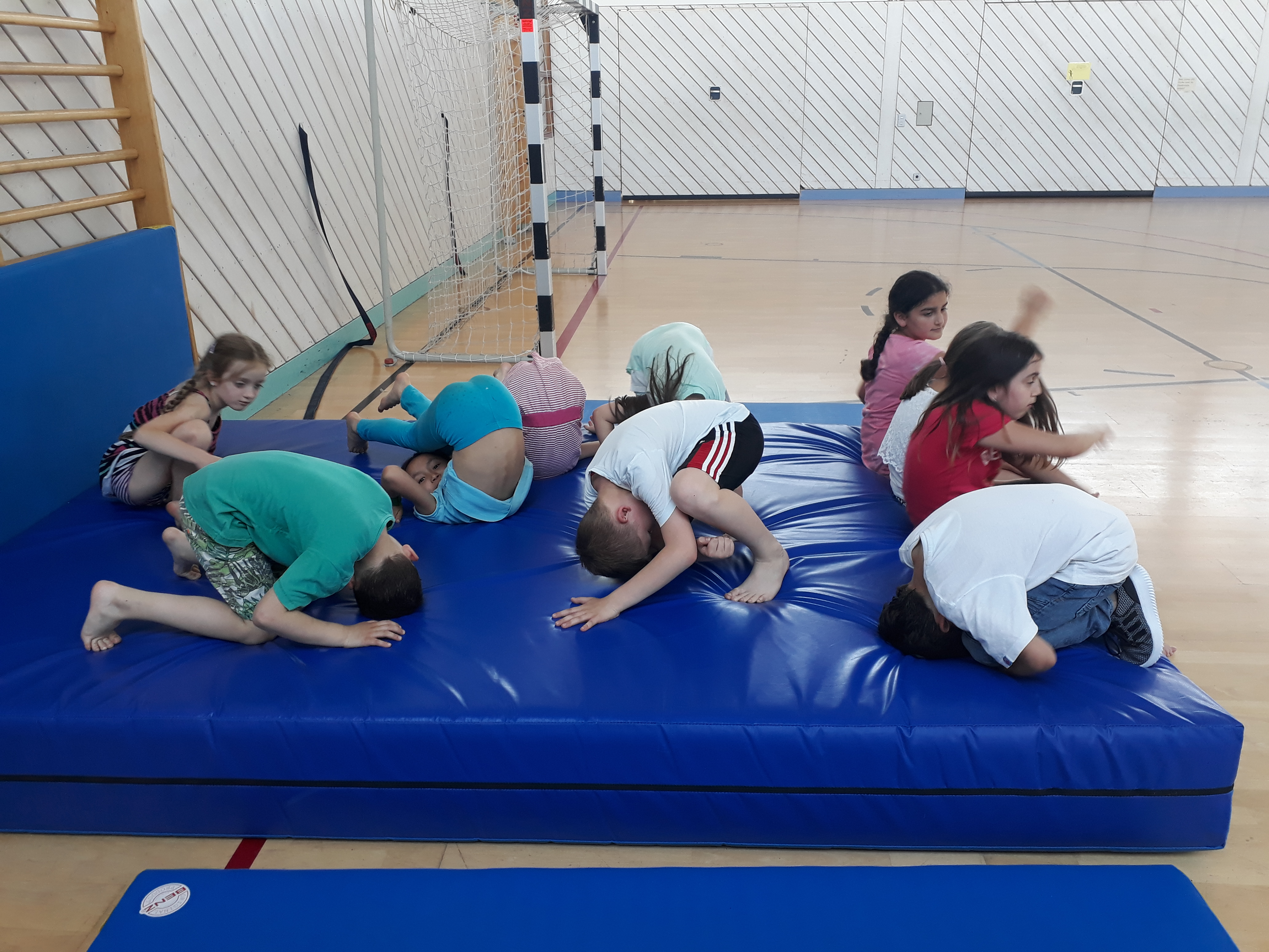 Beim „Rollen mit dem eigenen Körper“ wiederholten und übten die Kinder die bekannte Rolle vorwärts und rückwärts, spielten einige neue Spiele und erlernten neue komplexere Roll-techniken (Schräg-Rolle). Die dicken blauen Matten in der Turnhalle waren hier eine ideale Unterstützung, da die Kinder praktisch ohne Anstrengung abrollen konnten. Dank des sonnigen Wetters übten die Kinder auch im kühlen Schatten. Hier bot es sich an, draußen auf der Wiese zu üben und die natürliche schiefe Ebene des Geländes als Hilfe zu nutzen. Lustige Spiele wie Mausefalle, Körper drehen, Burgball, das Detektivspiel oder Eckenschleichen begleiteten die Ferienkinder dabei.