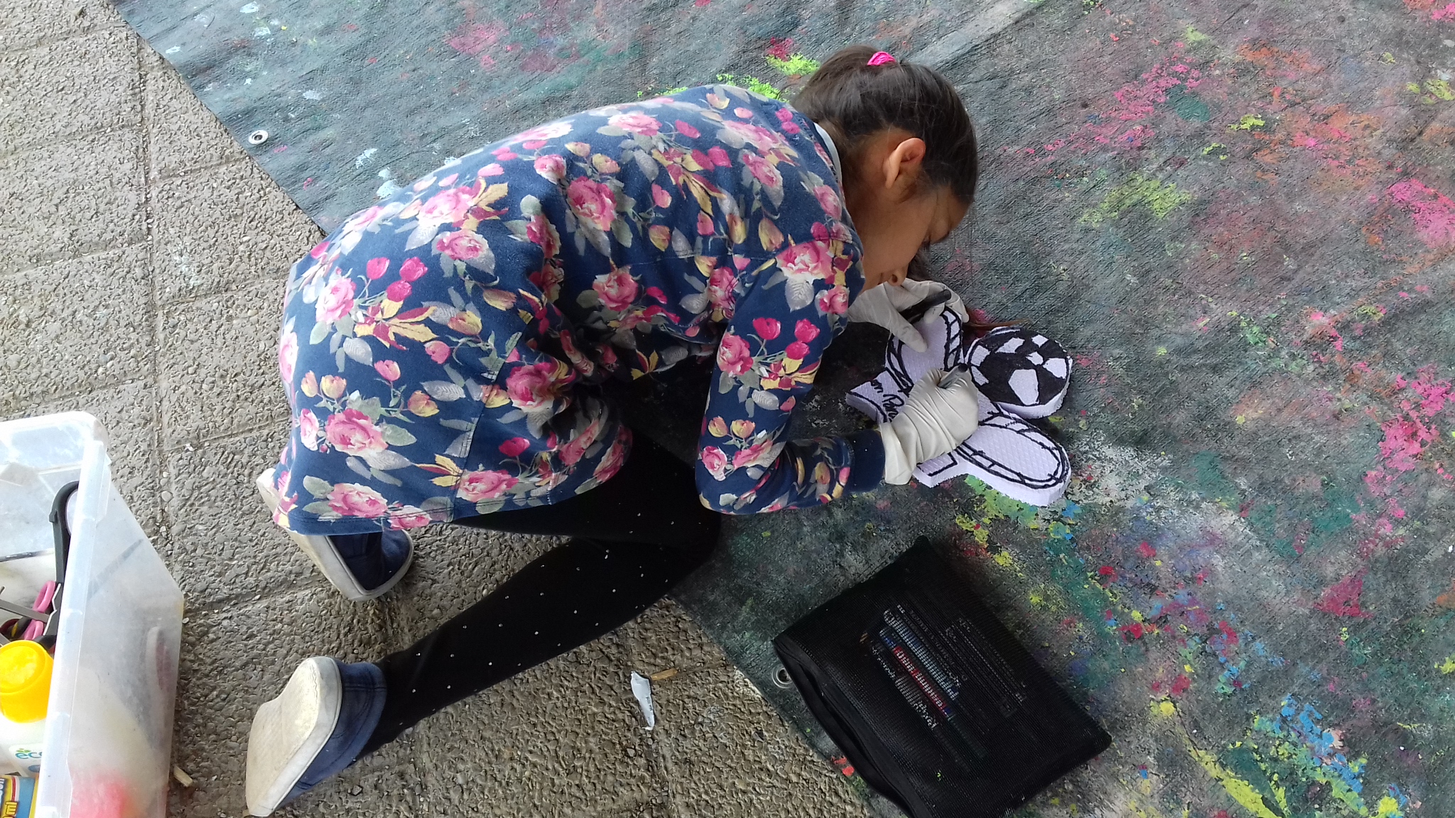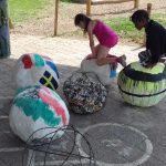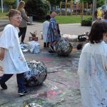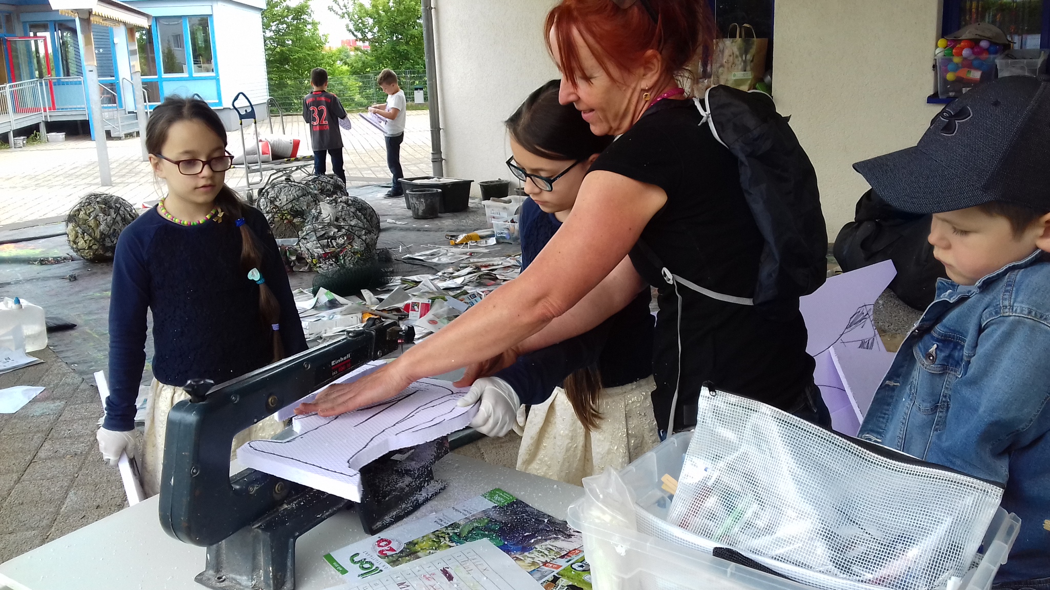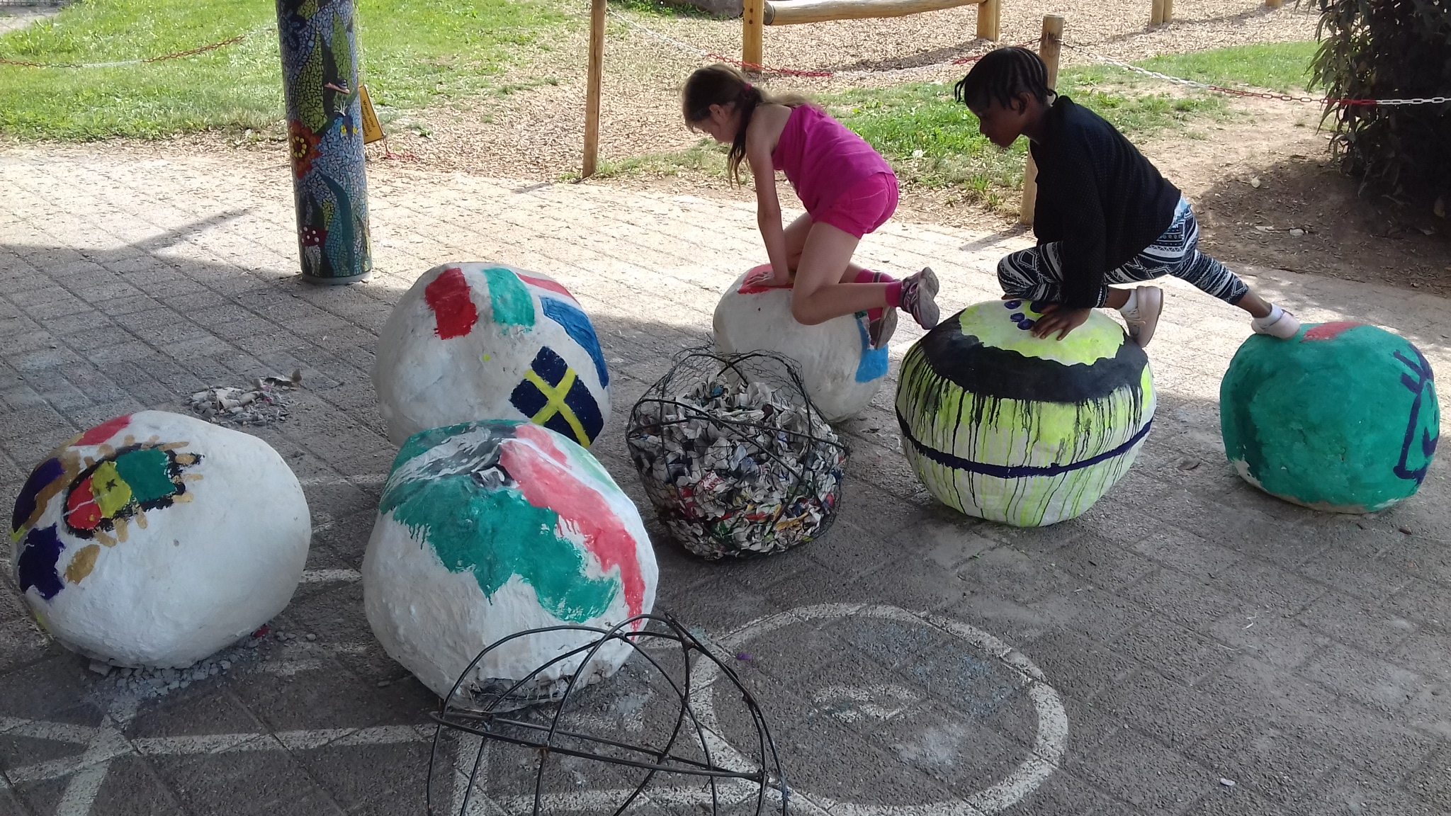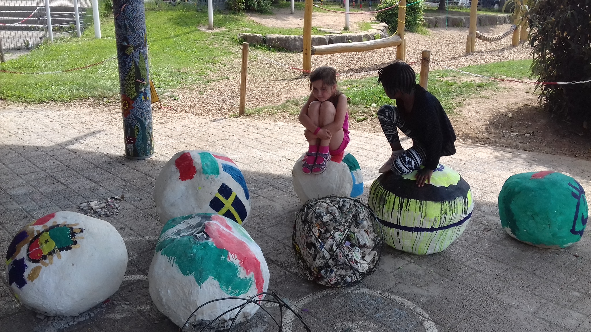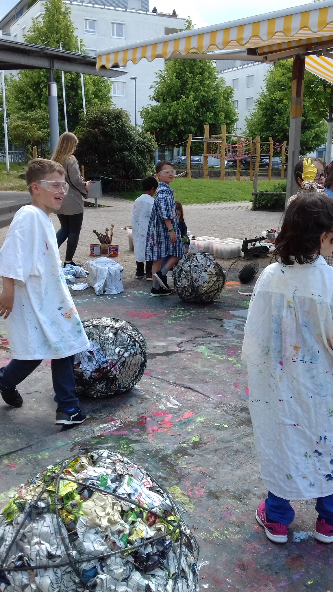 Das Kunstprojekt von Susanne Wadle und Horst Jonescu von Wolff war mindestens so spannend wie die WM selbst. Die kreativen Jungen und Mädchen gestalteten über fünf Tage gemeinsam sechs Betonkugeln. Sand, Zement und Wasser. Auf ein richtiges Mischverhältnis kam es dabei an! Interessiert verfolgten die Kinder den Entstehungsprozess der Kugeln – und das Tolle – alle Ferienkinder hatten die Möglichkeit hier mitzugestalten. Wer hat denn schon mal in seiner Kindheit Beton angemischt und auf einen Bauträger angebracht? Die Künstlerin Susanne Wadle und das Budget der Maria Montessori Schule Hausen als Kulturschule machten dies möglich. Auf diesem Wege nochmal 1000 Dank für das prächtige Engagement der Künstlerin.