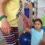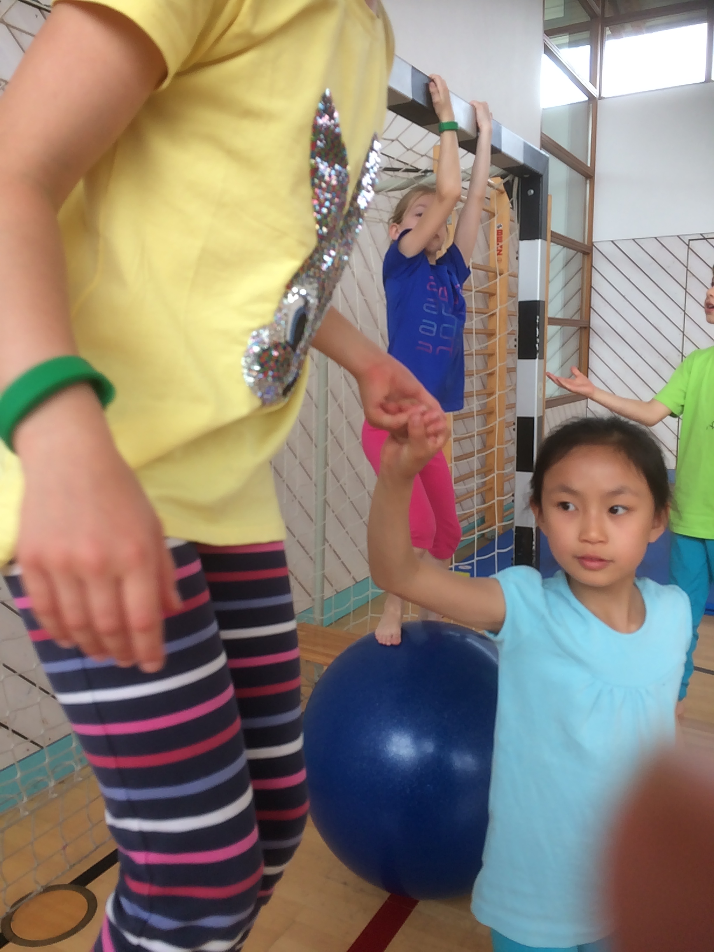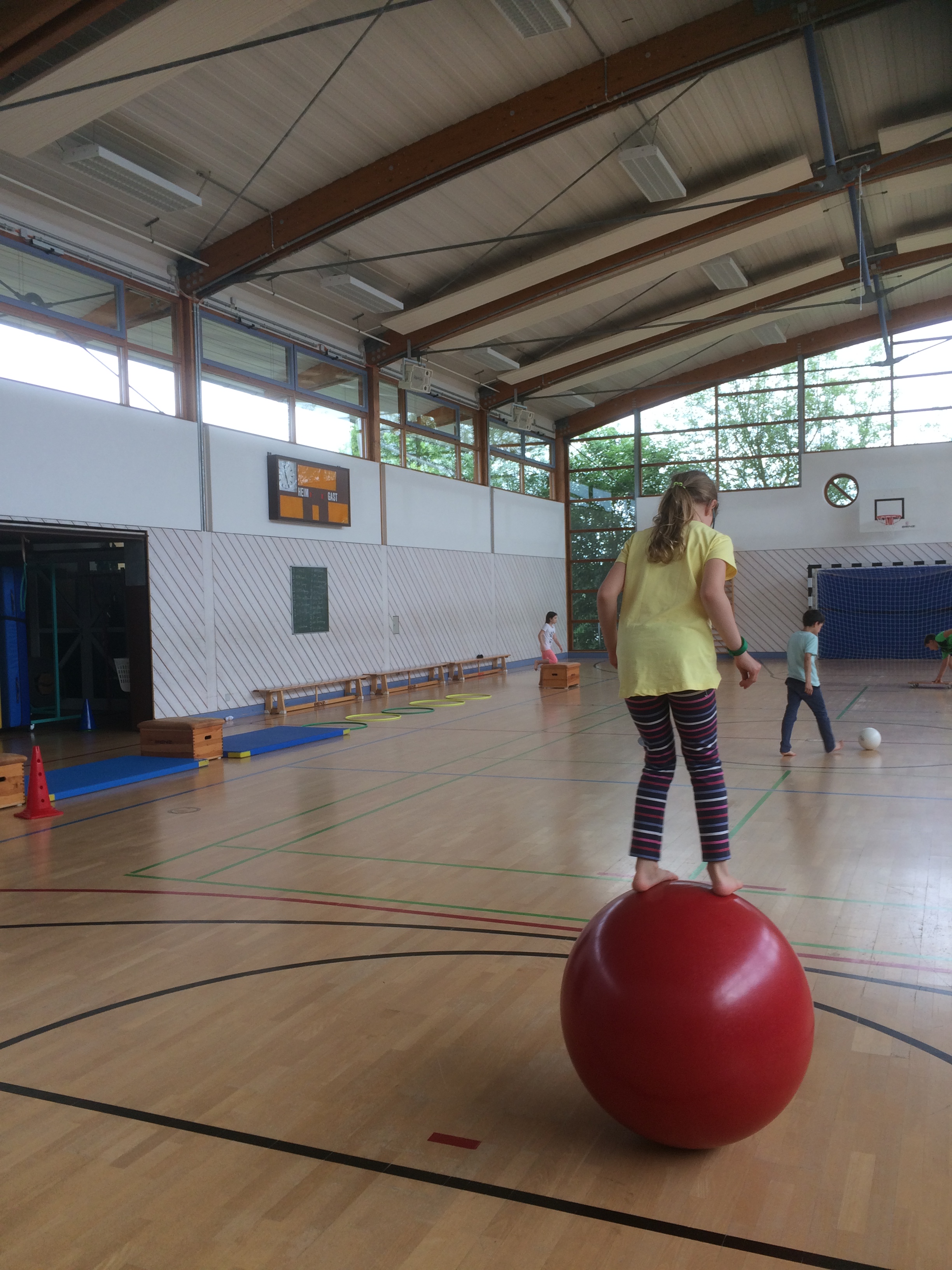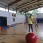 Artistisch wurde es im Laufkugelangebot. Um mit diesen laufen zu können, bedurfte es viel Koordination, Gleichgewicht und auch Mut, denn diese Kugeln sind schon ganz schön groß und somit hoch. Außerdem mussten die Akrobaten ja auch noch rückwärts laufen, so dass sich die Kugel dabei vorwärts bewegt. Einige Kinder standen zum ersten Mal auf dieser großen Artisten-kugel. Mit Hilfestellungen klappte es jedoch bei allen von Mal zu Mal besser. Es gab auch einige Laufkugelartisten und –Artistinnen, die sehr schnell alleine mit dieser Kugel in der Turnhalle liefen. Super, welch sportliche Kinder die MMGH hat.