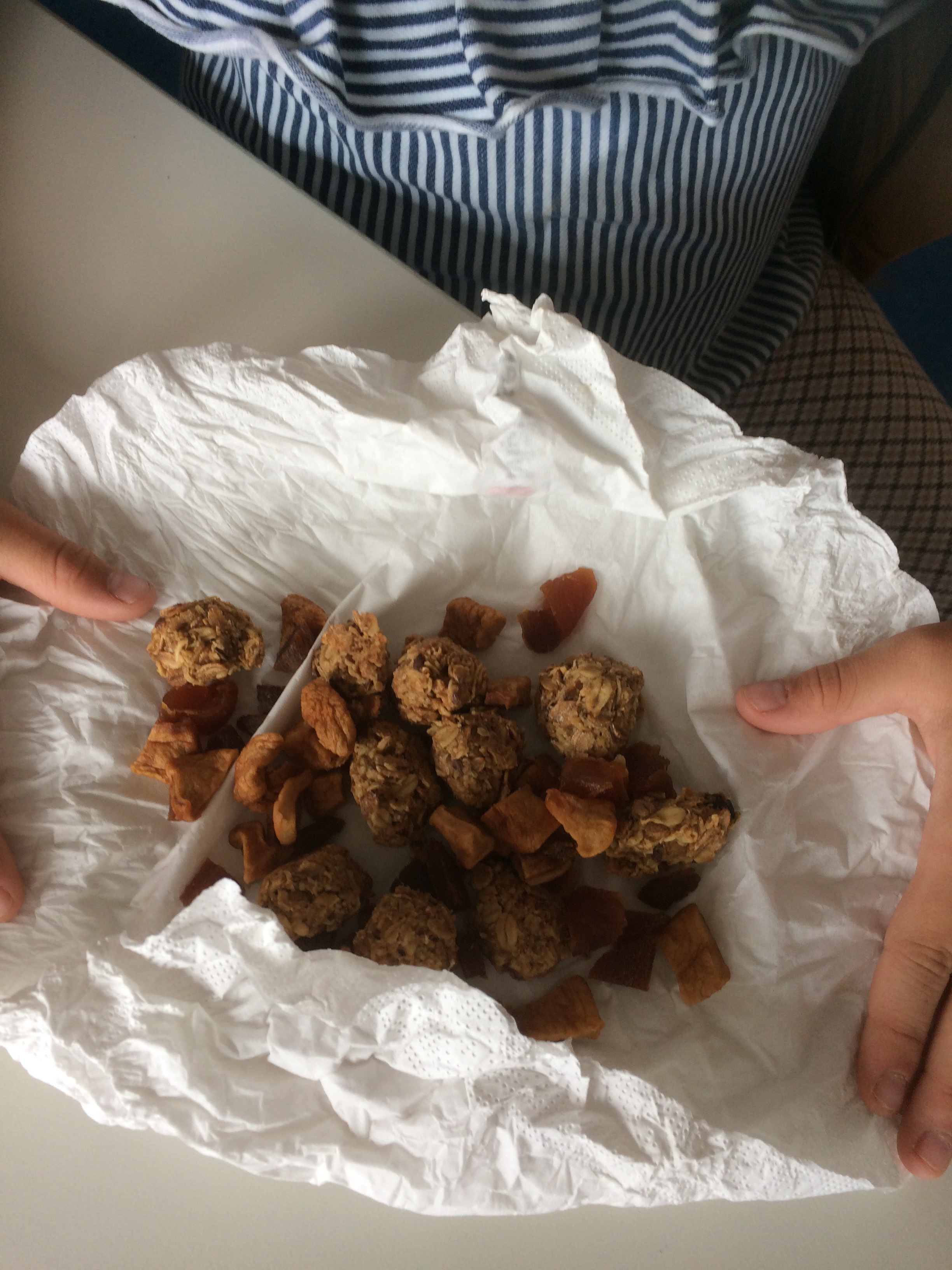 Aber auch das bei den Kindern immer beliebtere Backangebot durfte nicht fehlen. Leckere Energiekugeln wurden geformt. Macht sie euch doch auch mal! Das geht ganz einfach: Hafer-flocken im Backofen anrösten, diese dann mit Honig, Nüssen und Trockenobst nach Belieben vermischen. Nun zu Kugeln formen. Achtung, sagen euch die Kinder aus meinem Angebot, es wird schon an den Fingern kleben, also nicht zu viel Honig nehmen.