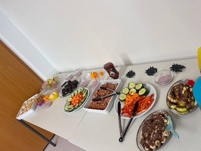 Am Mittwochvormittag haben die Kinder ein Grusel-Buffet für den Nachmittag vorbereitet. Darunter waren Gemüse-Teller, Schokobananen & Äpfel, Würstchen, die wie Finger aussahen, und ganz viel anderes.