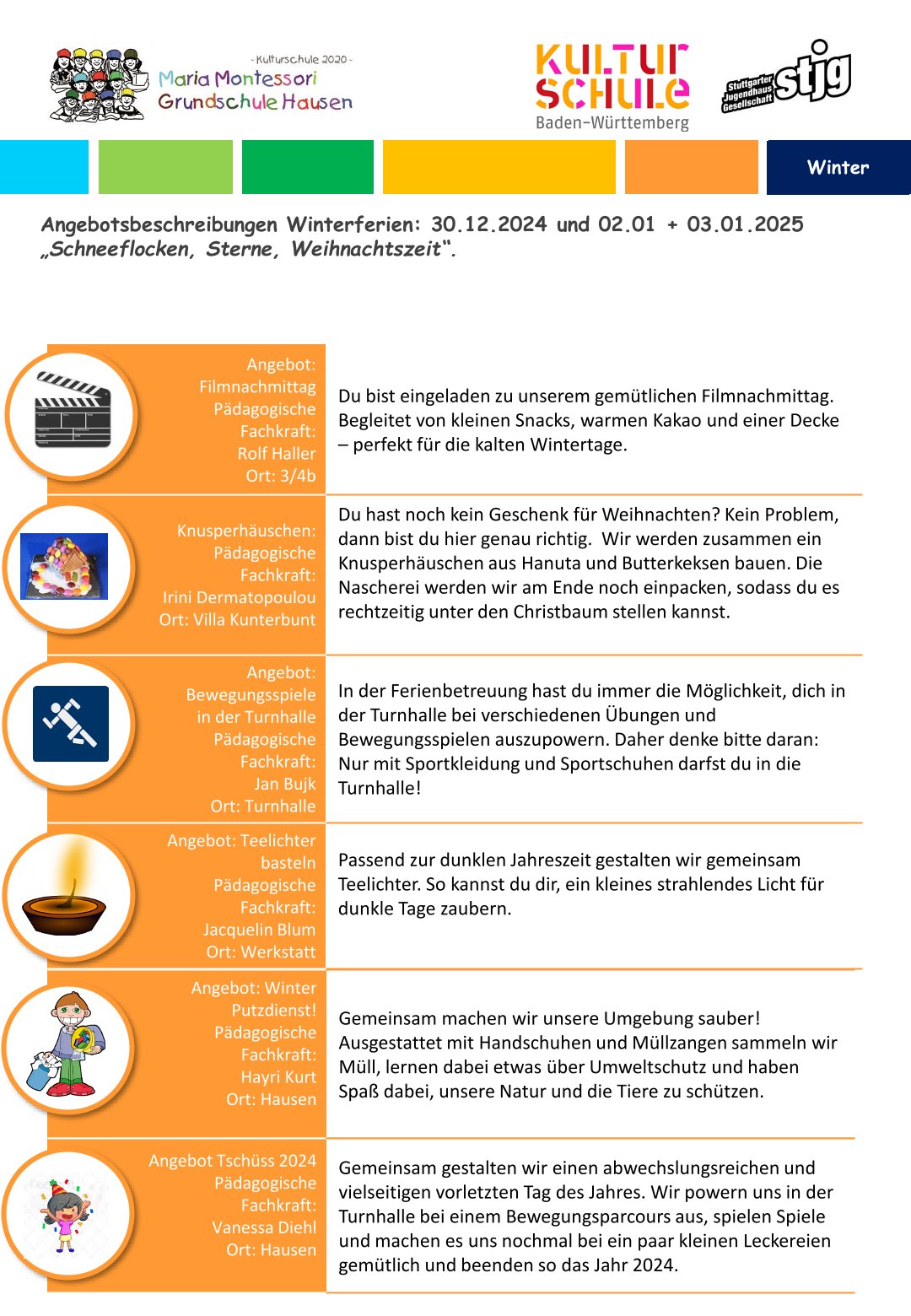 die Weihnachtsferien stehen vor der Tür und somit auch unser Ferienprogramm. Schaut selbst, was wir alles unternehmen.