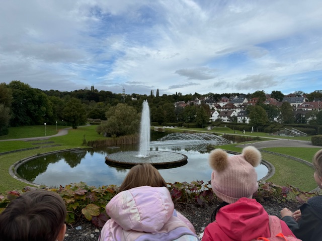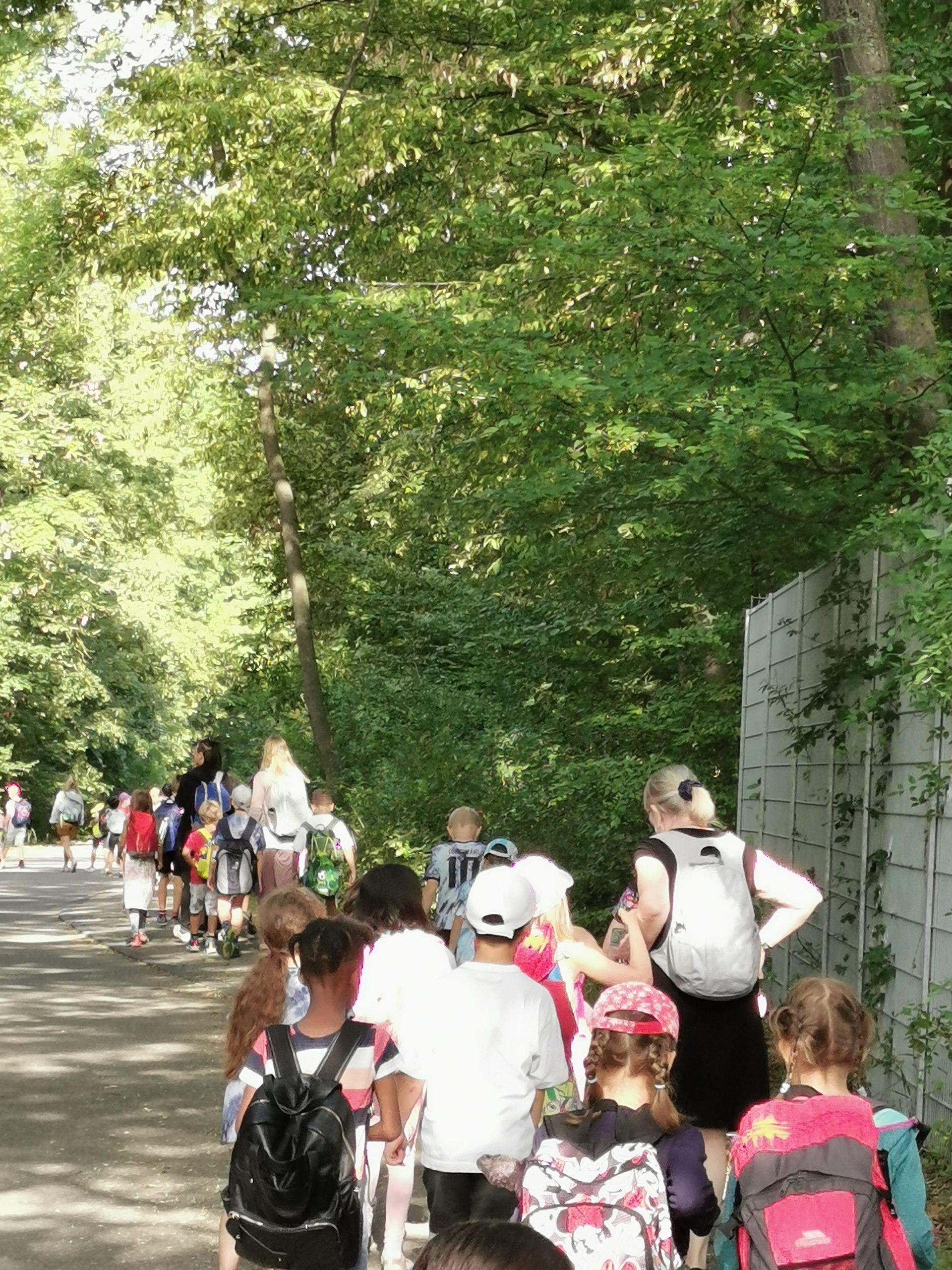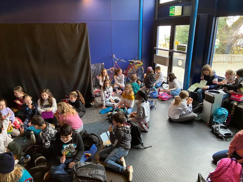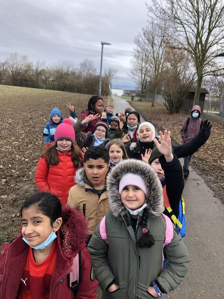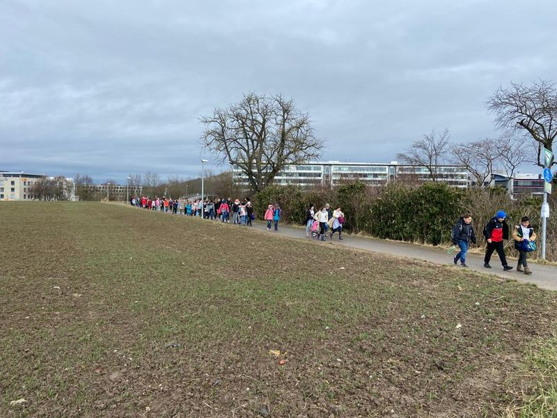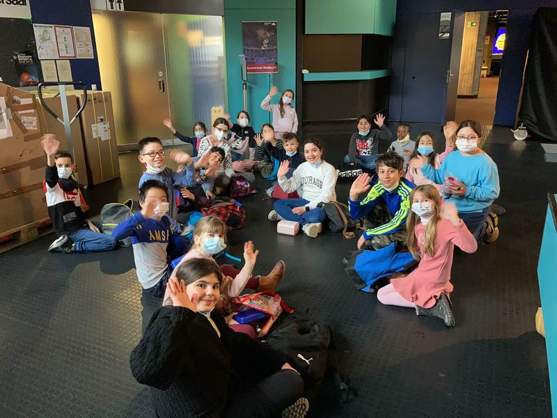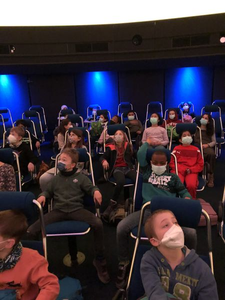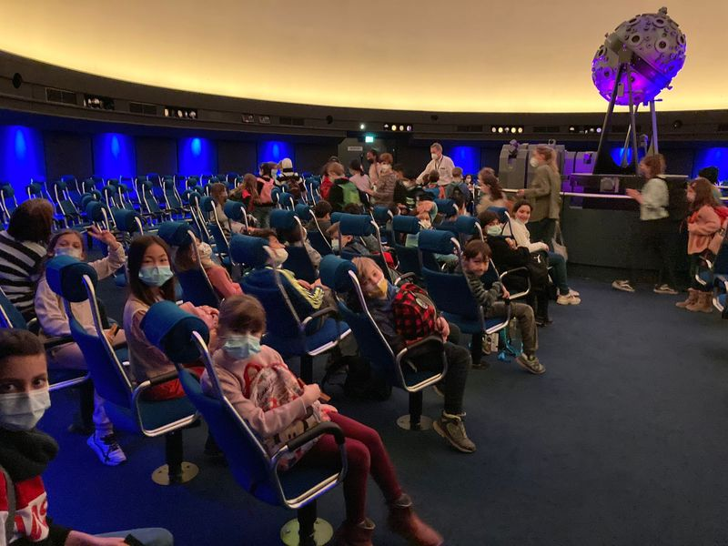 Doch am beeindruckendsten konnten unsere Planeten im Carl-Zeiss-Planetarium in Stuttgart präsentiert werden. Am 16.02.2022 brachen alle 3./4. Klassen in Richtung des Bahnhofs in Weilimdorf auf. Mit der S-Bahn ging es bis zum Hauptbahnhof nach Stuttgart und schließlich zu Fuß weiter Richtung Weltall. Angekommen am Planetarium stärkten sich die jungen Astronom*innen mit ihrem Vesper, bevor es in den großen Saal ging. Ein erstes Highlight waren die besonderen Stühle, die sich um 360 Grad wenden sowie nach hinten kippen ließen. Endlich war Kippeln in der Schule erlaubt. Das Programm „Das kleine 1×1 der Planeten“ begann. Wir wurden an Board einer Raumstation gebeamt und folgten den Astronauten auf den Mond. Weiter ging es zu den Planeten unseres Sonnensystems, doch immer aus sicherer Entfernung zur glühend heißen Sonne. Über den kleinsten Planet Merkur, den rostroten Planeten Mars und dem Eisriesen Uranus kamen wir nach einer Stunde wieder zurück zur Erde. Jeder Stern soll eine Sonne sein, die ein eigenes Sonnensystem mit Planeten bildet? Die unendlichen Weiten des Weltalls waren nun für die Kinder präsent und doch weiterhin unvorstellbar.