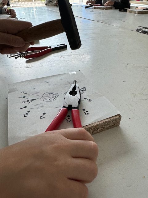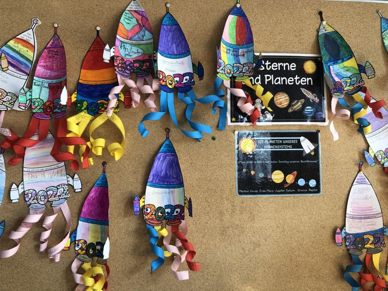 Nach einem abschließenden Gruppenfoto brachte die S-Bahn alle wieder Richtung Schulalltag. Doch auch zurück in Hausen erzählten und philosophierten die Kinder weiter über mögliches Leben auf anderen Planeten und den Mut der Astronauten im Weltall. Im Rahmen des Sachunterrichts wurden in den drauffolgenden Wochen weitere Themen zur Einheit „Weltraum“ bearbeitet. Noch einmal tauchten die Kinder ein, in die Welt der Raumfahrt. Die ersten Versuche mit Lebewesen im Weltall, wie der Straßenhündin Laika, die den Flug nicht überlebte, berührten die Kinder sehr. Der berühmte Spruch „Es ist ein kleiner Schritt für einen Menschen, aber ein großer Sprung für die Menschheit“ von Neil Armstrong, dem ersten Menschen auf dem Mond, konnten die kleinen Forscher*innen durch ihr bereits aufgebautes Wissen selbst erklären und nachvollziehen. Am Ende der Stunde blieb Zeit, um sich eine eigene kleine Rakete zu bauen, die durch den Luftstrom mithilfe eines Strohhalmes angetrieben wurde (im Freien, unter Berücksichtigung des Abstandsgebotes). In einer weiteren Stunde beschäftigten sich die Kinder mit den Sternbildern. Jedes Kind stickte sein Sternzeichen mithilfe eines gelben Fadens auf einen schwarzen Hintergrund. Weitere helle Punkte vervollständigten das Sternenbild. Den Abschluss bot der Film „Wie sieht die Welt im Weltraum aus“ aus der Reihe Willi wills wissen. Dieser fasste die besprochenen Inhalte mit anschaulichen, kindgerechten Bildern zusammen. Und was gibt es Besseres als eine Kinovorstellung im Klassenraum gemeinsam mit einem ausgiebigen Frühstück vor den wohlverdienten Faschingsferien?