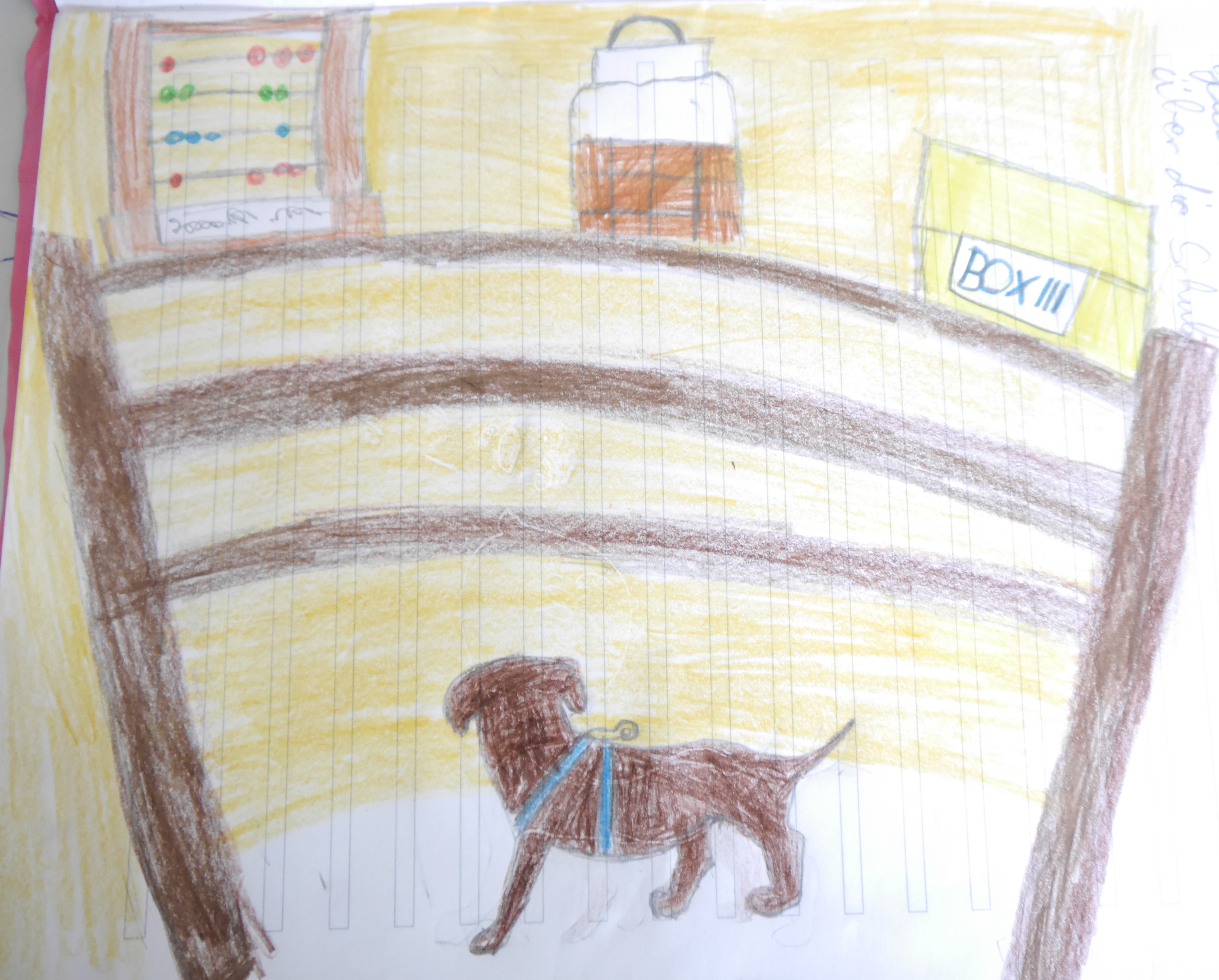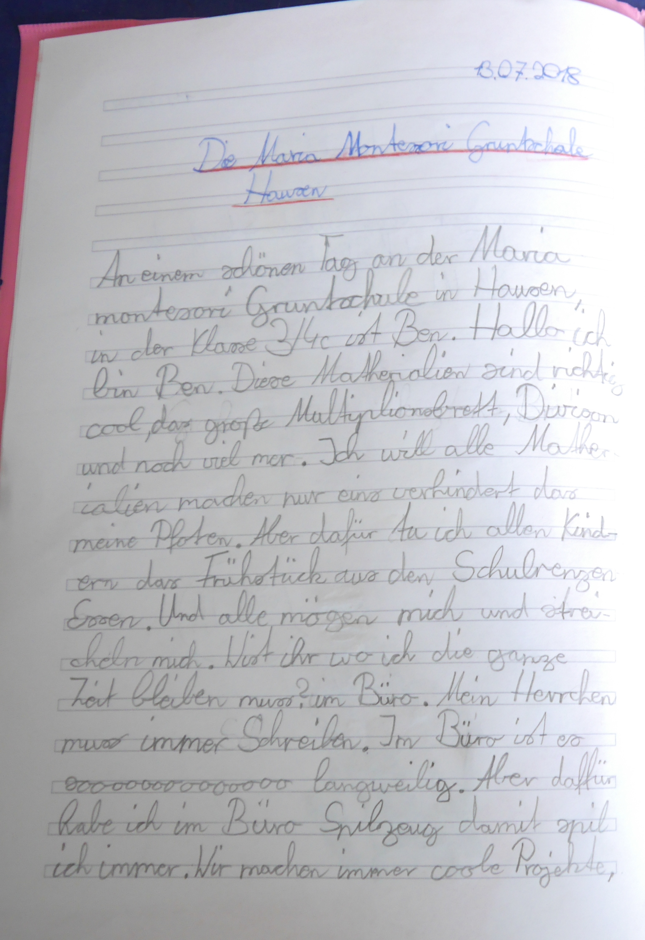 An einem schönen Tag an der Maria Montessori Grundschule Hausen in der Klasse 3/4 c ist Ben. „Hallo, ich bin Ben!“ Diese Materialien sind richtig cool! Das große Multiplikationsbrett, die große Division und noch viel mehr. Ich will alle Materialien machen, nur eins verhindert das: Meine Pfoten! Aber dafür esse ich allen Kindern das Frühstück aus dem Schulranzen weg. Und alle mögen mich trotzdem und streicheln mich. Wisst Ihr, wo ich die ganze Zeit bleiben muss? Im Büro! Mein Frauchen muss immer schreiben. Im Büro ist es soooooo langweilig. Aber dafür habe ich im Büro Spielzeug, damit spiele ich immer. Wir machen coole Projekte. Wenn ich ein Junge wäre, würde ich in diese Schule gehen. Liebe Leute, die ihr die Geschichte gelesen habt, ich hoffe, Euch hat die Geschichte gefallen.