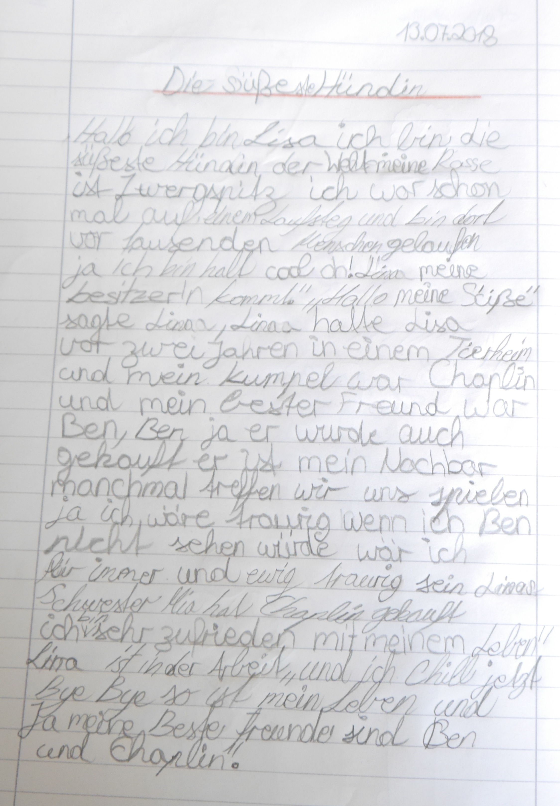 Hallo, ich in Lisa, ich bin die süßeste Hündin der Welt. Meine Rasse heißt Zwergspitz. Ich war schon einmal auf einem Laufsteg und bin dort vor tausenden Menschen gelaufen. Ja, ich bin halt cool, oh! Lina, meine Besitzerin kommt. „Hallo, meine Süße!“, sagt Lina. Lina hat Lisa vor zwei Jahren aus einem Tierheim geholt. Meine Kumpel sind Chaplin und mein bester Freund ist Ben. Ben, ja er wurde auch gekauft. Er ist mein Nachbar. Manchmal treffen wir uns und spielen. Ja, ich wäre traurig, wenn ich Ben nicht sehen würde. Ich wäre für immer und ewig traurig. Linas Schwester Mia hat Chaplin gekauft. Ich bin sehr zufrieden mit meinem Leben. Lina ist bei der Arbeit und ich chille jetzt. Bye, bye, so ist mein Leben und ja, meine besten Freunde sind Ben und Chaplin.