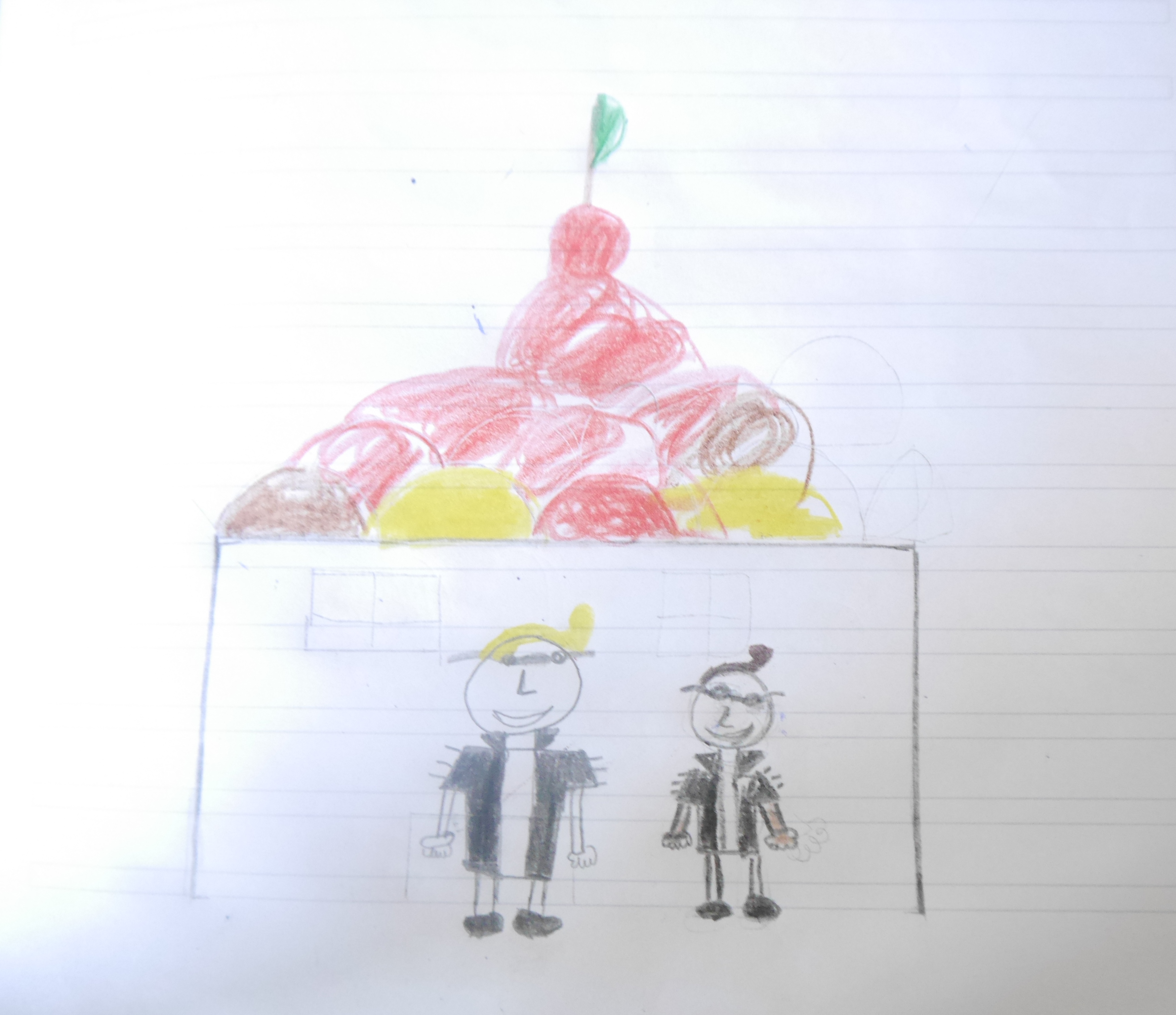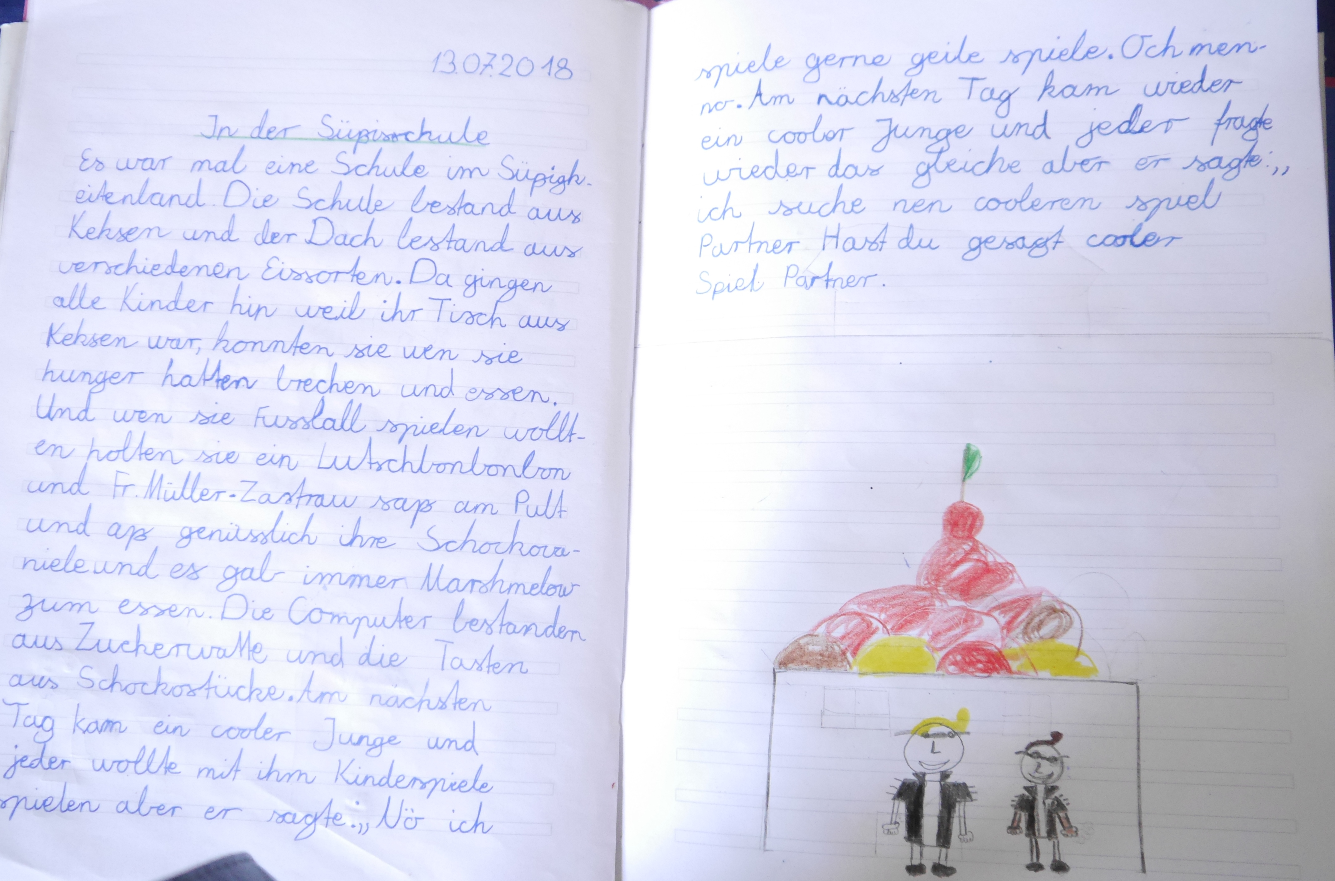 Es war einmal eine Schule im Süßigkeitenland. Die Schule bestand aus Keksen und das Dach bestand aus verschiedenen Eissorten. Da gingen alle Kinder hin. Weil ihr Tisch aus Keksen war, konnten sie, wenn sie Hunger hatten, etwas abbrechen und dann essen. Und wenn sie Fußball spielen wollten, holten sie ein großes Lutschbonbon. Frau Müller-Zastrau saß am Pult und aß genüsslich ihre Schokovanille und es gab immer Machmellows zum Essen. Die Computer bestanden aus Zuckerwatte und die Tasten aus Schokostückchen.
