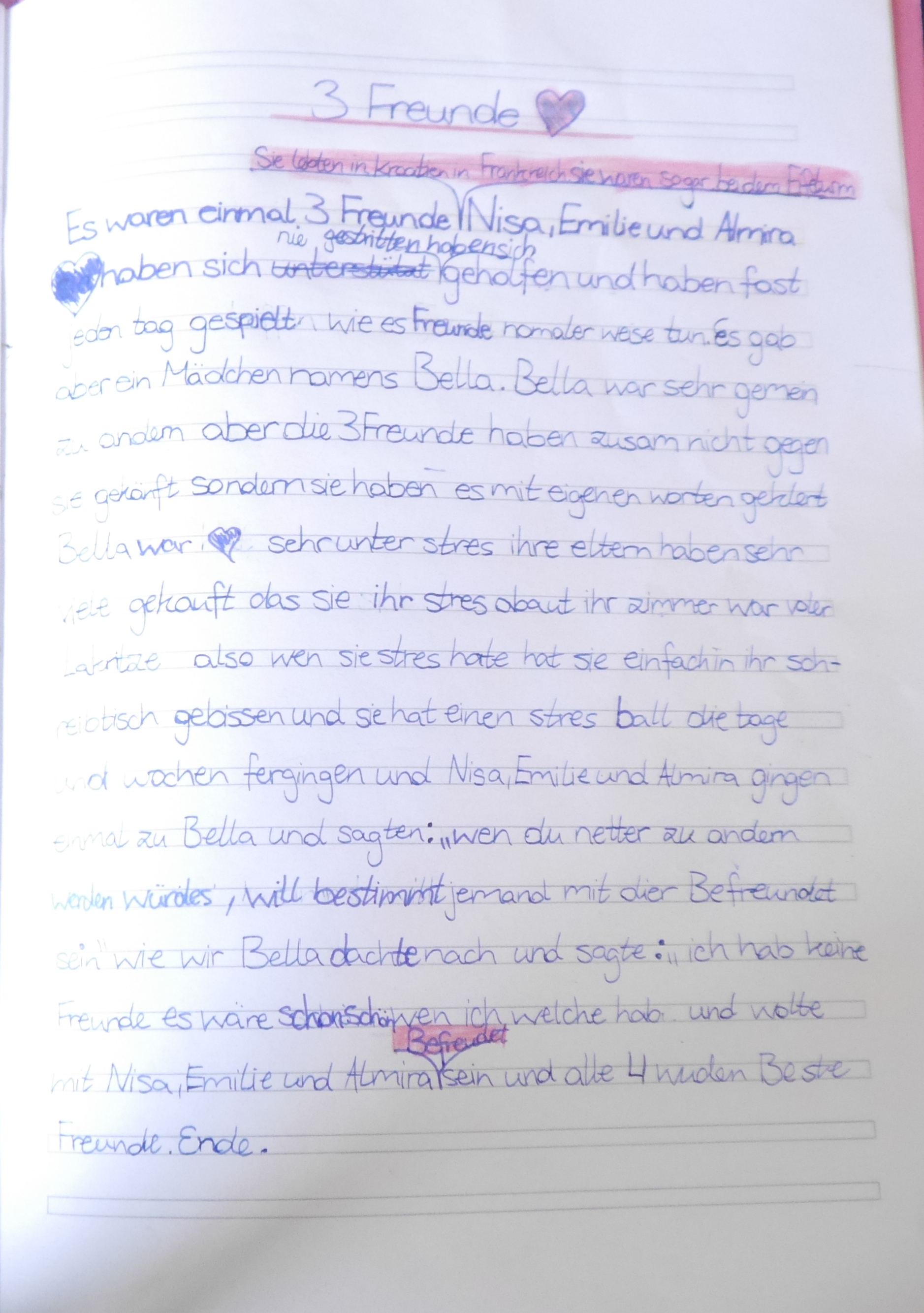 Es waren einma 3 Freunde. Sie lebten in Kroatien. Sie waren alle schon einmal in Frankreich und auf dem Eiffelturm. Nisa, Emilie und Almira haben sich nie gestritten, haben sich geholfen und haben fast jeden Tag gespielt, wie es Freunde normalerweise tun. Es gab aber ein Mädchen namens Bella. Bella war sehr gemein zu Anderen aber die 3 Freunde haben zusammen nicht gegen sie gekämpft sondern sie haben es mit eigenen Worten geklärt. Bella war sehr unter Stress. Ihre Eltern haben sehr viel gekauft, damit sie ihren Stress abbaut. Ihr Zimmer war voller Lakritze. Also wenn sie Stress hatte, hat sie einfach in ihren Schreibtisch gebissen und sie hatte einen Stressball. Die Tage und Wochen vergingen und Nisa, Emilie und Almira gingen einmal zu Bella und sagten: „Wenn du netter zu Anderen werden würdest, würde bestimmt jemand wie wir mit dir befreundet sein!“ Bella dachte nach und sagte: „Ich hab‘ keine Freunde. Es wäre schön, wenn ich welche hätte und wollte mit Nisa, Emilie und Almira befreundet sein und alle 4 wurden beste Freunde.