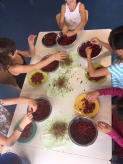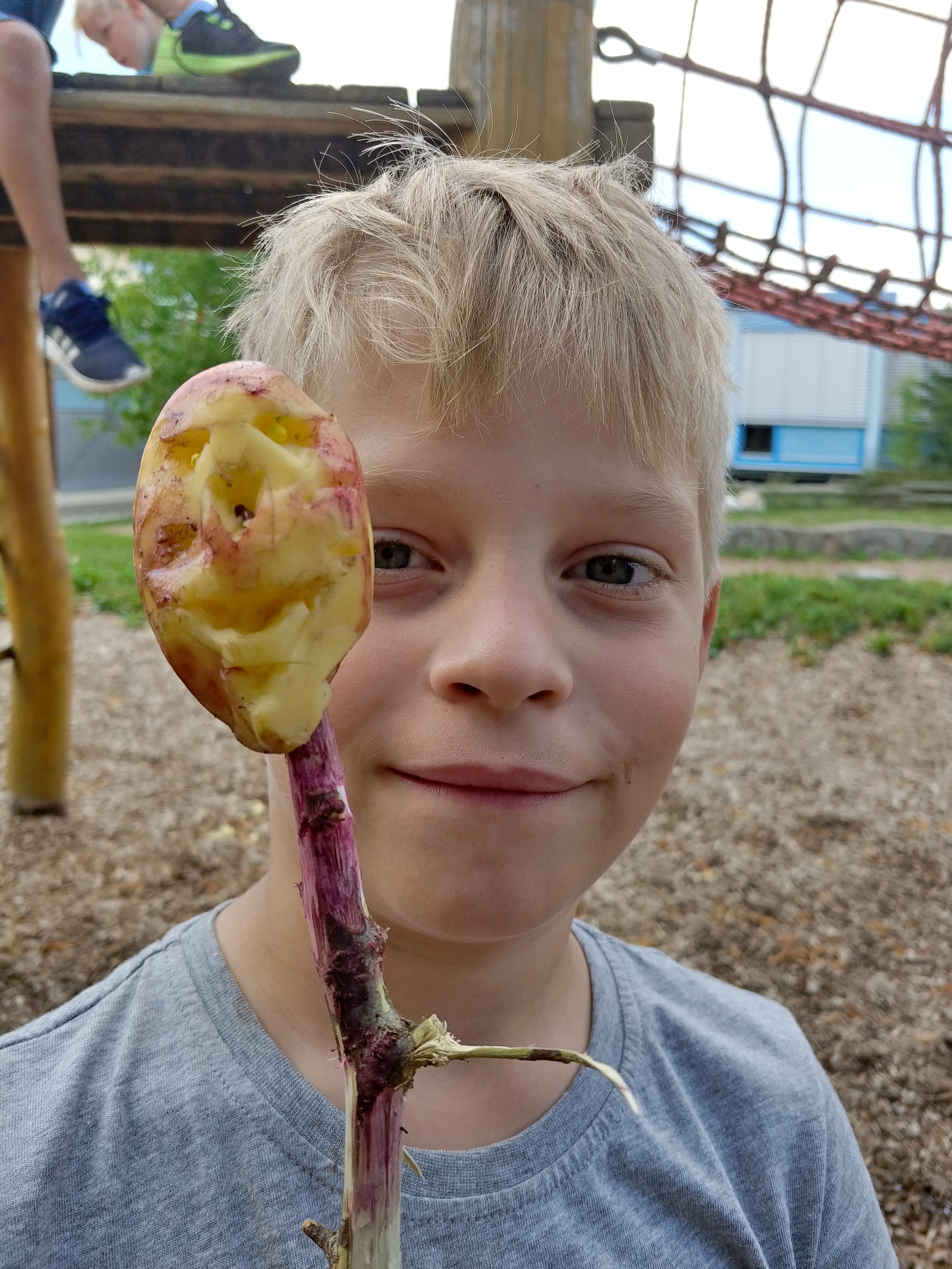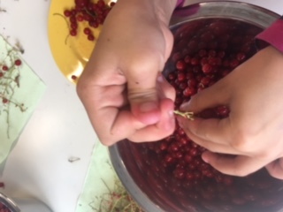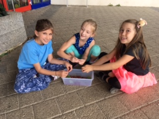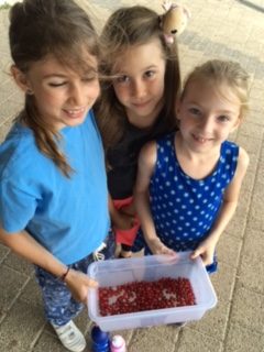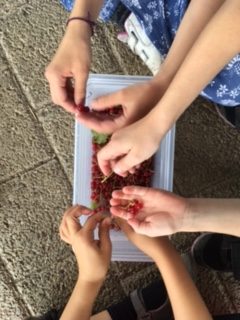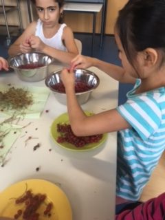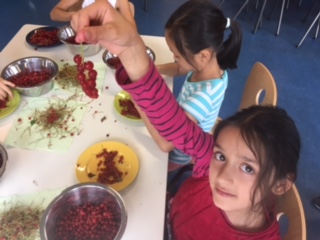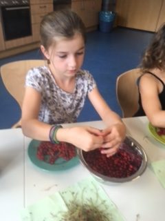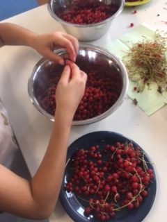 Und Ende Juni ist die Zeit für Johannisbeeren. Dann hängen unsere Sträucher vor dem Pavillon voll mit glänzend roten, säuerlichen, kugeligen Früchten. Gerne werde diese in den Pausen von den Kindern genascht, aber wer Lust auf diese Leckerei hat, muss sich beeilen, denn die Vögel beteiligen sich gern beim Pflück-Wettbewerb. Und manchmal sind sie – ehe man sich versieht – die Sieger! Aber in diesem Jahr waren wir schneller und haben gemeinsam mit den Kindern in den Pausen, in der Koch-AG und in der Spätbetreuung fleißig die Beeren gepflückt, haben sie vorsichtig von ihren Stängeln befreit und die ersten Gläser Marmelade gekocht.