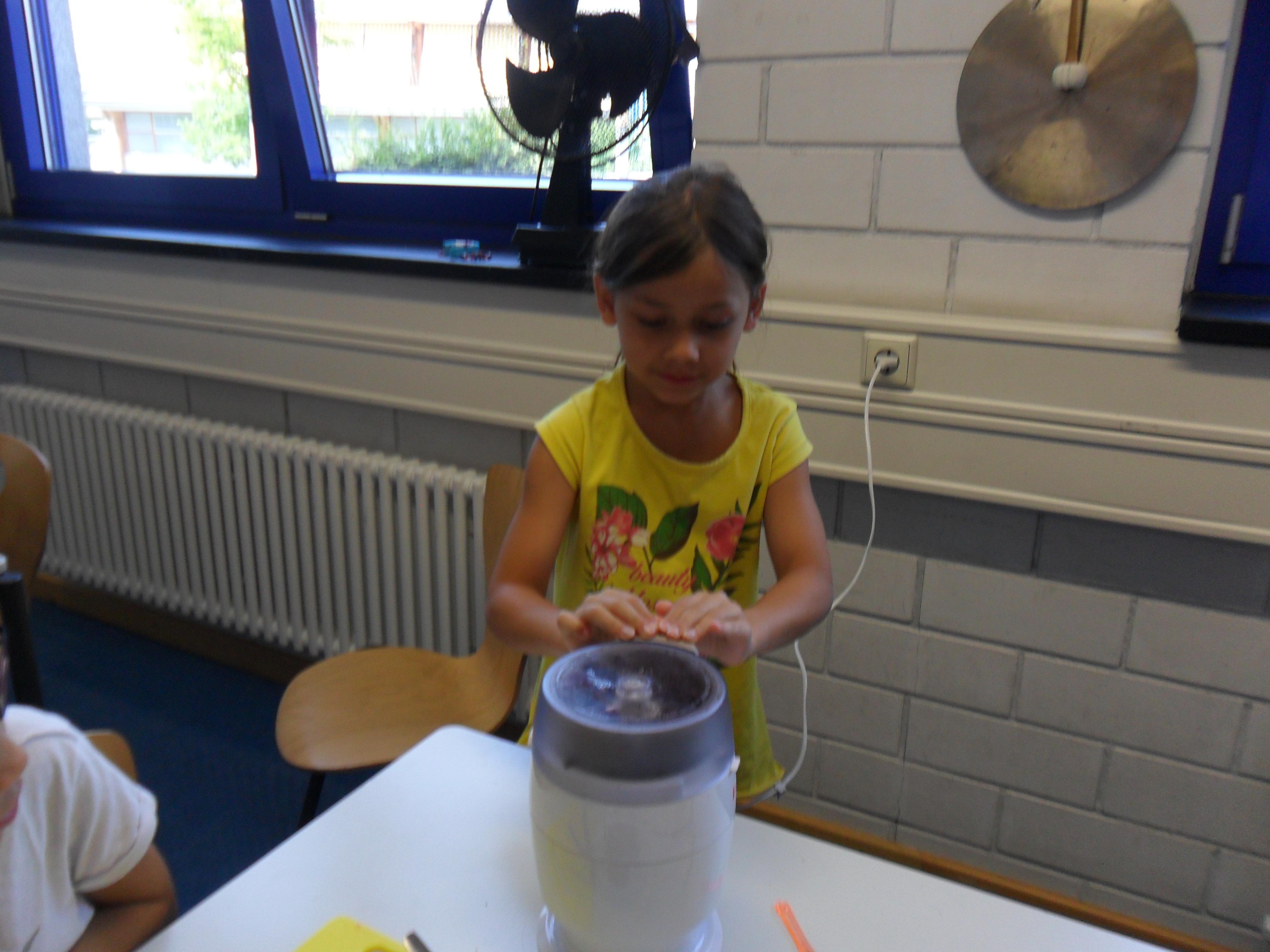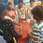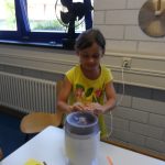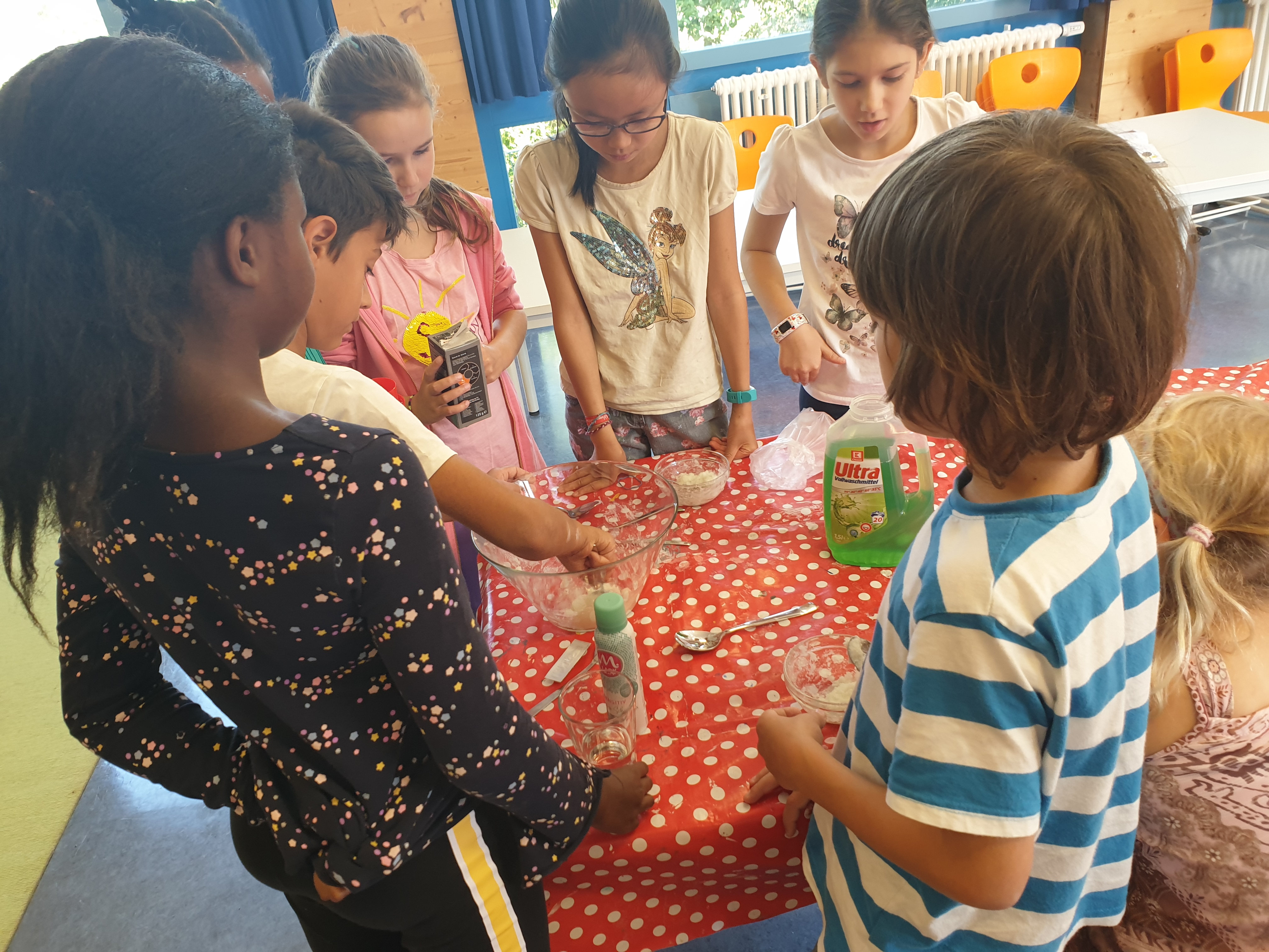 In einem anderen Angebot stellten die Schüler und Schülerinnen ihre eigenen Flummis her, denn das Spielen damit macht nicht nur Spaß, sondern fördert auch die Motorik und die Koordination. Zur Herstellung vermischten die Ferienkinder zunächst Silikon und Speisestärke zu einer teigartigen Masse. Die Herausforderung bestand hierbei darin, die Komponenten zu mischen, ohne dass alles an den Handschuhen kleben blieb. Trotzdem gelang es allen Kindern, eine Rohmasse zu erstellen, die es im Anschluss individuell zu gestalten galt. Hierzu nutzten die Kinder Lebensmittelfarbe und vermischten sie mit ihrer Rohmasse. So entstanden die verschiedensten bunten kleinen Kugeln. Nachdem die Masse getrocknet war, konnten die Flummis auf ihre Sprungfähigkeit getestet und dann gespielt werden.
