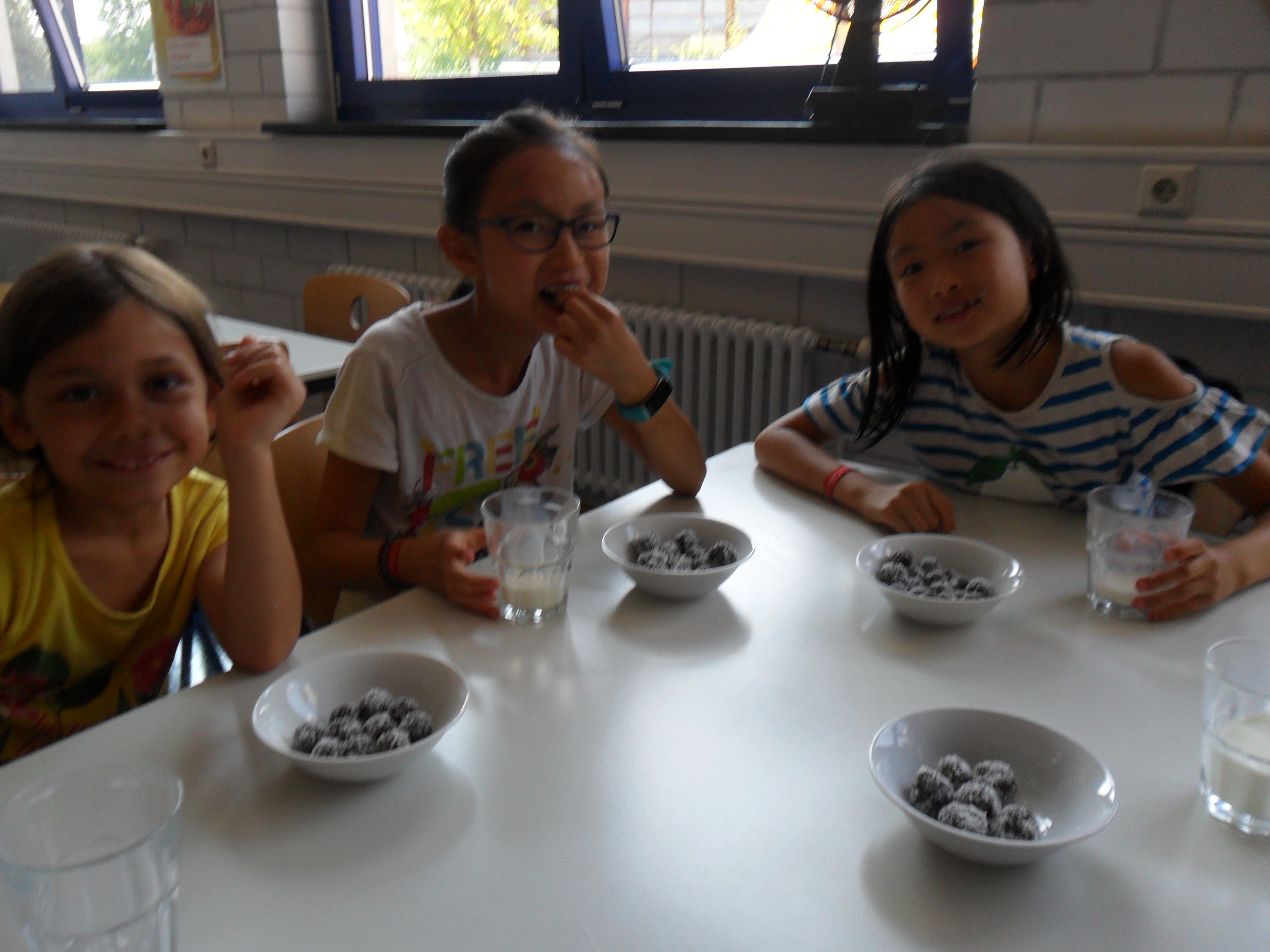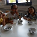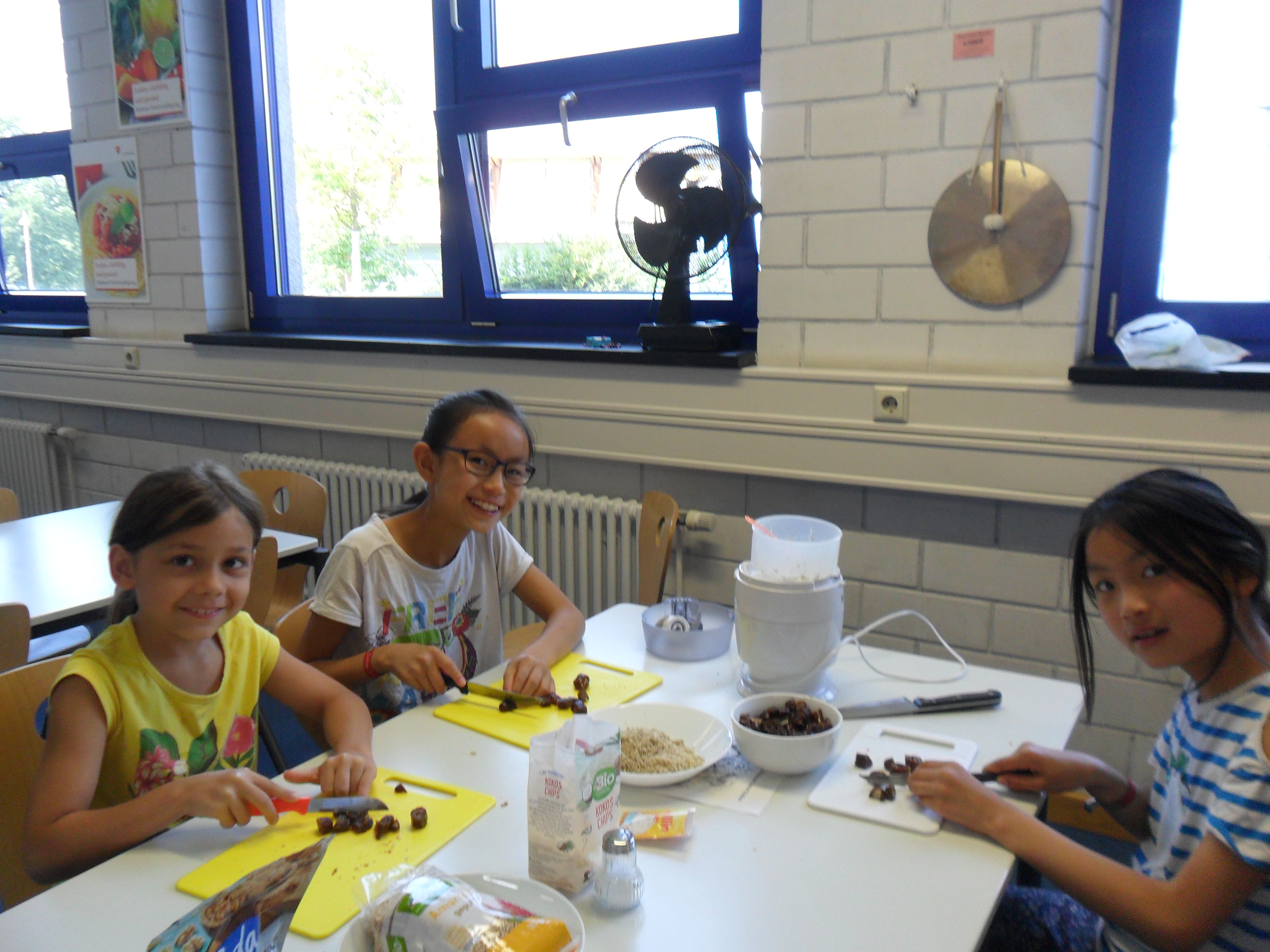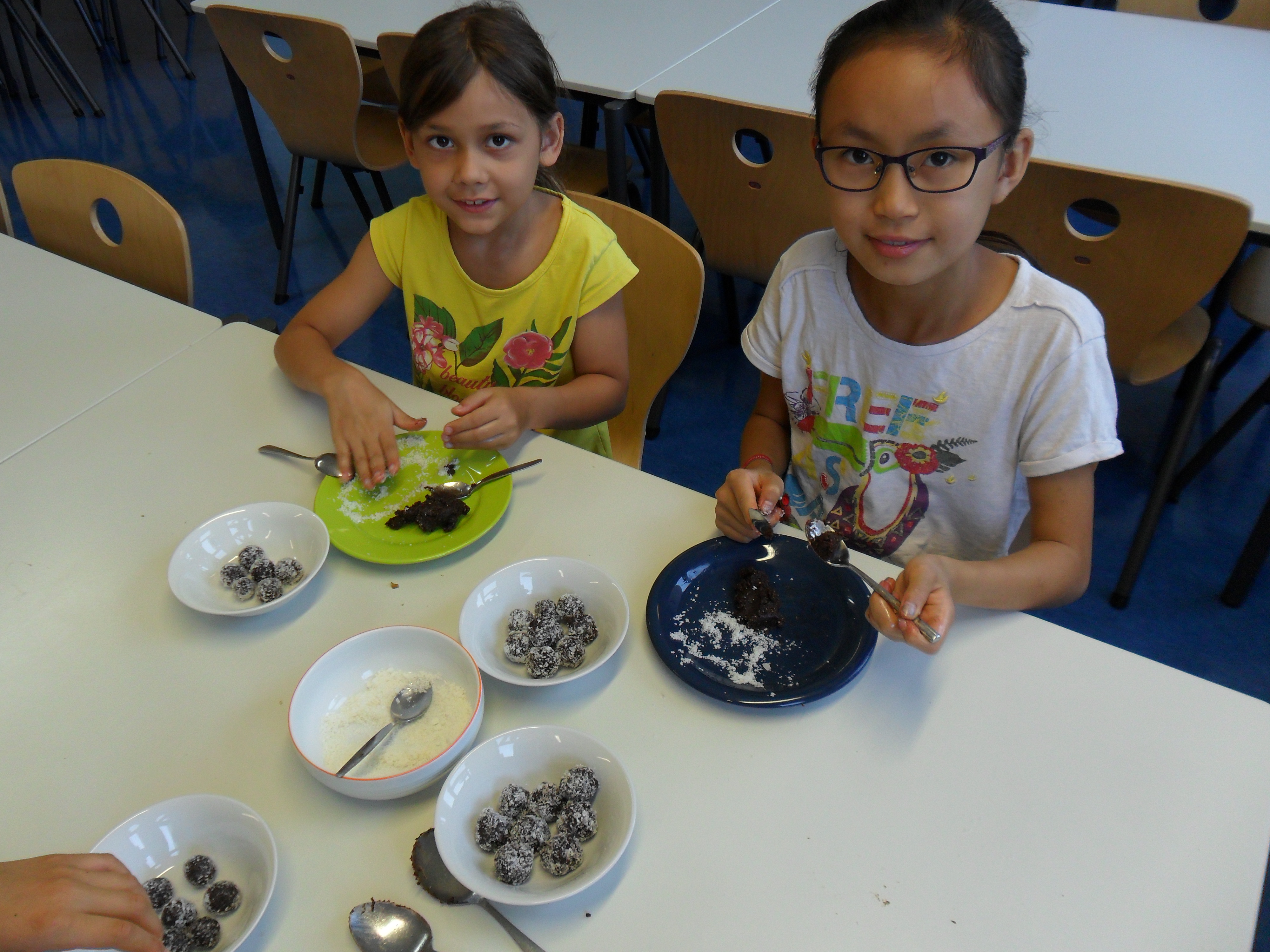 Schmackhaft ging es beim Angebot Energiebällchen zu. Mit Freude und Fleiß schnitten die Kinder alle Zutaten klein, die als Grundlage der Bällchen diente. Anschließend wählten die Kinder ihre Zutaten aus einem Angebot frei aus und kreierten aus unterschiedlichen Zusammensetzungen verschiedene Geschmacksrichtungen. So konnten je nach Geschmack verschiedene Zutaten vermischt und eigene Rezeptideen verwirklicht werden. Selbstbewusst vermischten die Kinder Verschiedenes miteinander und kosteten anschließend die süßen Häppchen. Die strahlenden Augen der Kinder bewiesen, wie lecker es allen geschmeckt hat.